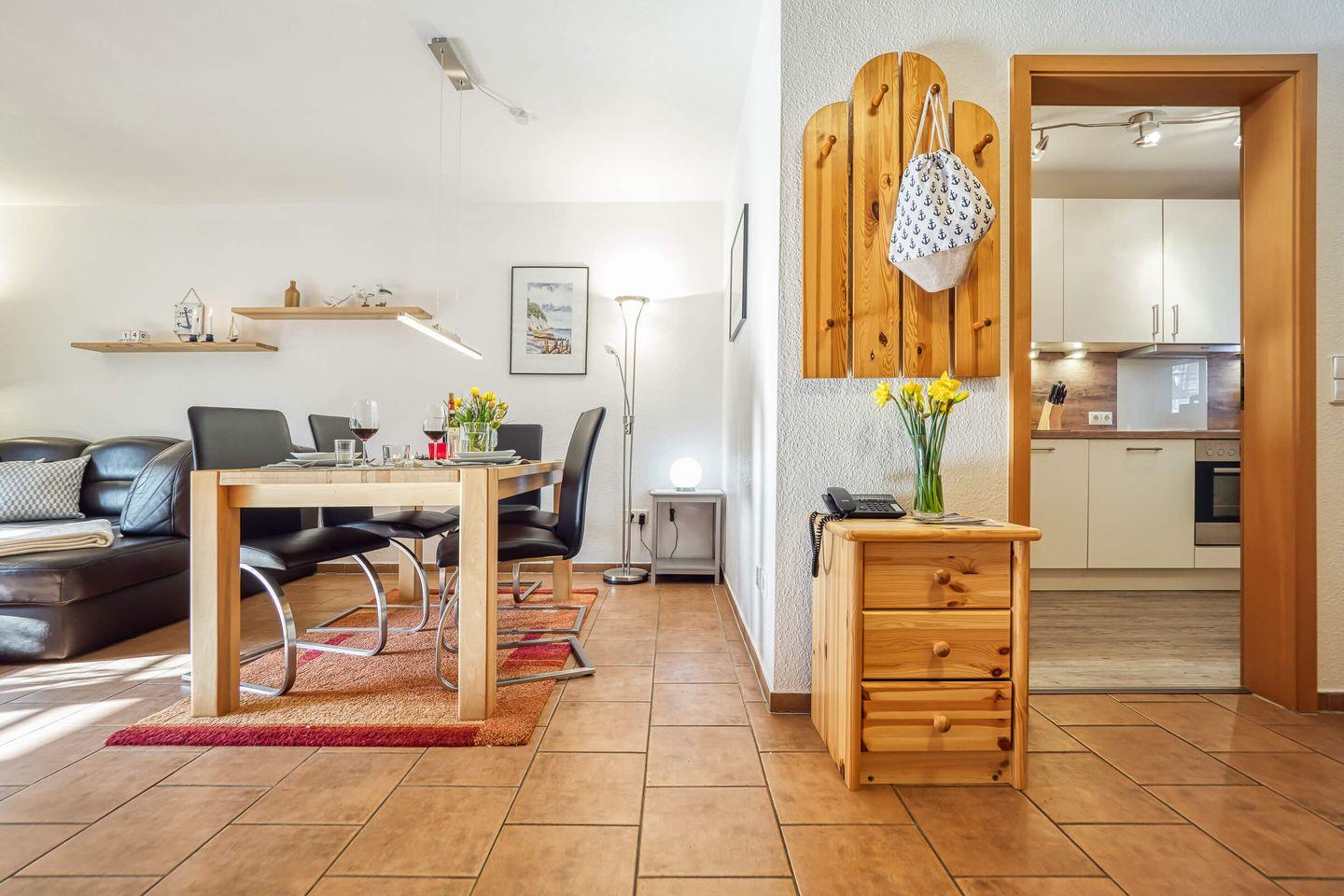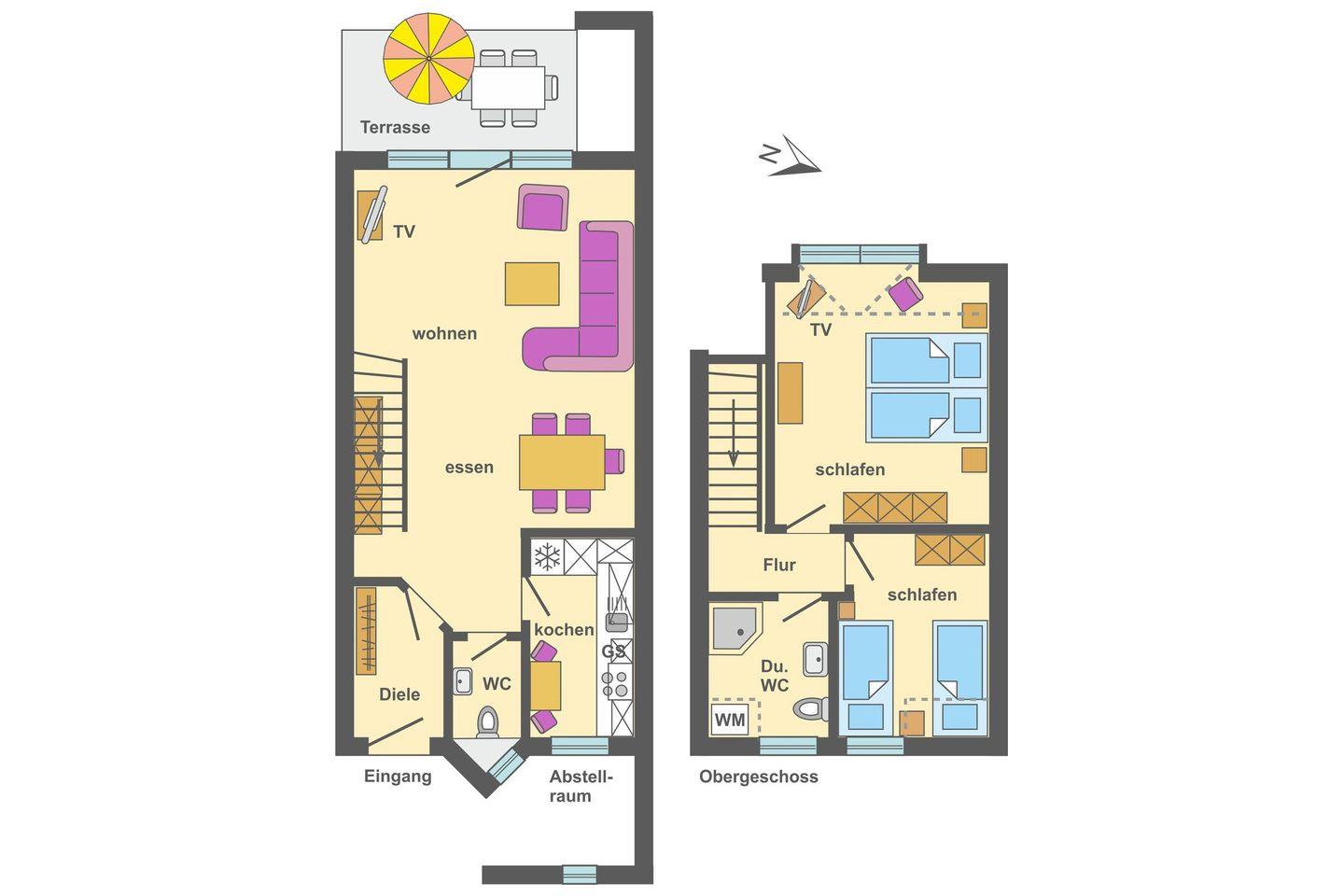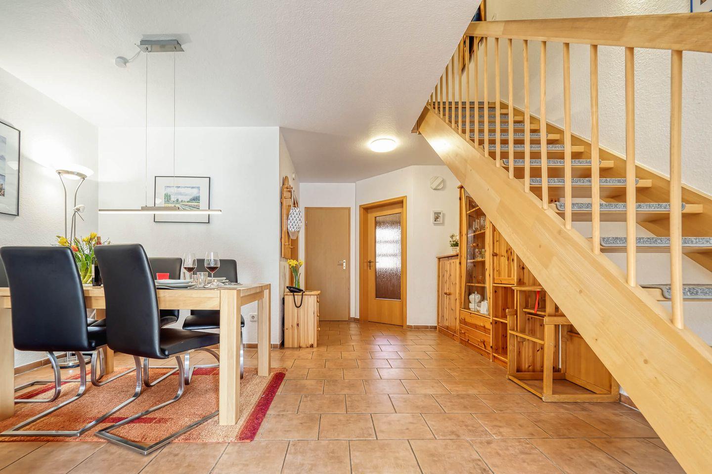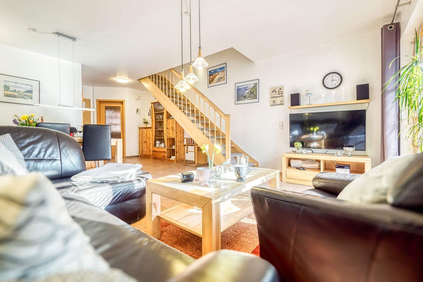 Im Erdgeschoss lädt der gemütliche Wohnbereich mit Sofa, TV und DVD-Player zum Ausspannen ein. Am Esstisch finden bis zu vier Personen bequem Platz. Vom Wohnbereich aus gelangen Sie direkt auf die möblierte Terrasse – ideal für ein Frühstück in der Morgensonne oder einen Grillabend mit der Familie.