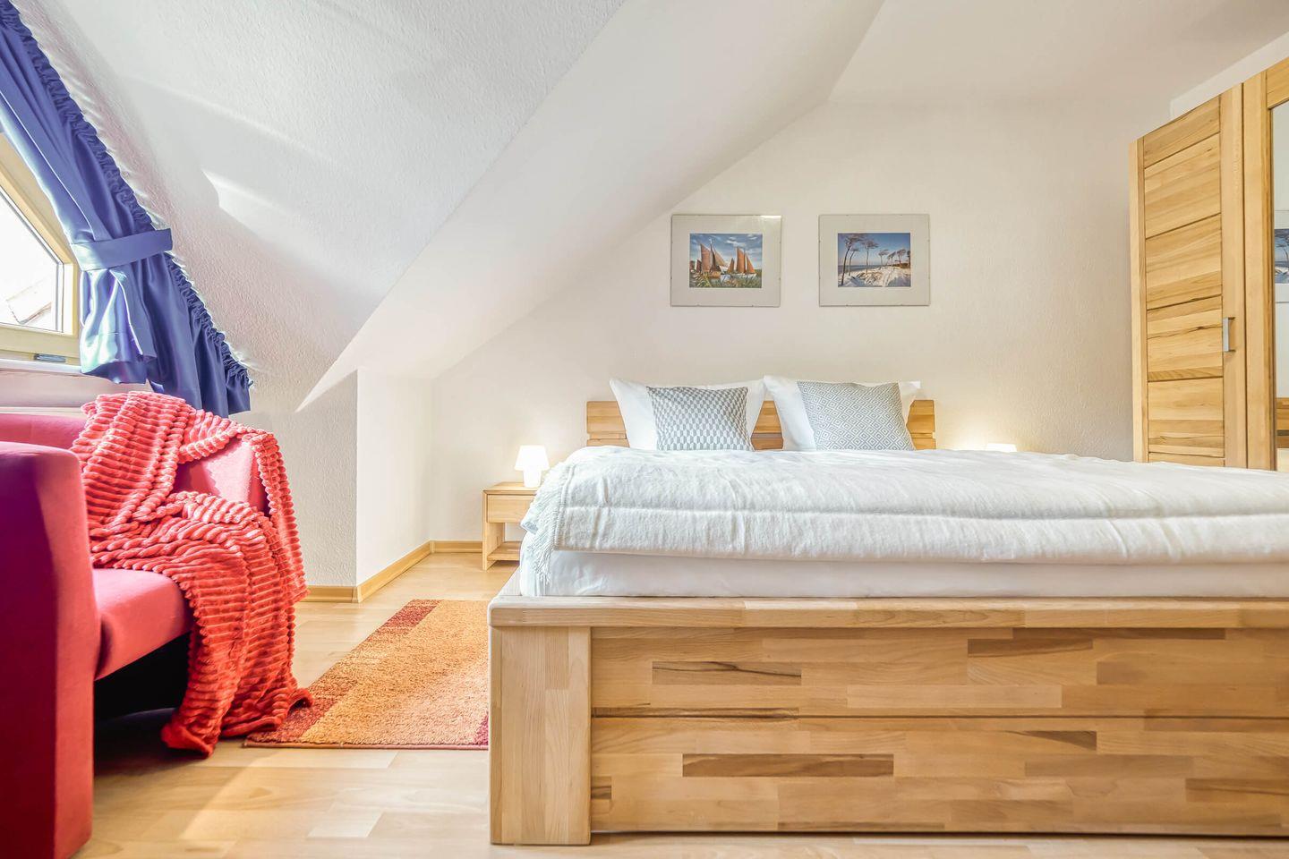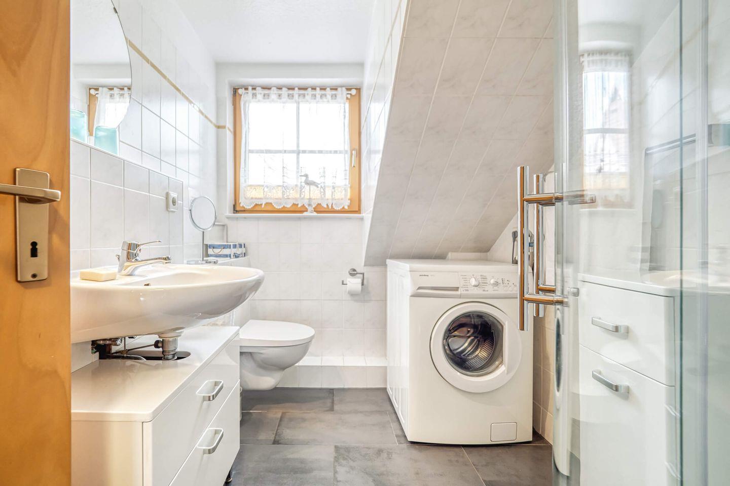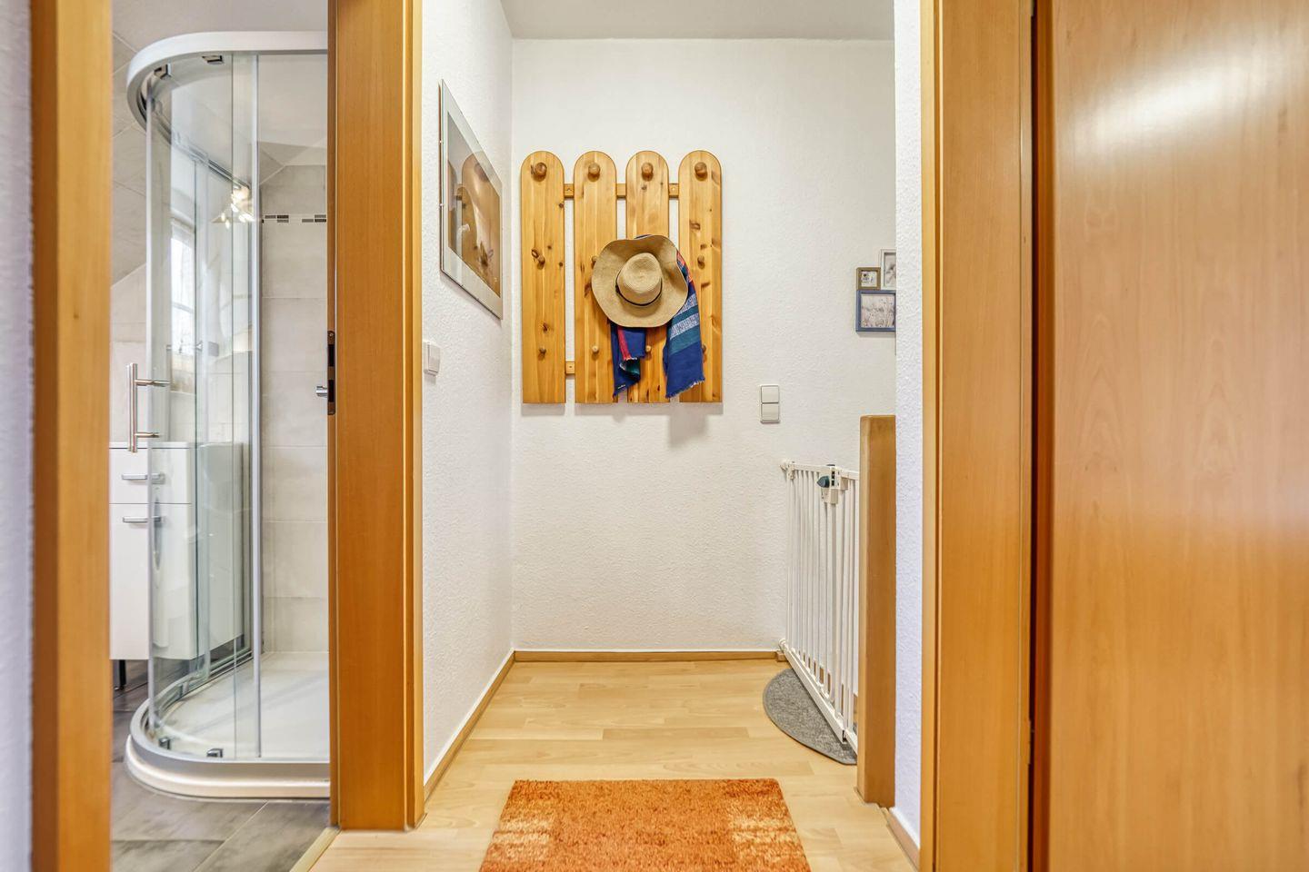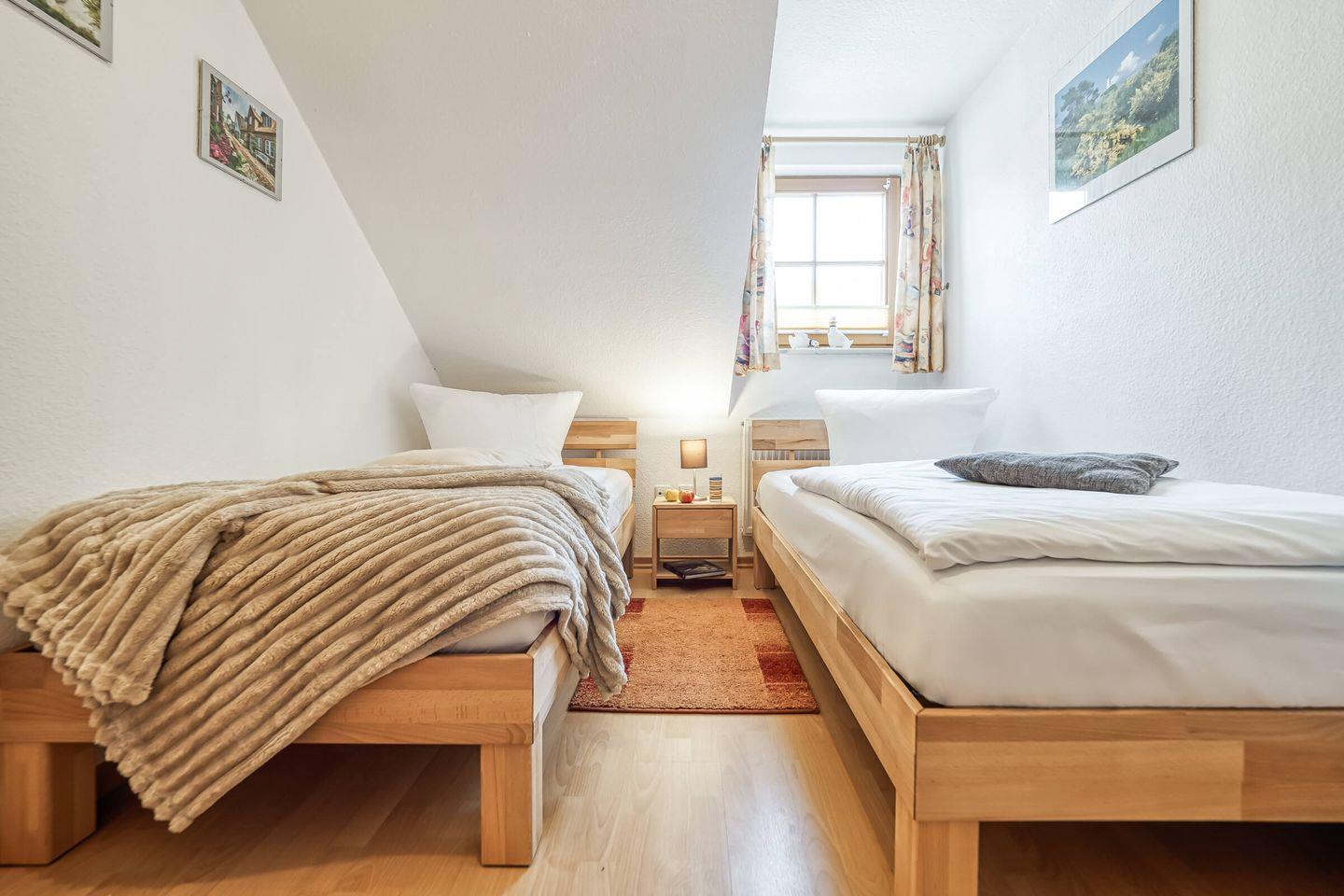 Im Obergeschoss erwarten Sie zwei Schlafzimmer – eines mit Doppelbett (2 Matratzen je 90×200?cm), das andere mit zwei Einzelbetten – sowie ein modernes Bad mit Dusche, Waschbecken, WC und Waschmaschine.