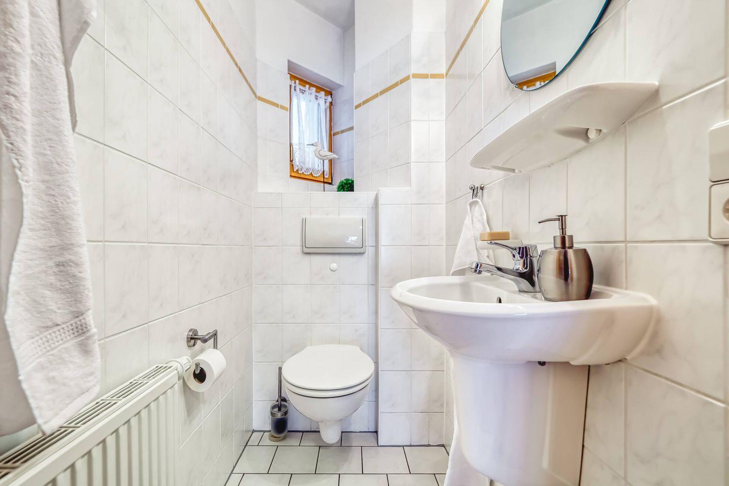 Die offene Küche ist bestens ausgestattet: Herd, Backofen, Mikrowelle, Kühlschrank mit Gefrierfach, Dunstabzugshaube und Geschirrspüler lassen keine Wünsche offen. Ein separates Gäste-WC sowie ein praktischer Garderobenbereich befinden sich ebenfalls im Erdgeschoss.