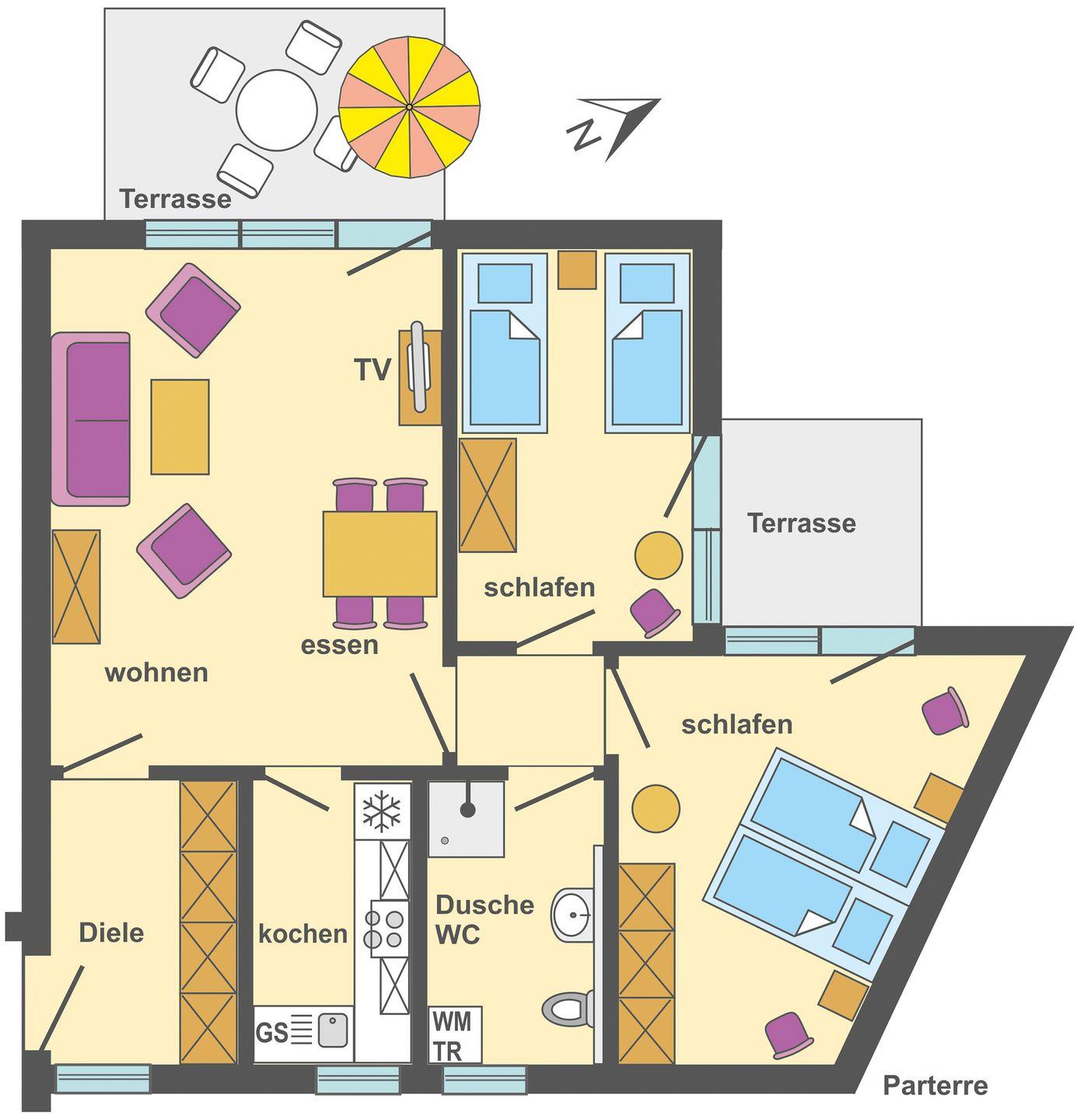 Sie planen Ferien mit Hund am Meer? Dann ist die 70?m² große Wohnung Störtebeker im Ferienpark Freesenbruch die ideale Wahl. Die komfortable Erdgeschosswohnung bietet zwei möblierte Terrassen, ein helles Wohnzimmer mit gemütlicher Sitzecke, zwei separate Schlafzimmer (ein Doppelbett, zwei Einzelbetten) sowie eine voll ausgestattete Küche mit Geschirrspüler, Backofen und Mikrowelle.