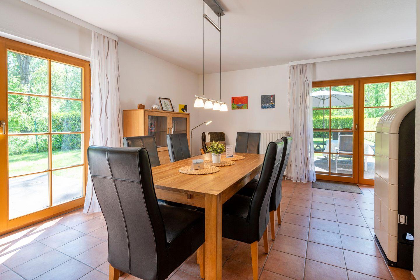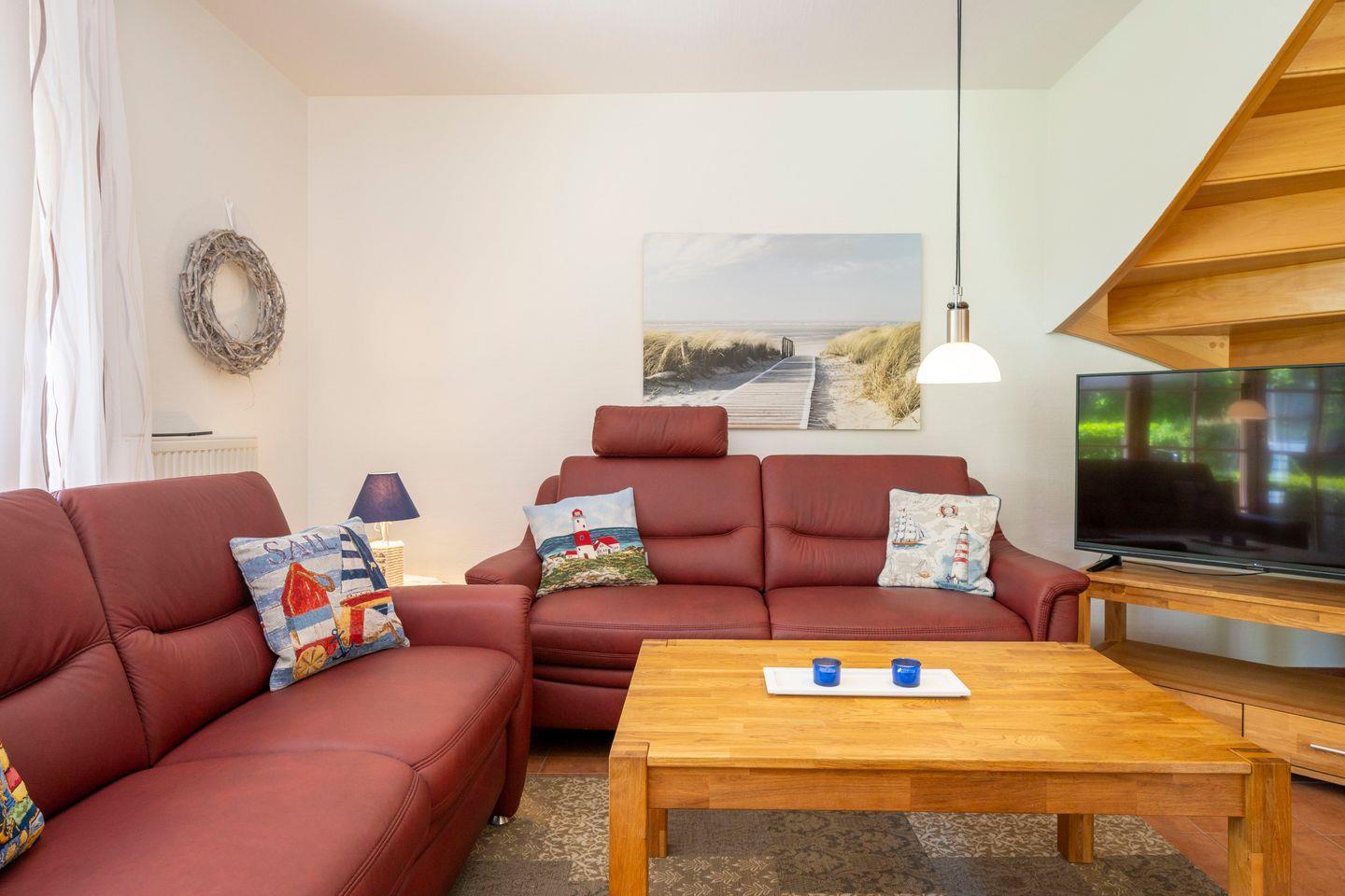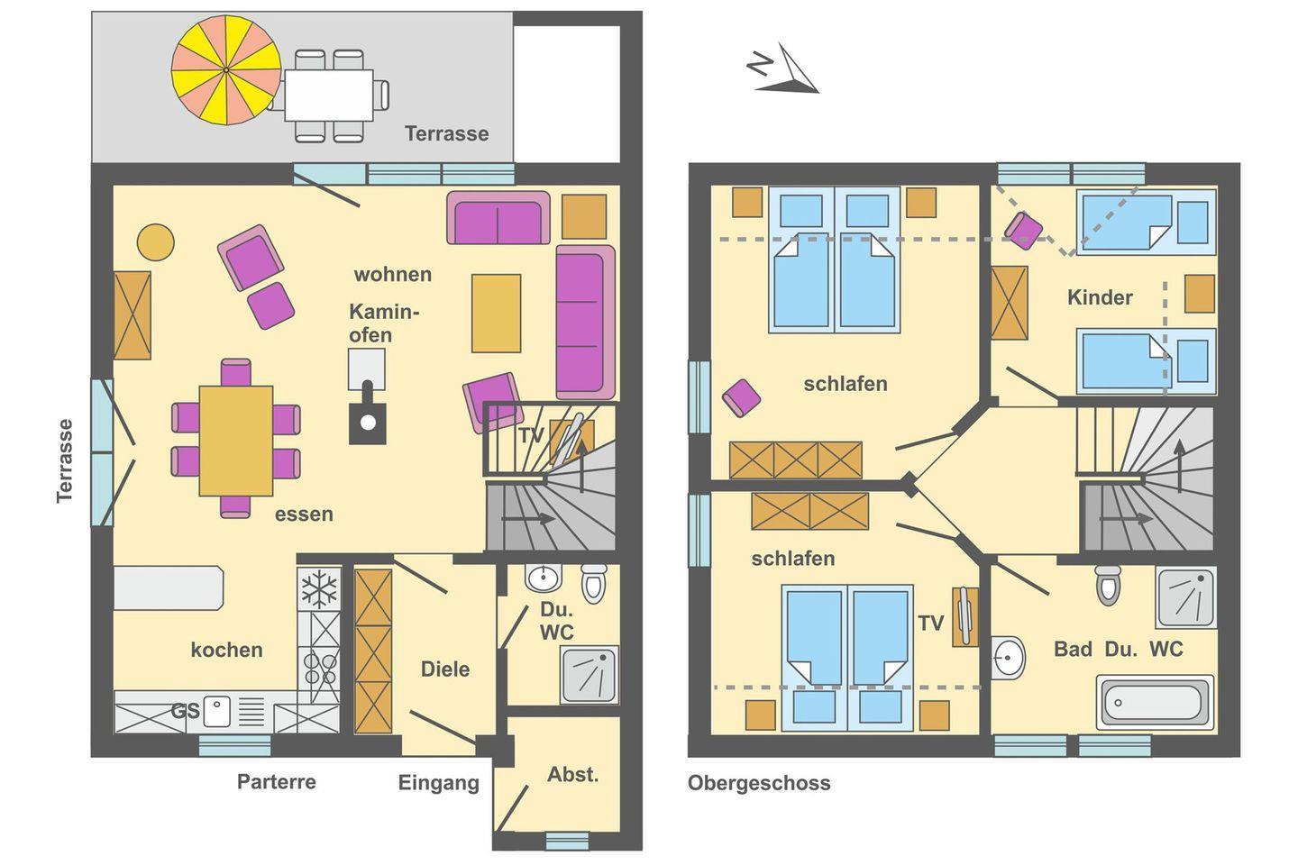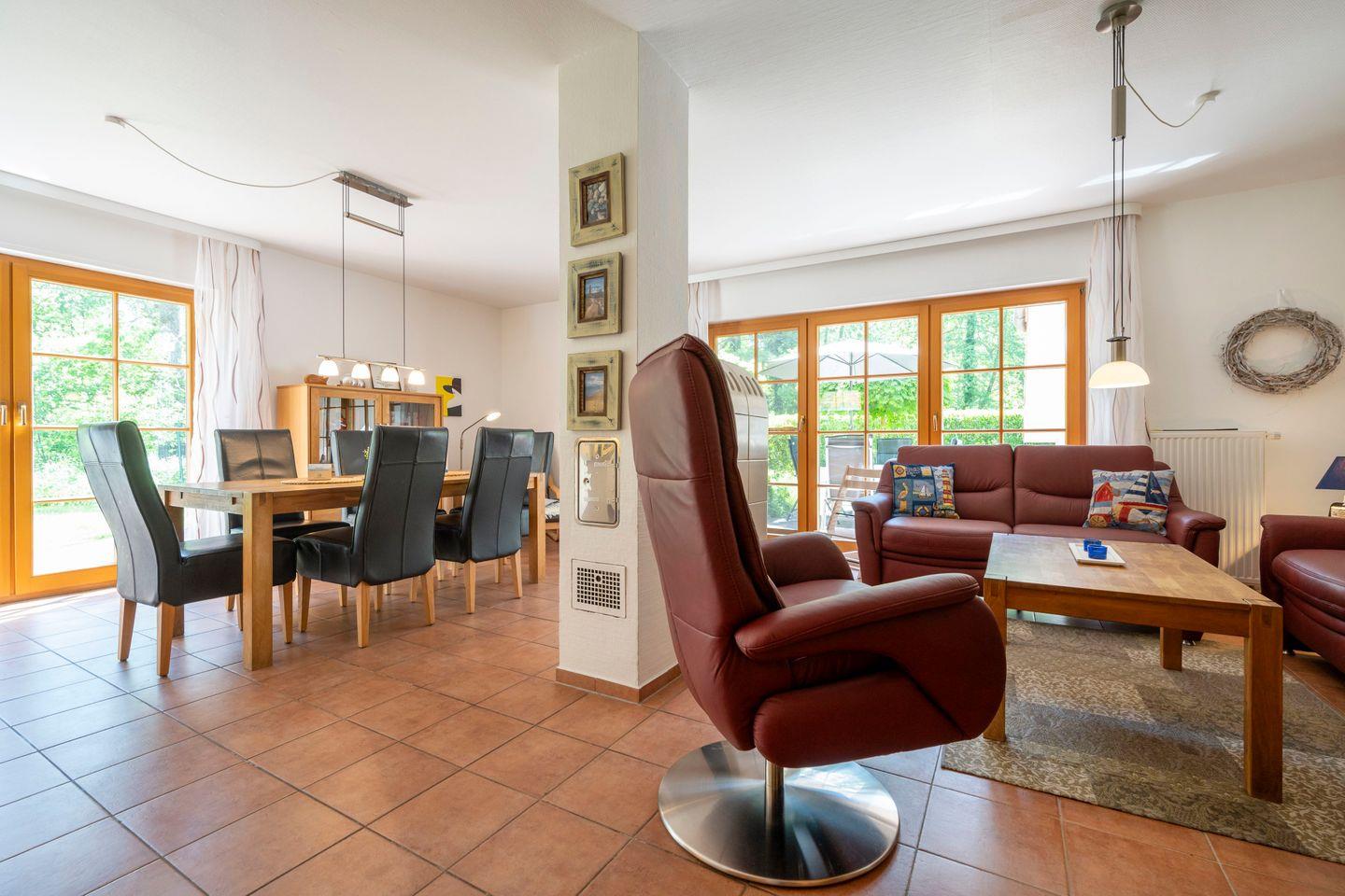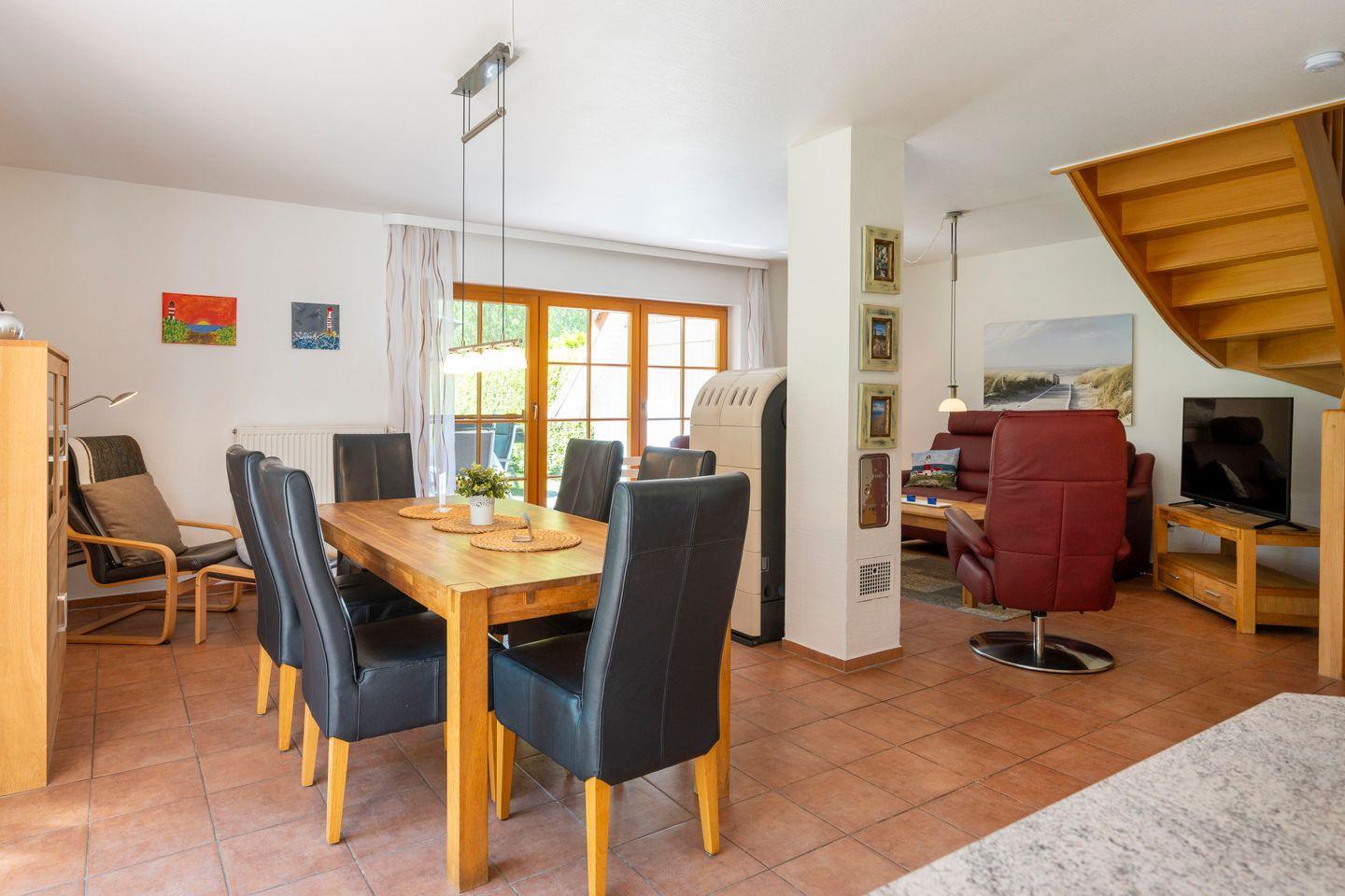 In der ersten Ebene läd der Wohnbereich mit Kamin, Sitzgruppe, TV, DVD-Player, sowie ein Esstisch für 6 Personen zum Verweilen ein.