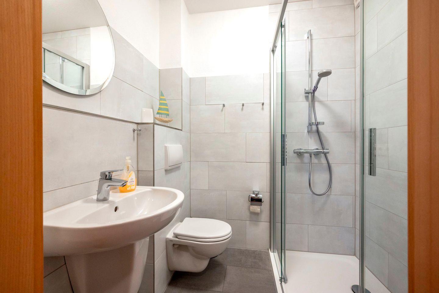Ein Bad mit Dusche, ein Waschtrockner und ein abgetrennter Eingangs-Garderobenbereich befindet sich ebenfalls im EG.