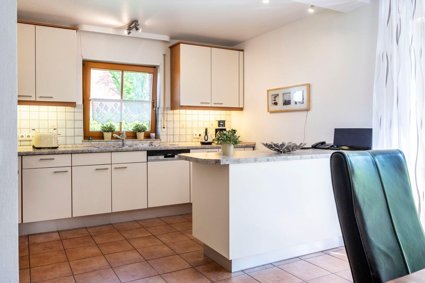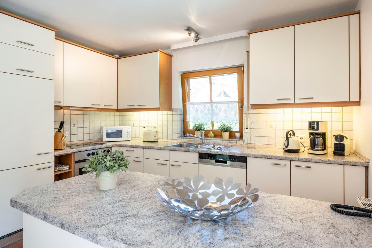 Die Küche ist mit Herd, Backofen, Mikrowelle, Kühlschrank mit Gefrierschrank, Dunstabzugshaube und Geschirrspüler ausgestattet.