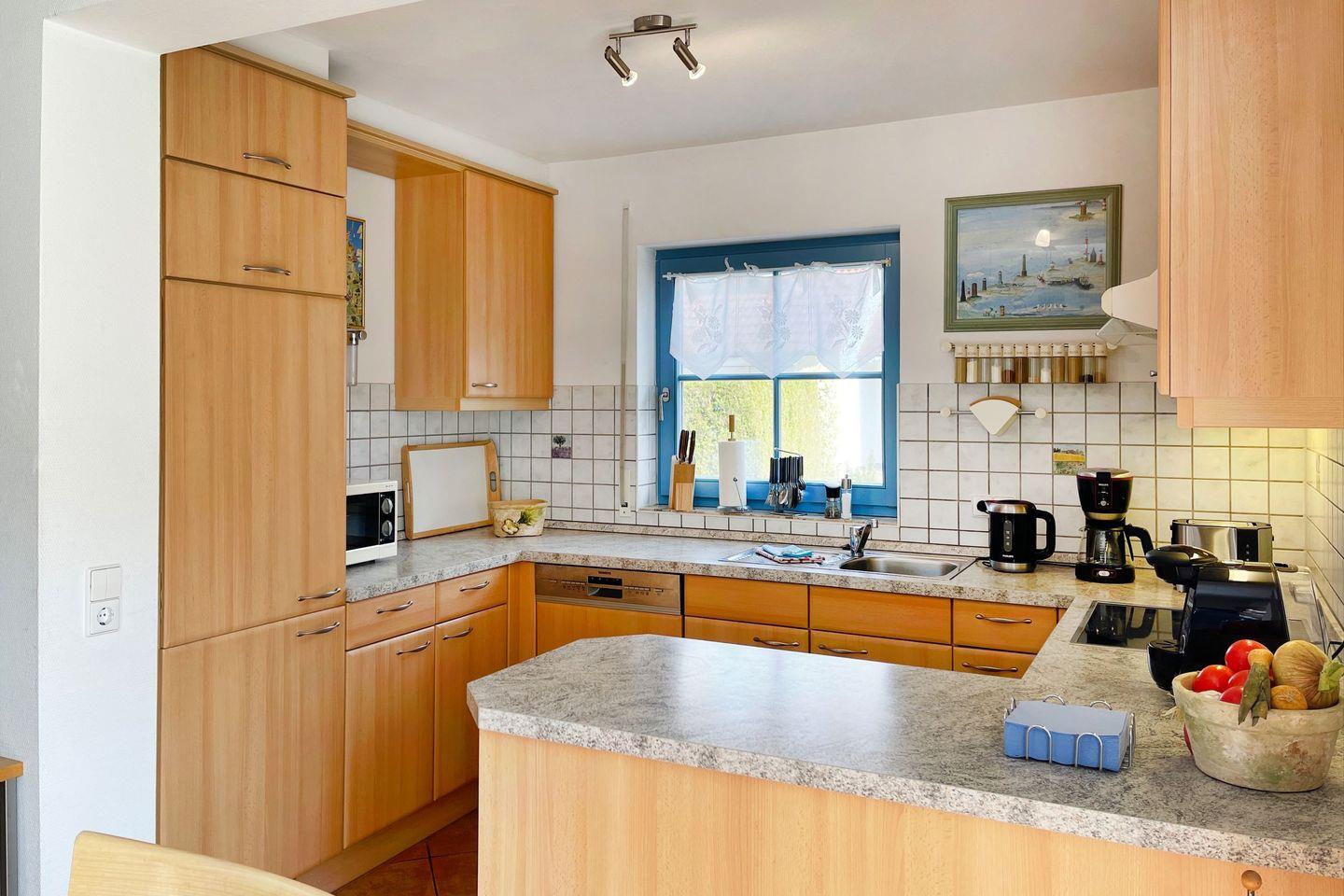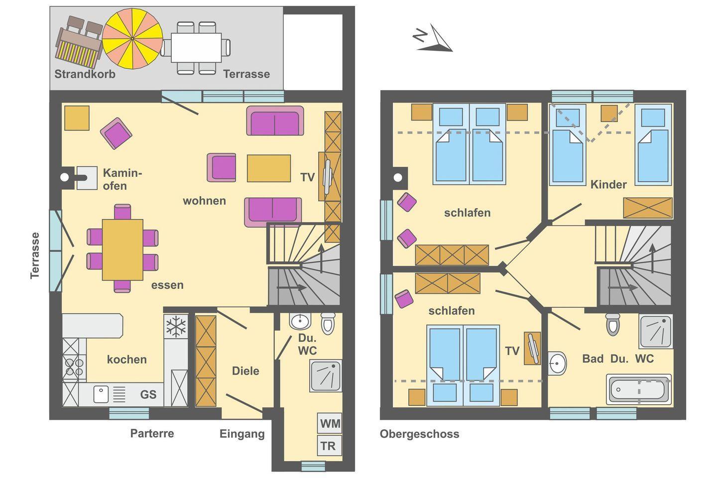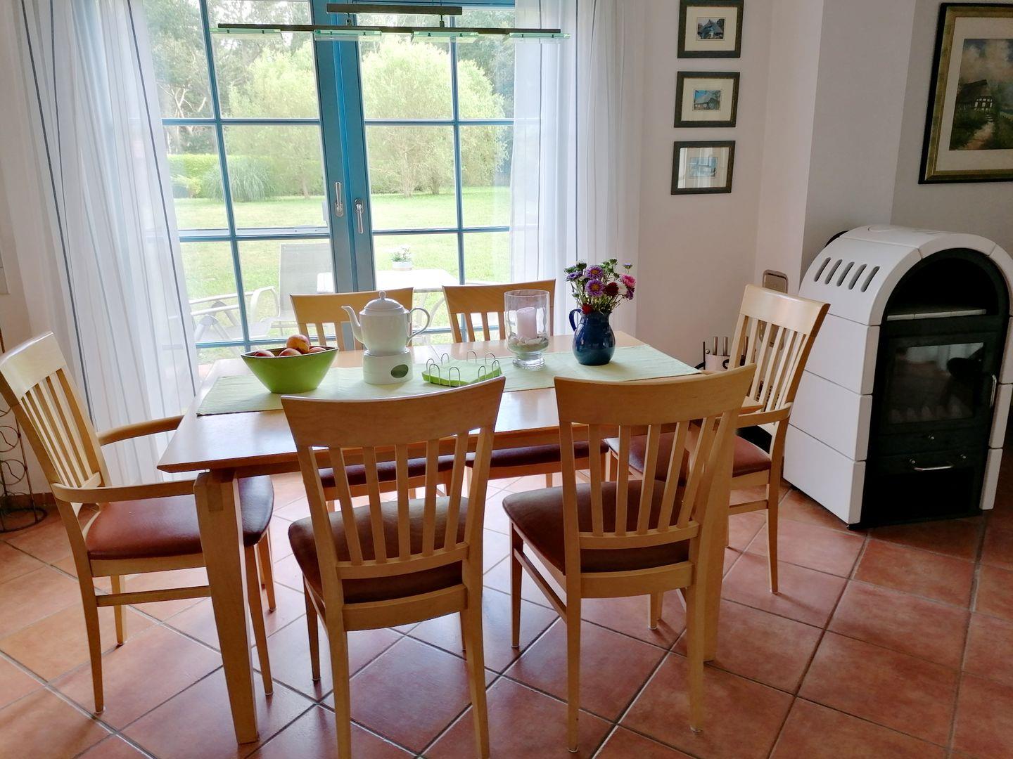 Im Erdgeschoss befindet sich ein lichtdurchfluteter Wohn/Essbereich mit einem Kaminofen, der an kühlen Tagen für eine wohlige Wärme sorgt. Ein Flachbild-TV sorgt für Entertainment. Die vollausgestattete Küche lässt keine Wünsche offen und verfügt über Toaster, Eierkocher, Brotschneidemaschine, Kaffeemaschine, Tassimo-Pad Maschine, Wasserkocher, Mikrowelle, Cerankochfeld, Kühlschrank mit Gefrierfach, Backofen & Geschirrspüler. In dem Tageslicht-Badezimmer befinden sich Dusche und WC außerdem eine Waschmaschine und ein Trockner.