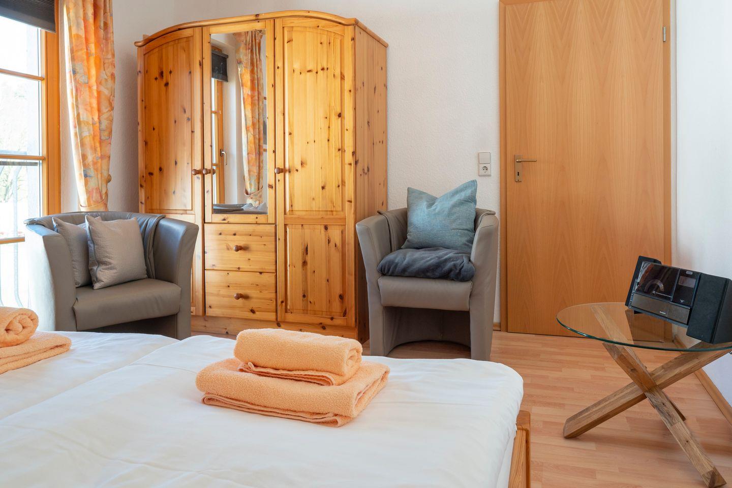 In einem Schlafzimmer befindet sich ein Doppelbett (2 Matratzen je 90 x 200) das zweite Schlafzimmer ist mit 2 Einzelbetten ausgestattet.