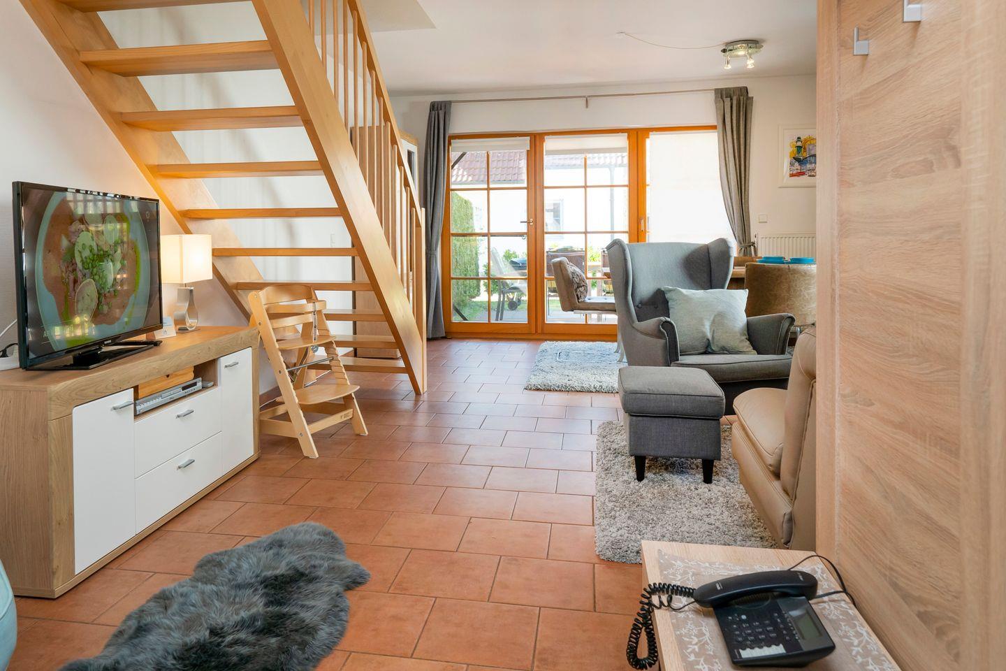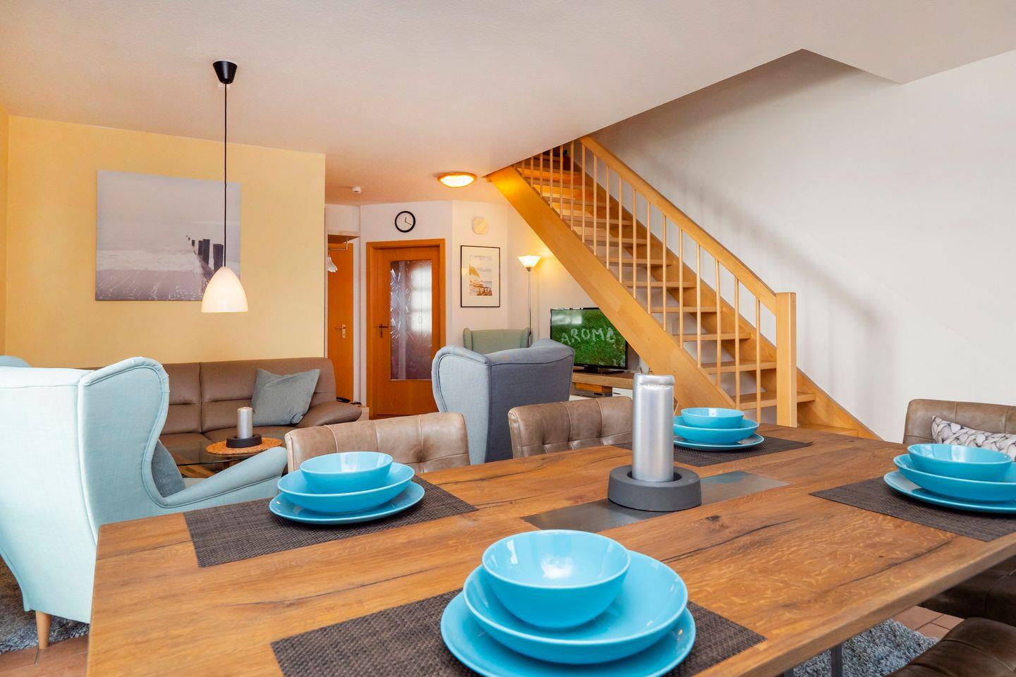 In der ersten Ebene läd der Wohnbereich mit Sitzgruppe, TV, DVD-Player, sowie ein Esstisch für 4 Personen zum Verweilen ein.