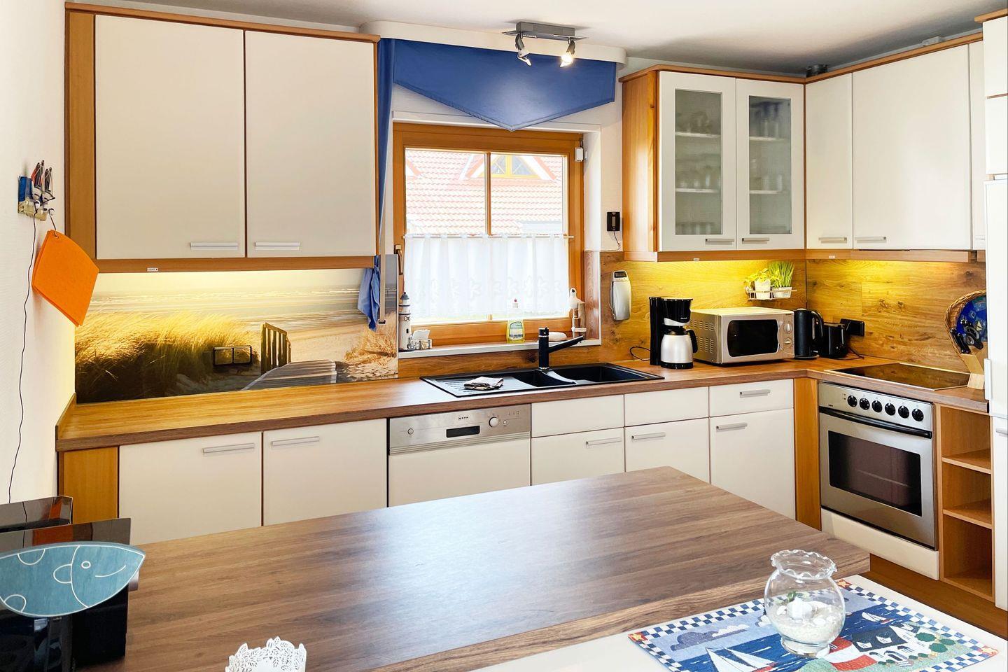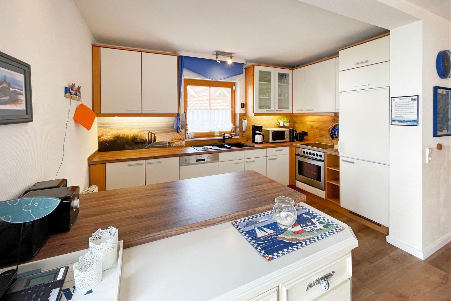 Die Küche ist mit Herd, Backofen, Mikrowelle, Kühlschrank mit Gefrierfach, Dunstabzugshaube und Geschirrspüler ausgestattet.