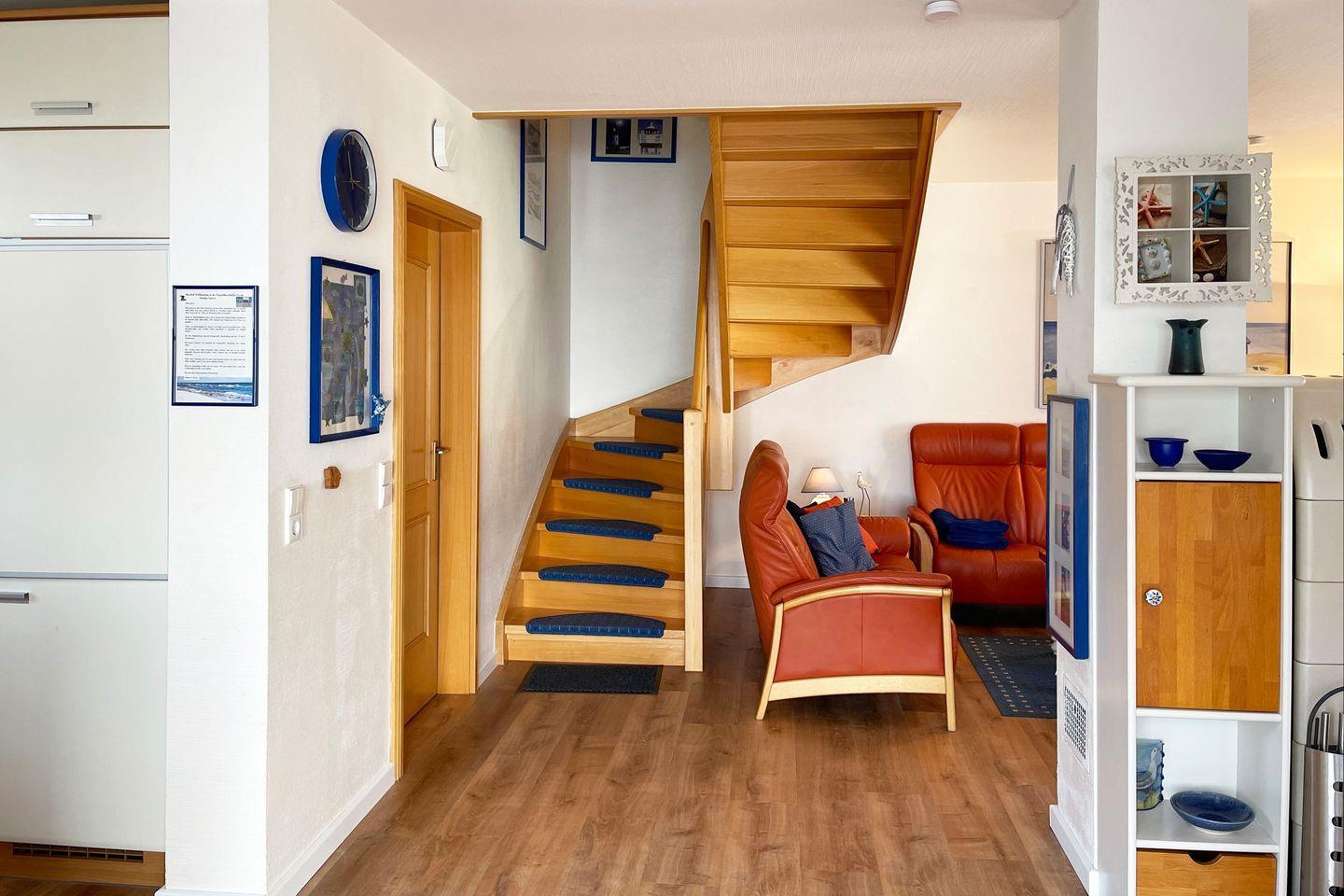 In der ersten Ebene läd der Wohnbereich mit Kamin, Sitzgruppe, TV, DVD-Player, sowie ein Esstisch für 6 Personen zum Verweilen ein.