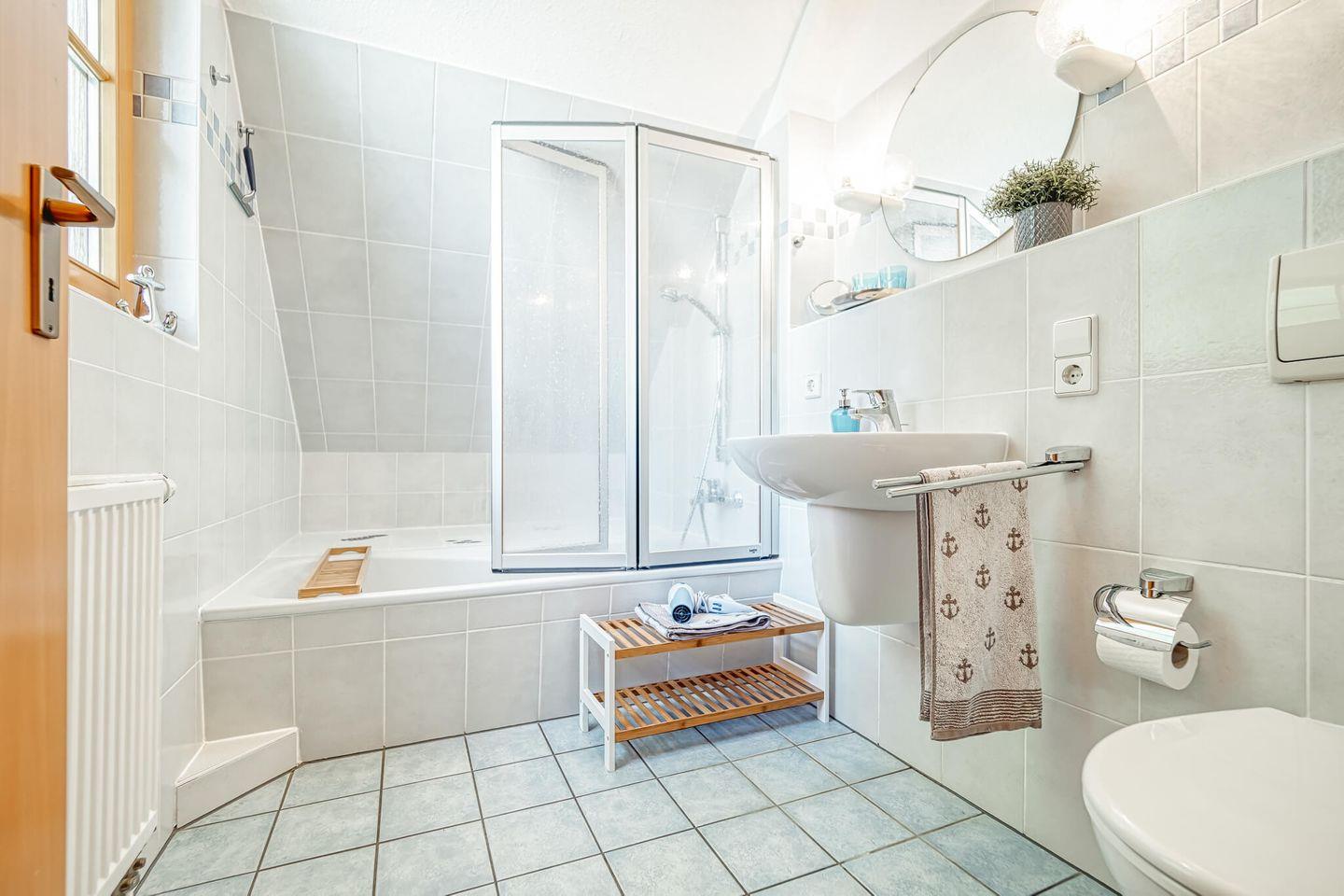 Im Badezimmer befindet sich eine Wanne, Waschbecken und WC