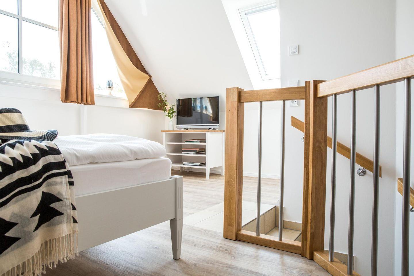 Die Ferienwohnung verfügt über ein Wohnzimmer mit TV. Der Esstisch und die integrierte Einbauküche bieten ausreichend Platz für einen gemeinsamen Kochabend. Das 1. Schlafzimmer verfügt über ein Doppelbett und eine TV. Der Schlafbereich in der Galerie verfügt über ein Doppelbett, eine gemütliche Lesecke und TV. Das Badezimmer ist mit einer ebenerdigen Dusche ausgestattet. Ein Pkw-Stellplatz und ein kleiner Fahrradschuppen steht zur Verfügung.