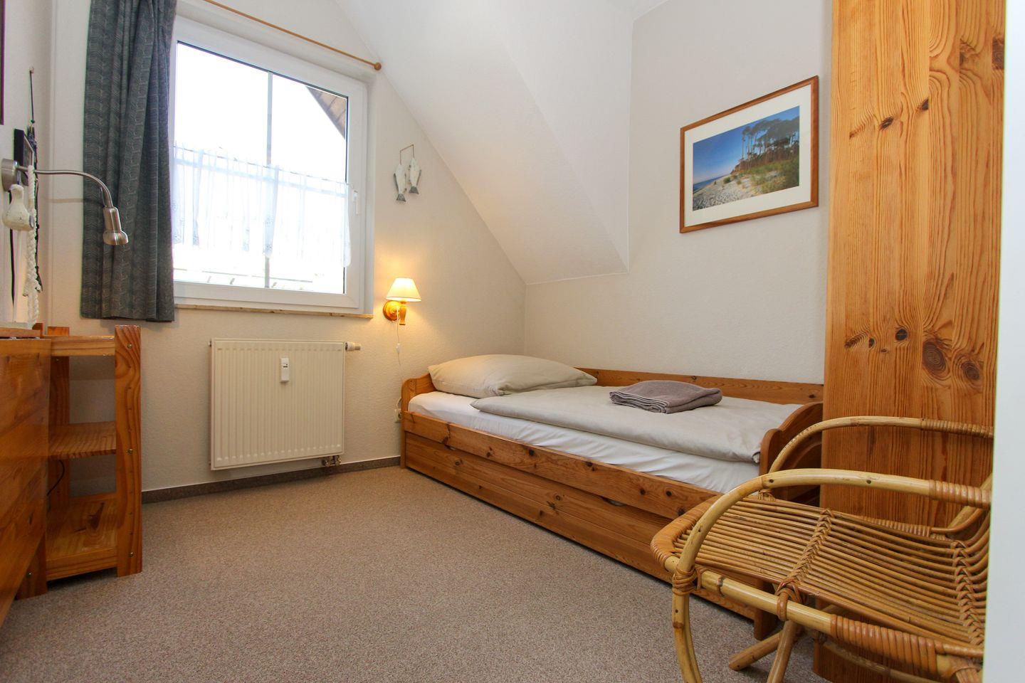 Die Wohnung für bis zu vier Personen befindet sich im Obergeschoss des Hauses, hat ca. 55 qm Wohnfläche und ist für Ihren Urlaub bestens eingerichtet. Im hellen und gemütlichen Wohnzimmer mit offener und komplett ausgestatteter Küche und dem Essbereich lassen sich erholsame Tage genießen. Vom Wohnzimmer aus gelangen Sie auf den nach Westen ausgerichteten Balkon. Hier können Sie den Tag beim Abendessen entspannt ausklingen und den Blick auf die benachbarten Birken und Kiefern schweifen lassen.