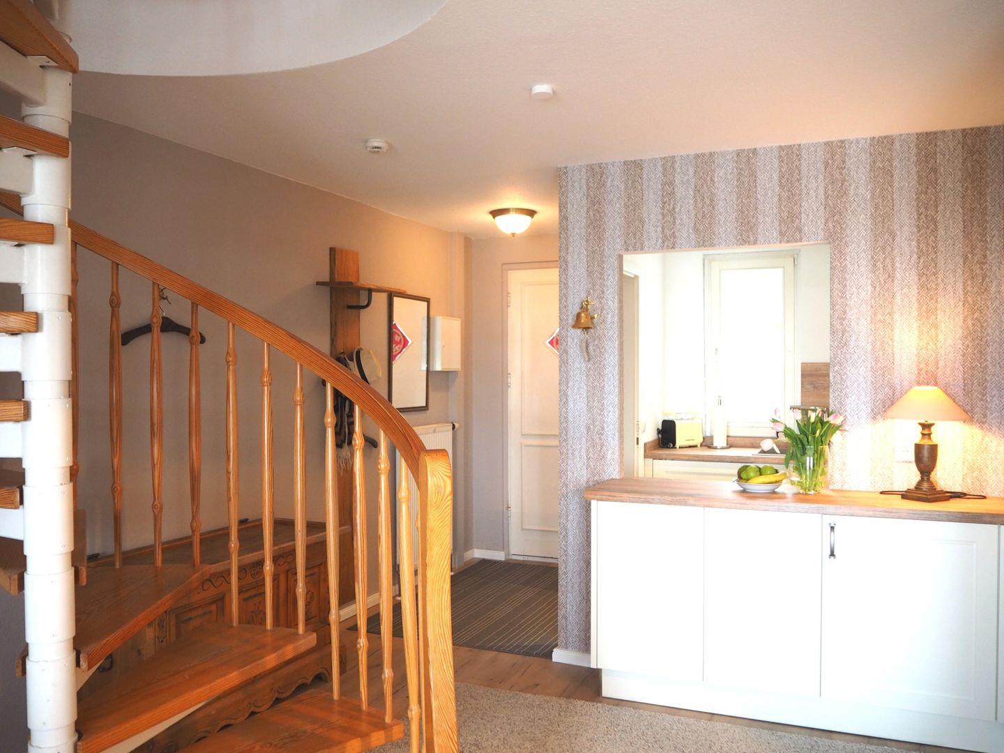 Auf der Wohnebene befinden sich die separate Küche, das Bad mit Wanne und WC sowie der große Wohnraum mit dem daran anschließenden Südbalkon. Über eine Wendeltreppe im Wohnraum erreichen Sie das großzügige Schlafzimmer ebenfalls mit Blick auf das Boddengewässer und einem weiteren Balkon (Nord). Zur Wohnung gehört ein Tiefgaragenplatz. Münzwaschmaschinen finden Sie im Keller.