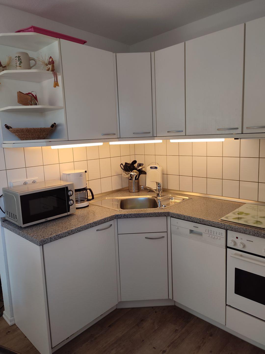 Die Ferienwohnung verfügt über zwei helle und komfortable Schlafzimmer, die eine erholsame Nachtruhe garantieren. Ein Schlafzimmer ist mit einem gemütlichen Doppelbett ausgestattet, während im zweiten Schlafzimmer ein hochwertiges Boxspringbett und eine ausziehbaren Schlfcouch bereitsteht. In der offenen, modern eingerichteten Küche können Sie Ihre kulinarischen Fähigkeiten unter Beweis stellen. Ausgestattet mit einem Herd, Backofen, Mikrowelle und Geschirrspüler bieten wir Ihnen alles, was Sie benötigen, um schmackhafte Mahlzeiten zuzubereiten. Genießen Sie Ihre Mahlzeiten im angrenzenden Wohnbereich oder auf dem Südbalkon mit gemütlichen Balkonmöbeln, von dem aus Sie frische Luft schnappen können.