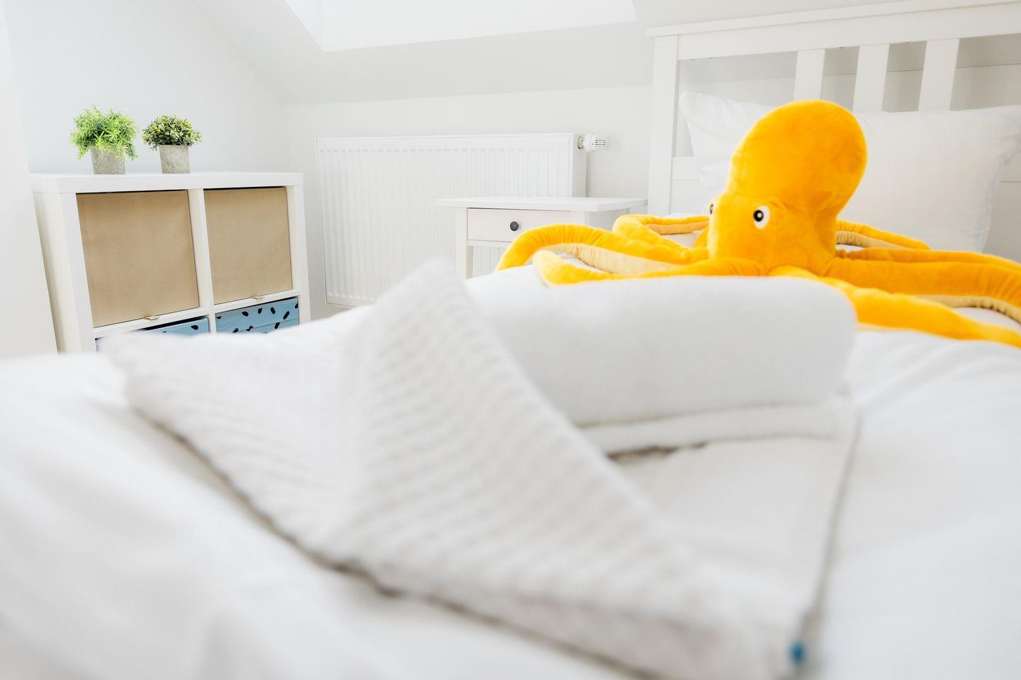 Für einen erholsamen Schlaf ist das Elternschlafzimmer mit einem Polsterbett (180cm x 200cm), ein weiteres Schlafzimmer mit einem Polsterbett (160x200cm), das dritte Schlafzimmer im Obergeschoss mit zwei 90x200cm Betten ausgestattet. Im Dachgeschoss befinden sich nochmal 2 Betten mit den Maßen 90x200cm. Das Elternschlafzimmer verfügt über einen weiteren Fernseher.