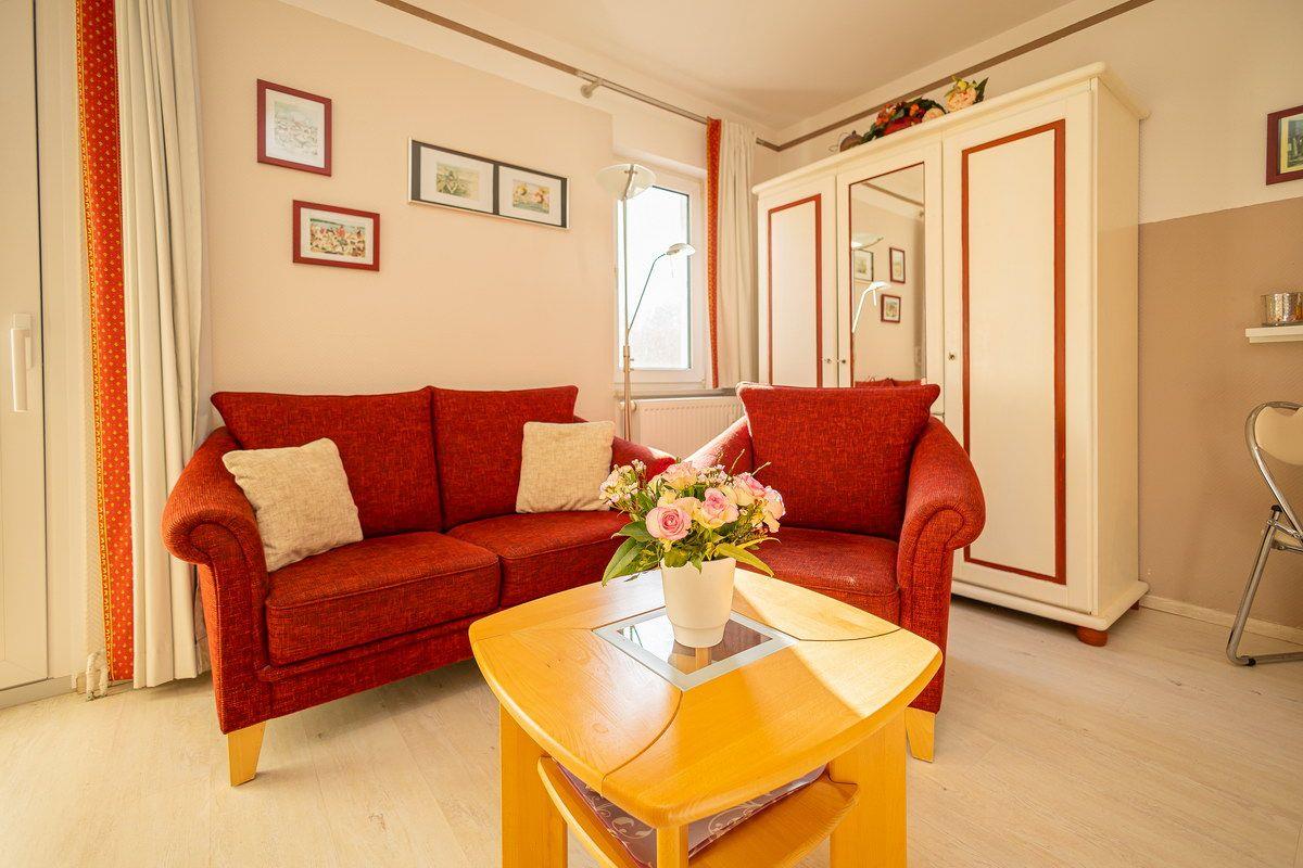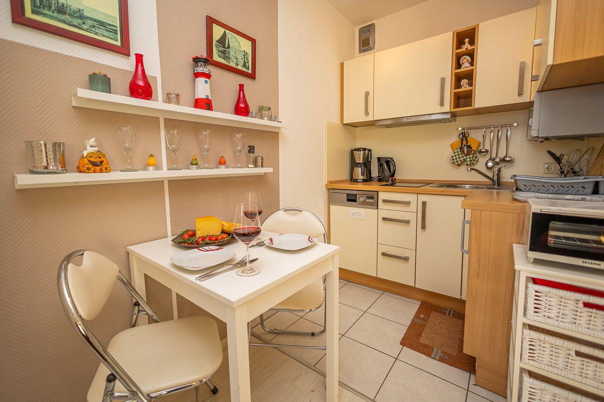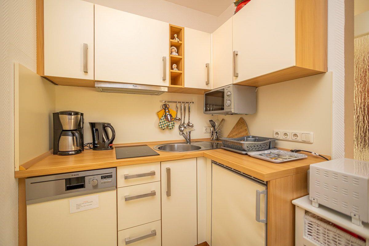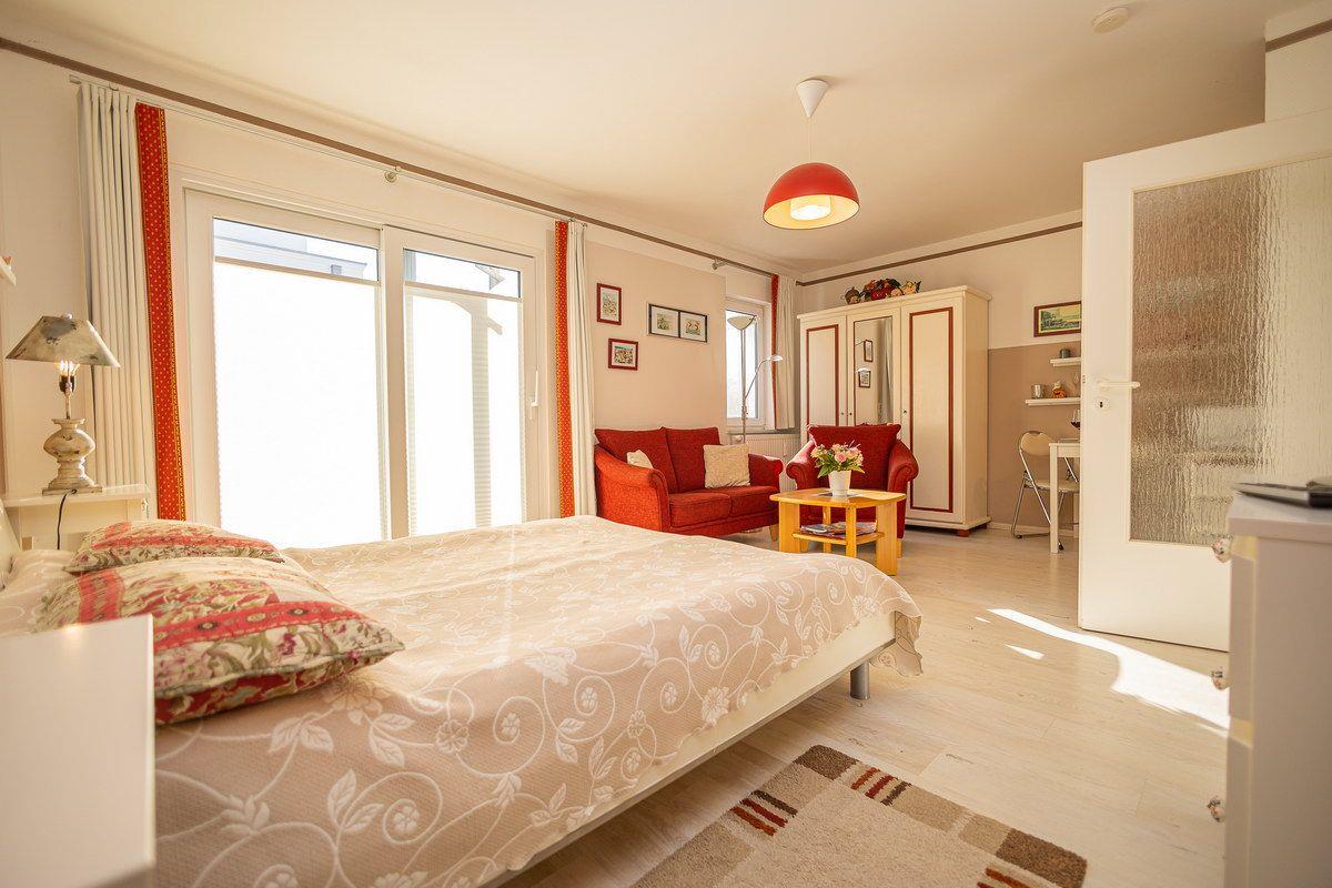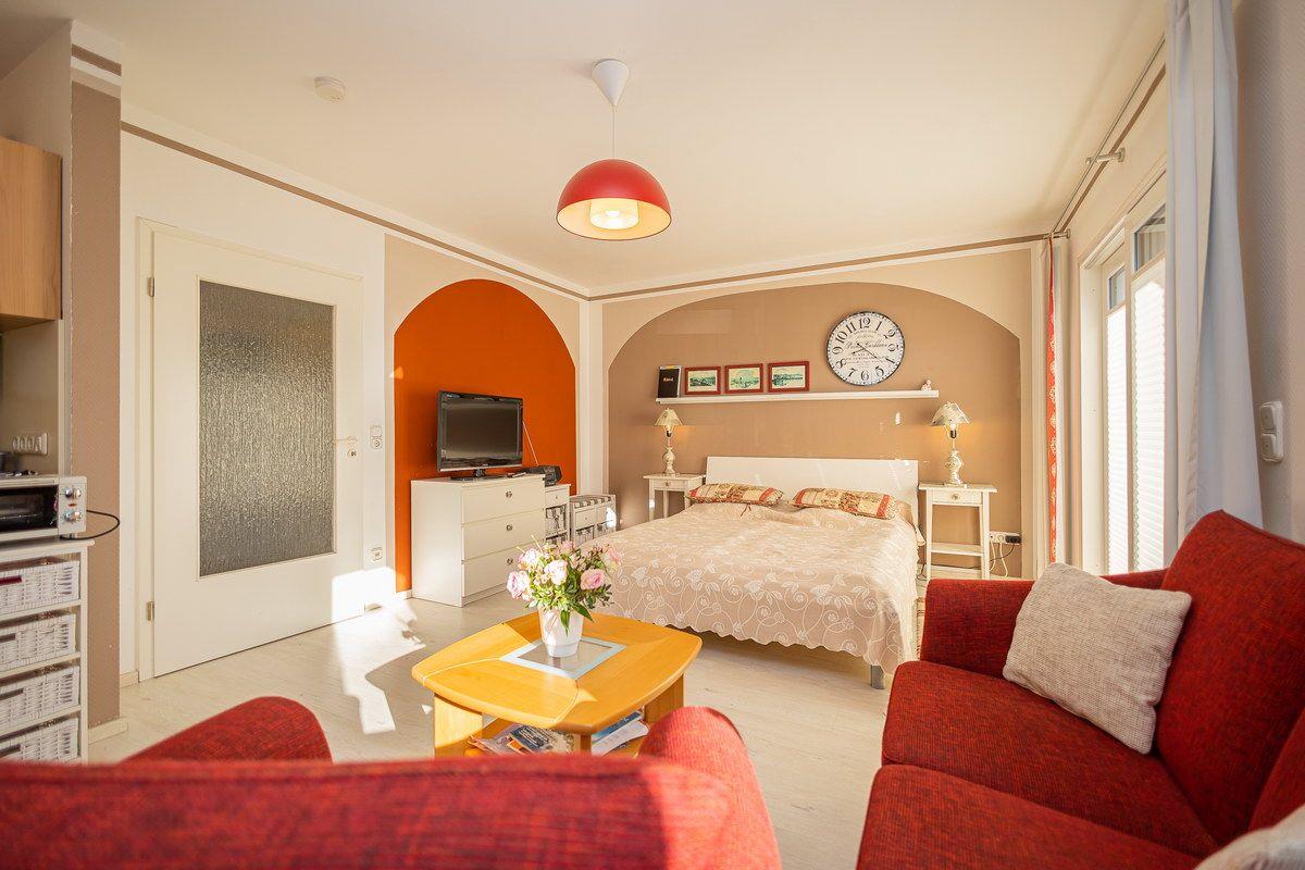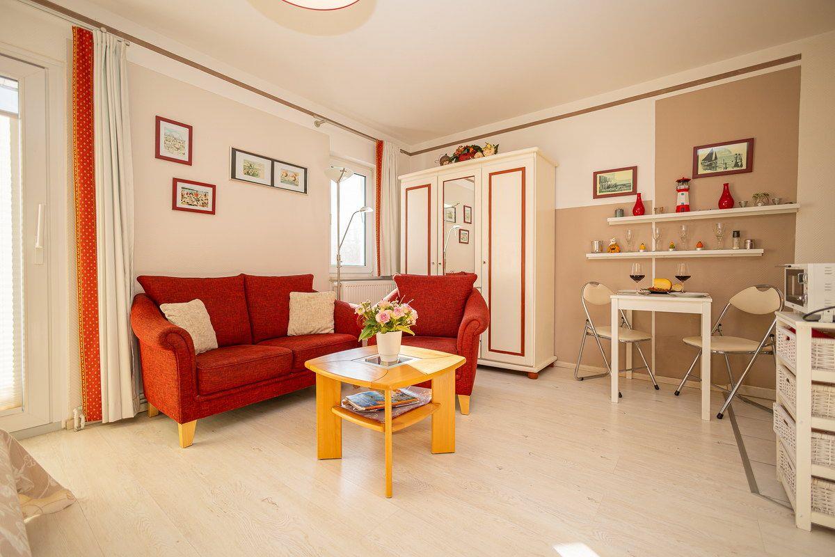 Studio, Süd-Terrasse, Küchen-Pantry, Geschirrspüler, Bad mit Dusche, 2 Personen, PKW-Stellplatz, Zentrum, ruhig gelegen, Strandnähe