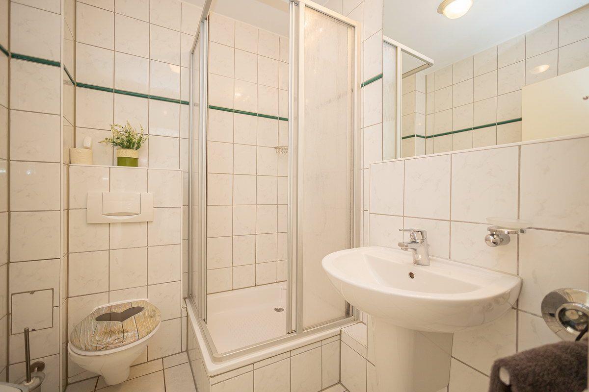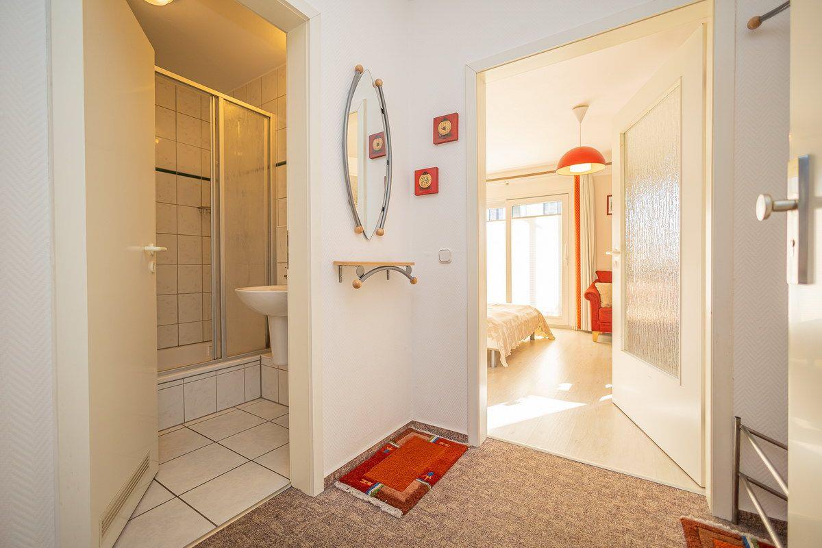Vom Flur aus gelangt man in das Bad mit Dusche und WC und in den kleinen Abstellraum. Die Süd-Terrasse bietet 2 bequeme Stühle mit Tisch, auf der man lauschige Abende zu zweit genießen kann. Ein WLAN-Zugang steht für unsere Gäste kostenfrei zur Verfügung. Zur Wohnung gehört ein auf der Rückseite des Grundstücks befindlicher PKW-Stellplatz. Im abschließbaren Gemeinschaftsschuppen können Fahrräder untergestellt werden.