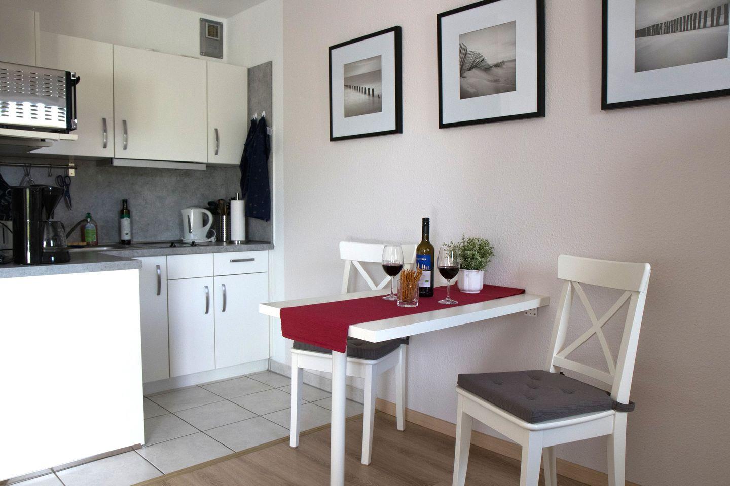 Die gut ausgestattete Kochnische lässt keine Wünsche offen und ist mit einem Herd, einem Kühlschrank, einer Mikrowelle, einer Kaffeemaschine sowie einem Toaster ausgestattet. Hier können Sie Ihre Lieblingsgerichte zubereiten und diese herrlich auf dem Balkon genießen, der mit Gartenmöbeln ausgestattet ist und Ihnen einen Ort der Entspannung im Freien bietet. Der moderne TV sorgt für vielfältige Unterhaltungsangebote an gemütlichen Abenden.