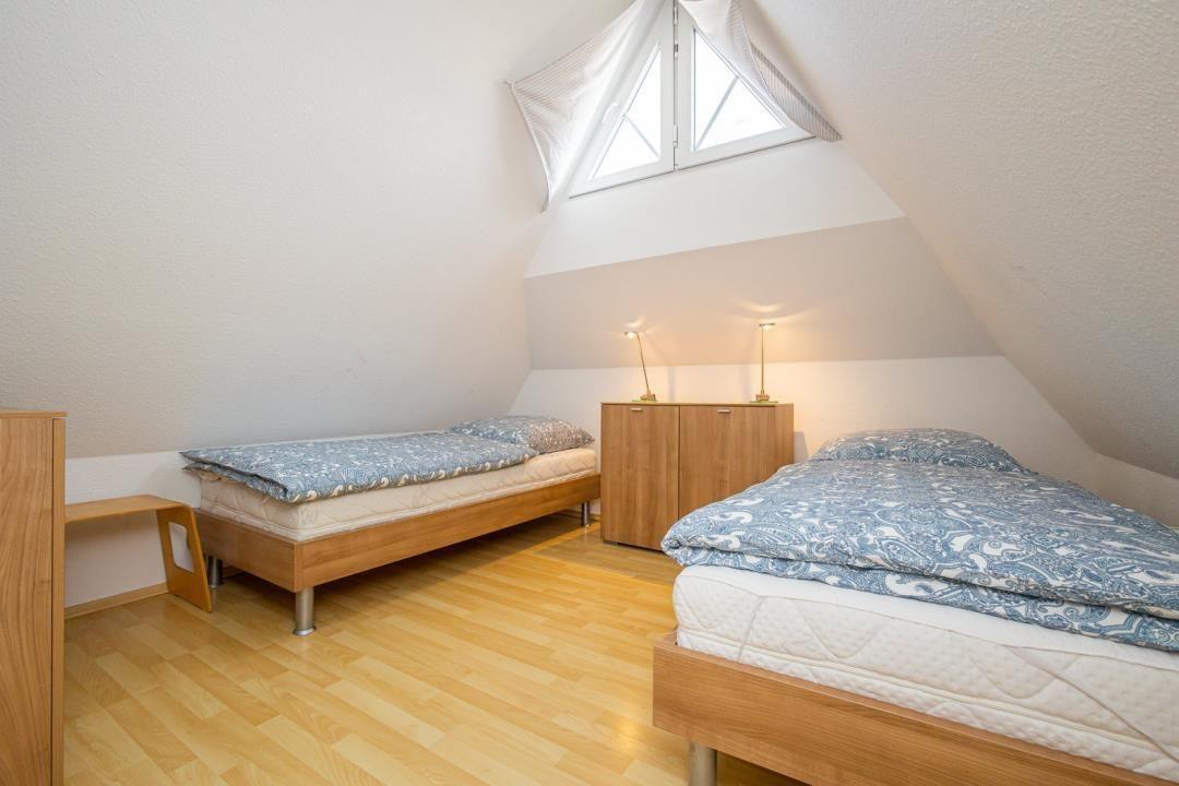 Das 1. Obergeschoss verfügt über 1 Schlafzimmer mit TV, Sauna und 2 Bäder. Dem Schlafzimmer mit Doppelbett angeschlossen ist ein Bad mit Dusche. Ein weiteres Schlafzimmer im Dachgeschoss ist mit 2 Einzelbetten ausgestattet. Die Bettdecken und Kissen in den Schlafzimmern sind für Allergiker geeignet. Das Ferienhaus ist gefliest. Erdgeschoss und Bäder sind mit Fußbodenheizung versehen. Das Haus verfügt im Erdgeschoss über Rolläden zum Verdunkeln und Insektenschutz. Im 1. und 2. OG befinden sich Plissees vor den Fenstern. Die Bäder im 1. OG. haben eine ebenerdige Dusche und einen Handtuchtrockner. Zum Ferienhaus gehört eine Terrasse in Süd-Lage mit bequemen Gartenmöbeln, Sonnenschirm und einem Weber-Elektrogrill. Am Haus können 2 PKW hintereinander geparkt werden. Ein abschließbarer Schuppen zum Unterstellen von Fahrrädern ist vorhanden.