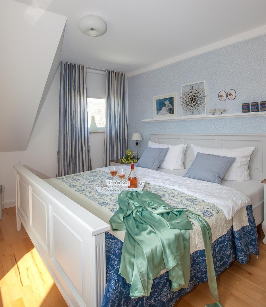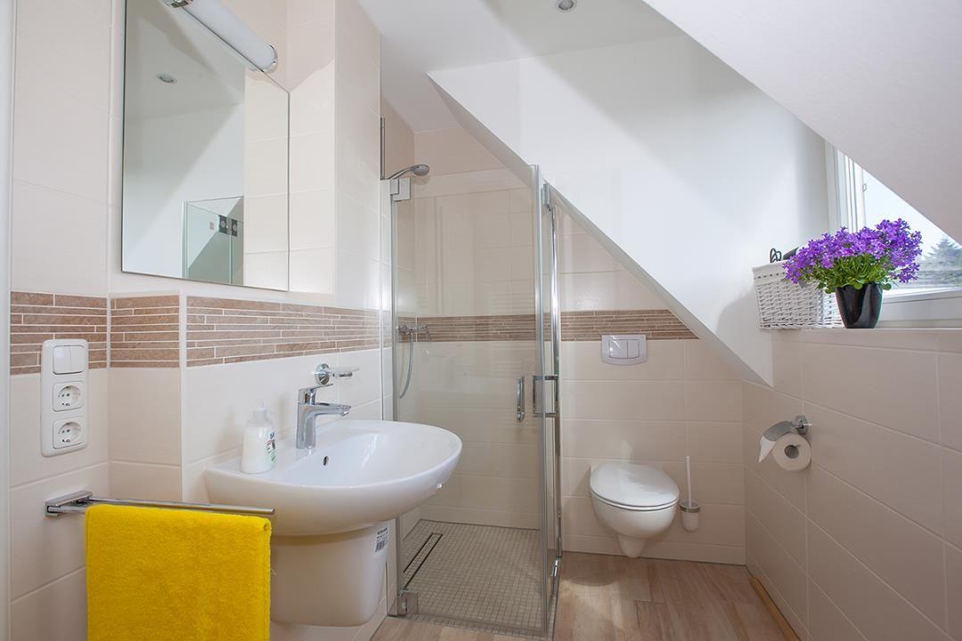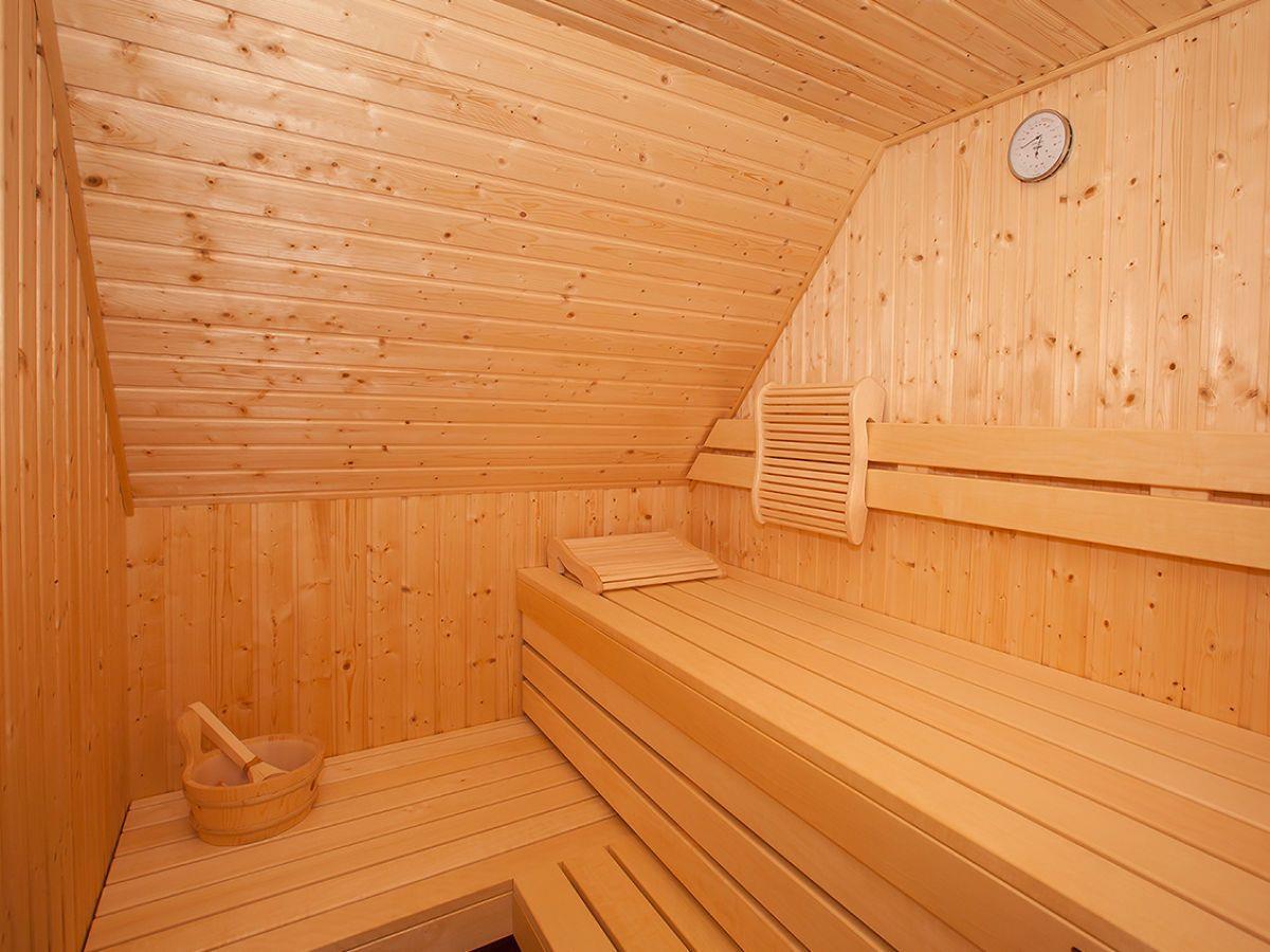 Im Obergeschoss befinden sich 2 Schlafzimmer, ein Bad mit Dusche und eine Sauna. Die beiden mit Parkettfußboden versehenen Schlafzimmer sind jeweils mit Doppelbetten von 1,80 m Breite ausgestattet und bieten höchsten Schlafkomfort. Jedes Schlafzimmer verfügt über TV, Allergiker-Kopfkissen und einen großzügigen Kleiderschrank zum Unterbringen Ihrer Garderobe.