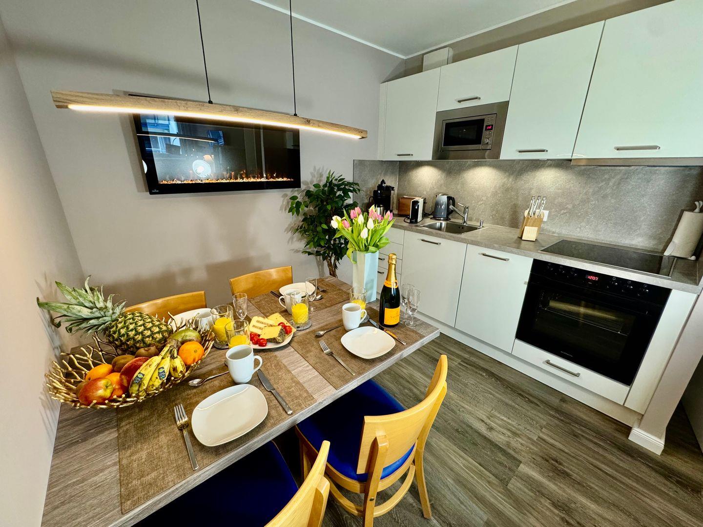 Freuen Sie sich auf einen Urlaub in einer modernen und schicken Ferienwohnung mit einer neuen, voll ausgestatteten Küchenzeile, renoviertem Bad, einem Elektrokamin, und 2 Fernsehern: Wohnzimmer 55“; Schlafzimmer 43“.