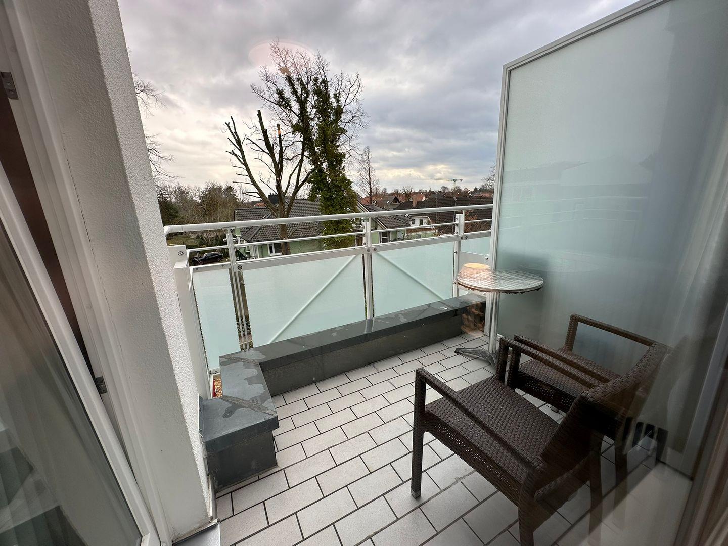 Im Wohnzimmer befindet sich ein Sitzbereich mit TV und Schreibtisch. Ein 1,60m breites Schlafsofa steht als Schlafmöglichkeit für 2 Personen im Wohnzimmer zur Verfügung. Der vom Wohnzimmer abgehende Balkon mit Gartenmöbeln ist zur Süd-Seite ausgerichtet, liegt sehr ruhig und lädt zum Verweilen ein. Wohnbereich, Schlafzimmer und Flur sind mit hochwertigem Vinyl-Fußboden ausgestattet.