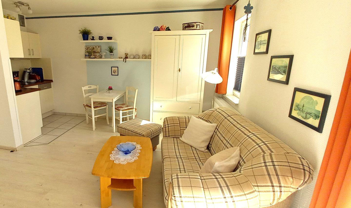 Wenn Sie die Wohnung betreten, werden Sie den liebevoll gestalteten Wohnbereich bemerken, der mit einem hochwertigen Laminatboden ausgestattet ist und mit einer gemütlichen Atmosphäre überzeugt. Hier finden Sie eine moderne Kochnische, die mit einem Herd, einem Kühlschrank, einer Mikrowelle und einer Spülmaschine ausgestattet ist. Damit ist die Wohnung ideal für Selbstversorger geeignet. Darüber hinaus steht Ihnen eine Kaffeemaschine sowie ein Toaster zur Verfügung, um Ihre morgendlichen Rituale zu unterstützen. Geschirr und Besteck sind ebenfalls vorhanden, sodass Sie beim Zusammenstellen Ihrer Mahlzeiten keine Wünsche offen bleiben.