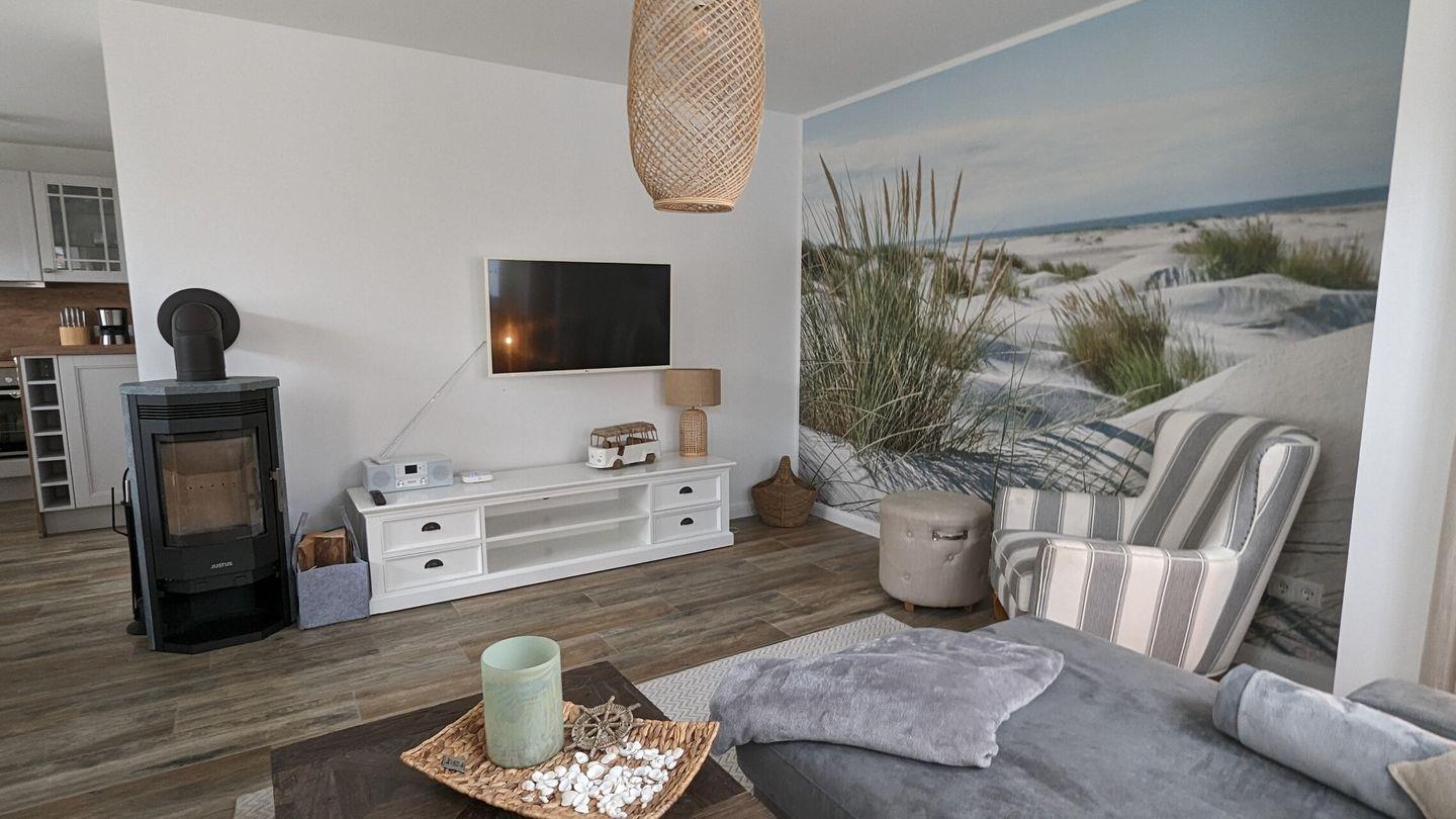 Die Sitzlandschaft im Wohnbereichs vor dem Kaminofen verspricht lauschige