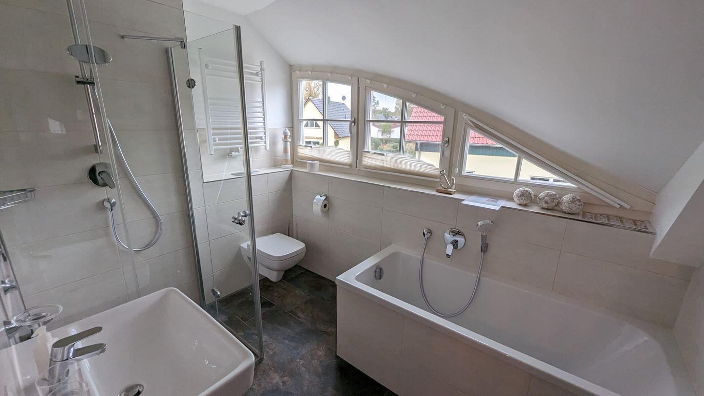 ebenerdiger Dusche, sowie einer Badewanne befindet sich im