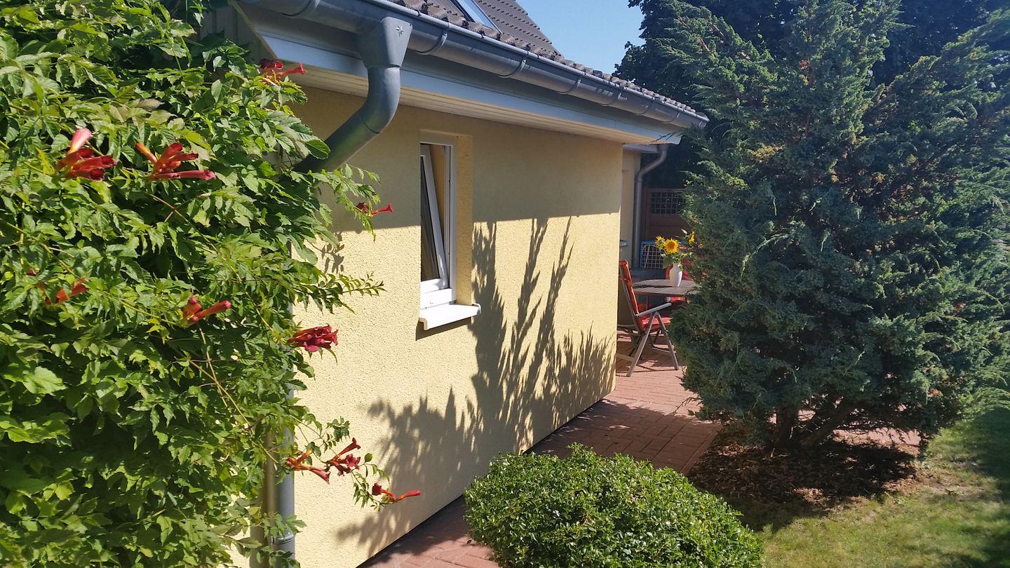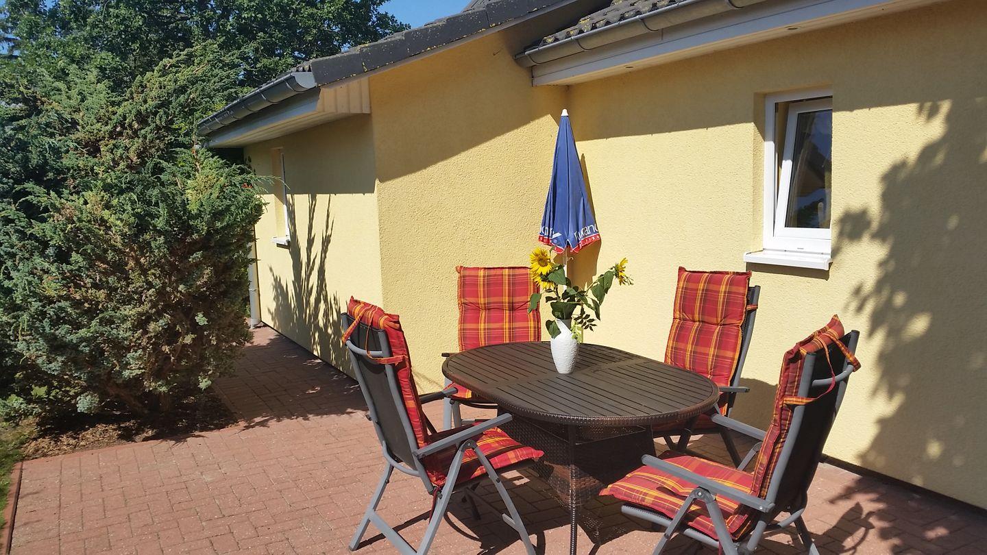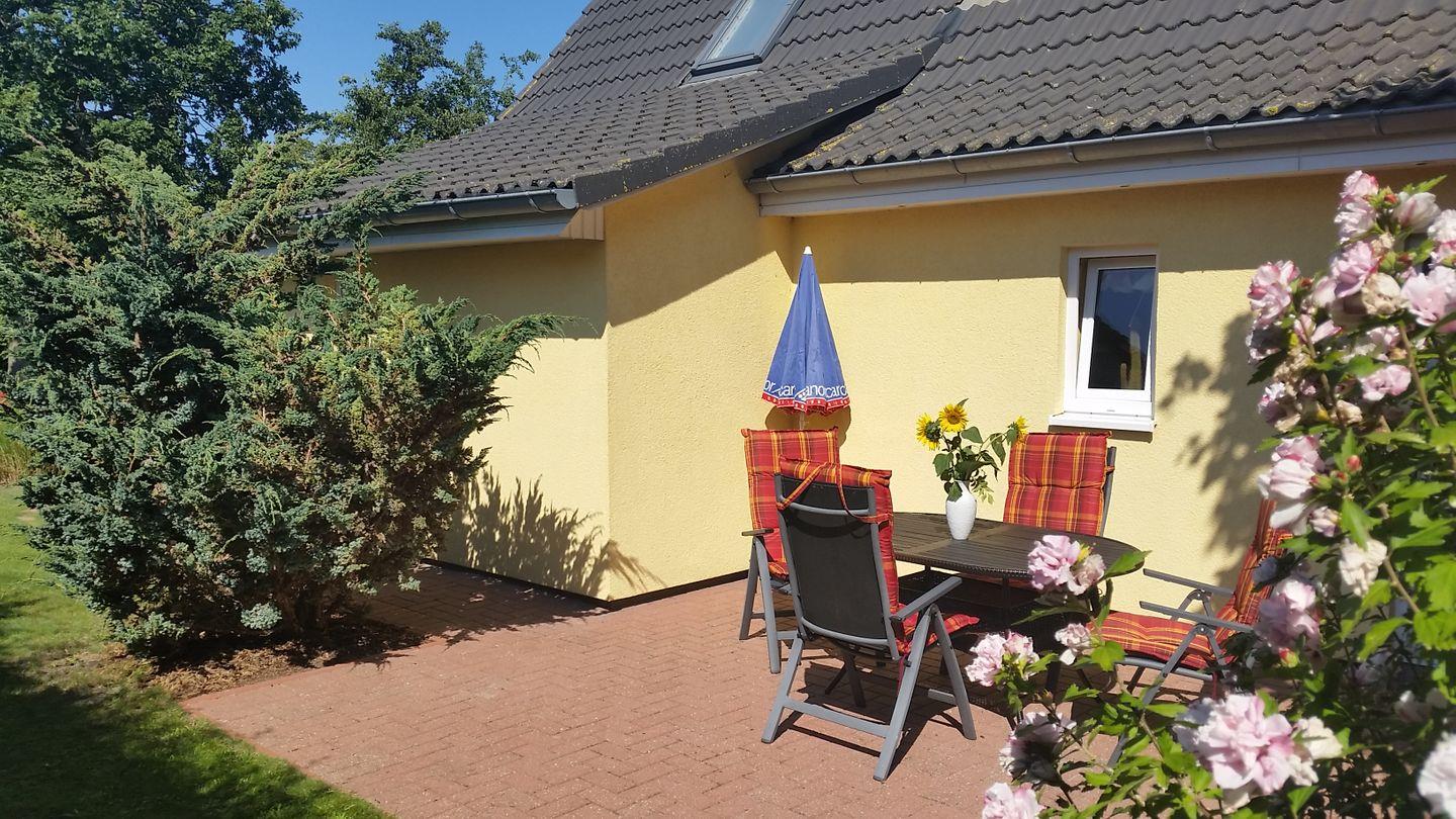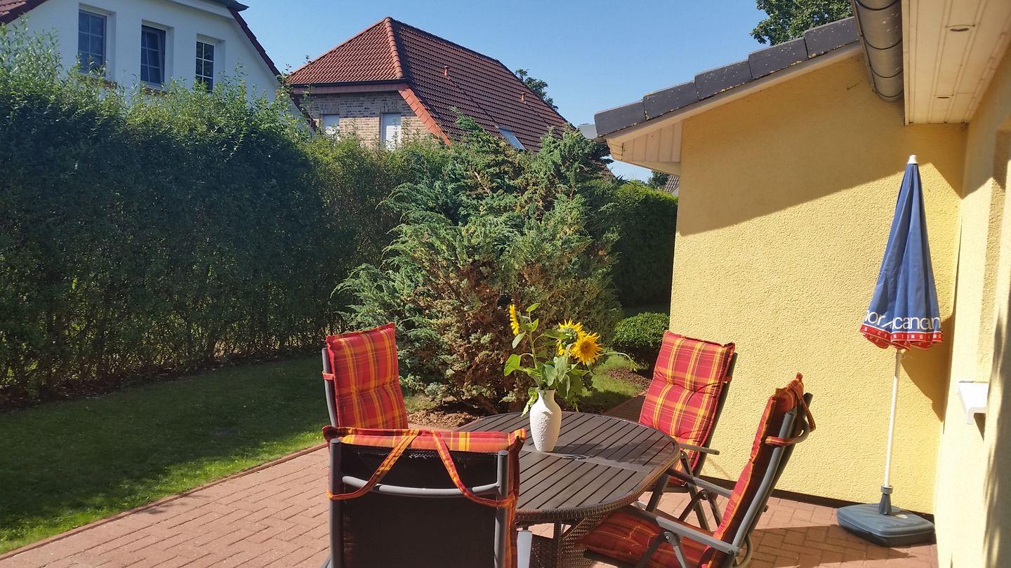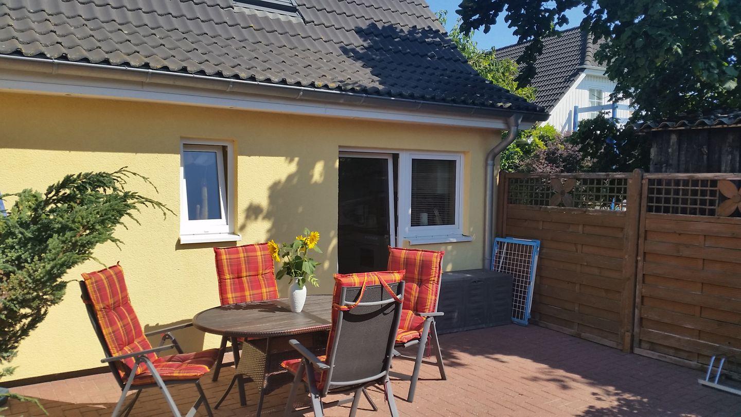 Ferienhaus Sonnenblume Sonne 1 in Zingst bietet gemütliche Entspannung mit Terrasse und Garten, nur 900 m vom Strand entfernt.