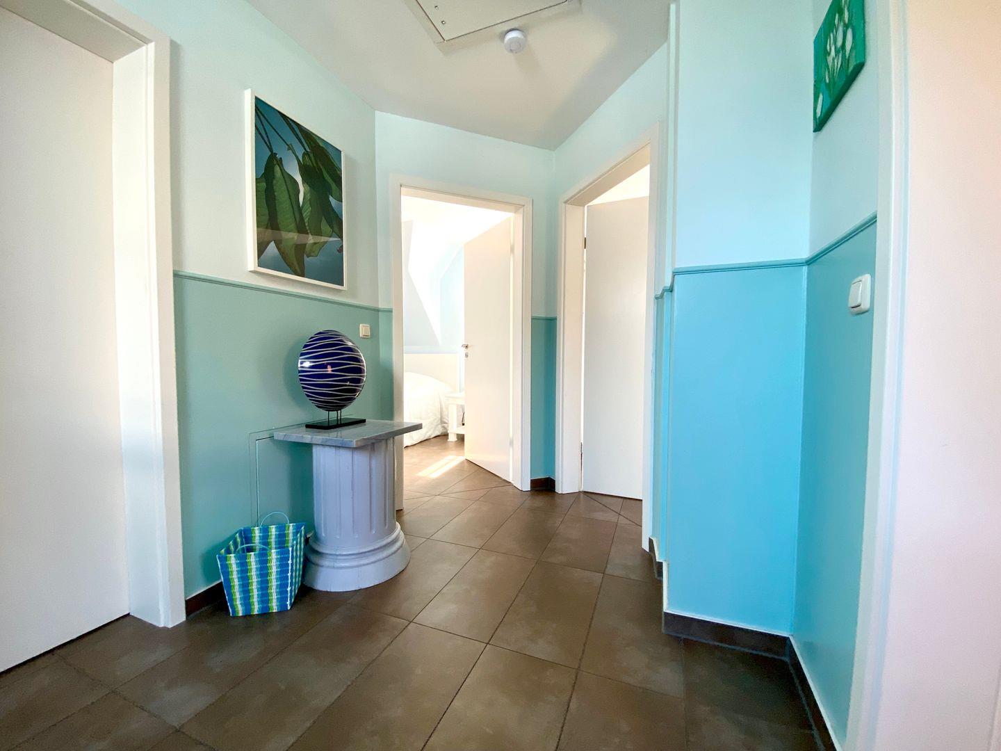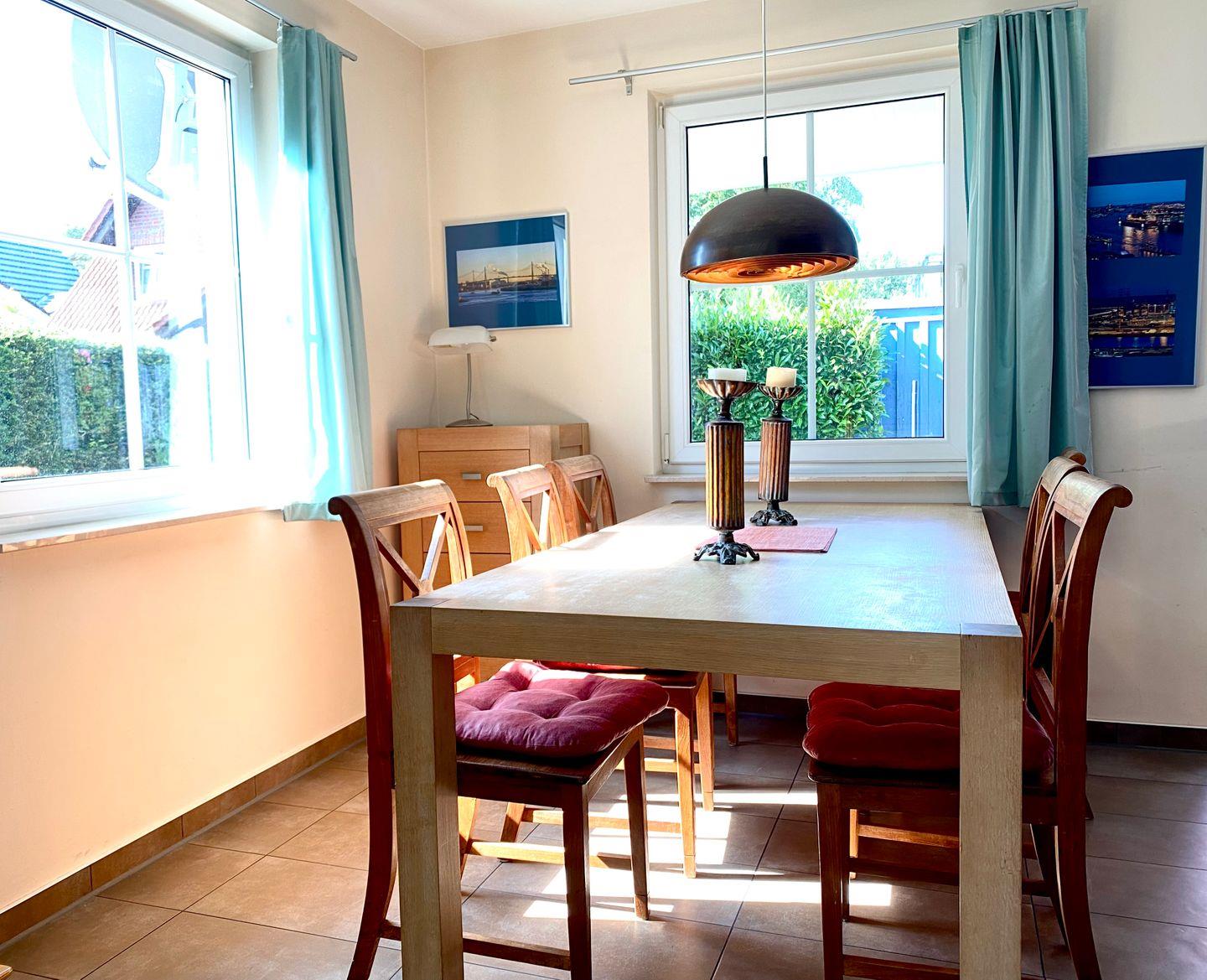 Das individuell und geschmackvoll eingerichtete, frei stehende Einfamilien-Komforthaus bietet auf ca. 110 qm Wohnfläche großzügigen Platz für 6 Personen. Es ist ausgestattet mit einem Wohnraum, geräumigen Essplatz und einer komplett eingerichteten Küche, wo es an nichts fehlt. Drei individuell gestaltete Schlafräume, jeweils mit Doppelbett. Bad mit großer Dusche, Bidet, WC und Doppelwaschbecken. Das Gästebad hat zusätzlich eine weitere Dusche. 6 sitziger Essplatz plus Kinderstuhl (Tripp Trapp). Ein vorhandenes Kinderbett kann aufgestellt werden. Im Wohnzimmer befindet sich ein Kaminofen (mit Holz zu befeuern) für kuschelige Abende. Flachbildschirm Sat-TV und DVD Player, sowie eine Stereo Musikanlage sind vorhanden. Ein Schlafzimmer ist ebenfalls mit Sat-TV und DVD ausgestattet. Kostenloses W-LAN. Die Südwestterrasse ist überdacht und mit Gartenmöbeln, sowie einer Sonnenliege und 2 Sonnenstühlen ausgestattet. Bei Bedarf kann der Holzkohlegrill genutzt werden. 2 Parkplätze sind direkt am Haus und es gibt einen Fahrradständer.