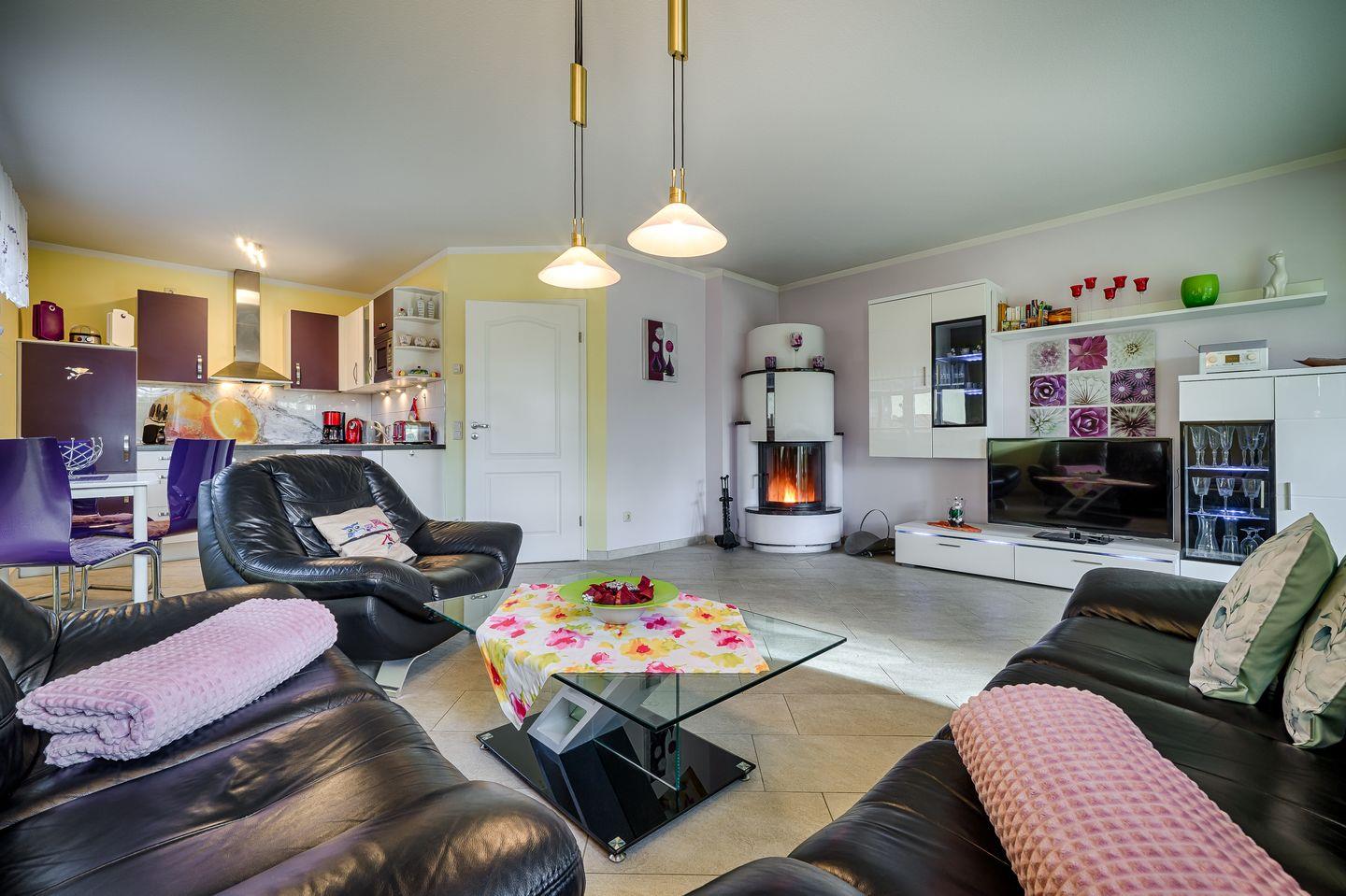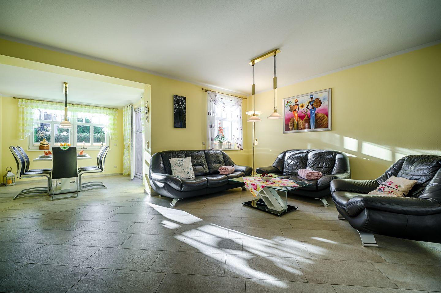 Wohnraum mit Couch-Ecke und Esstisch für 6 Personen, TV