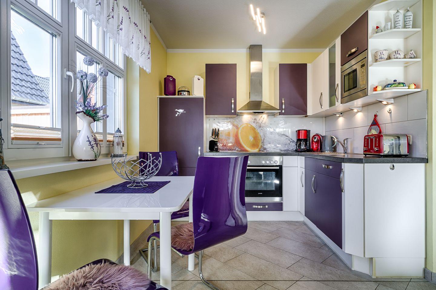 offene Einbauküche mit Herd/Cerankochfeld, Backofen, Spülmaschine, Kühlschrank mit Gefrierfach, Mikrowelle, Kaffeemaschine, Toaster, Wasserkocher