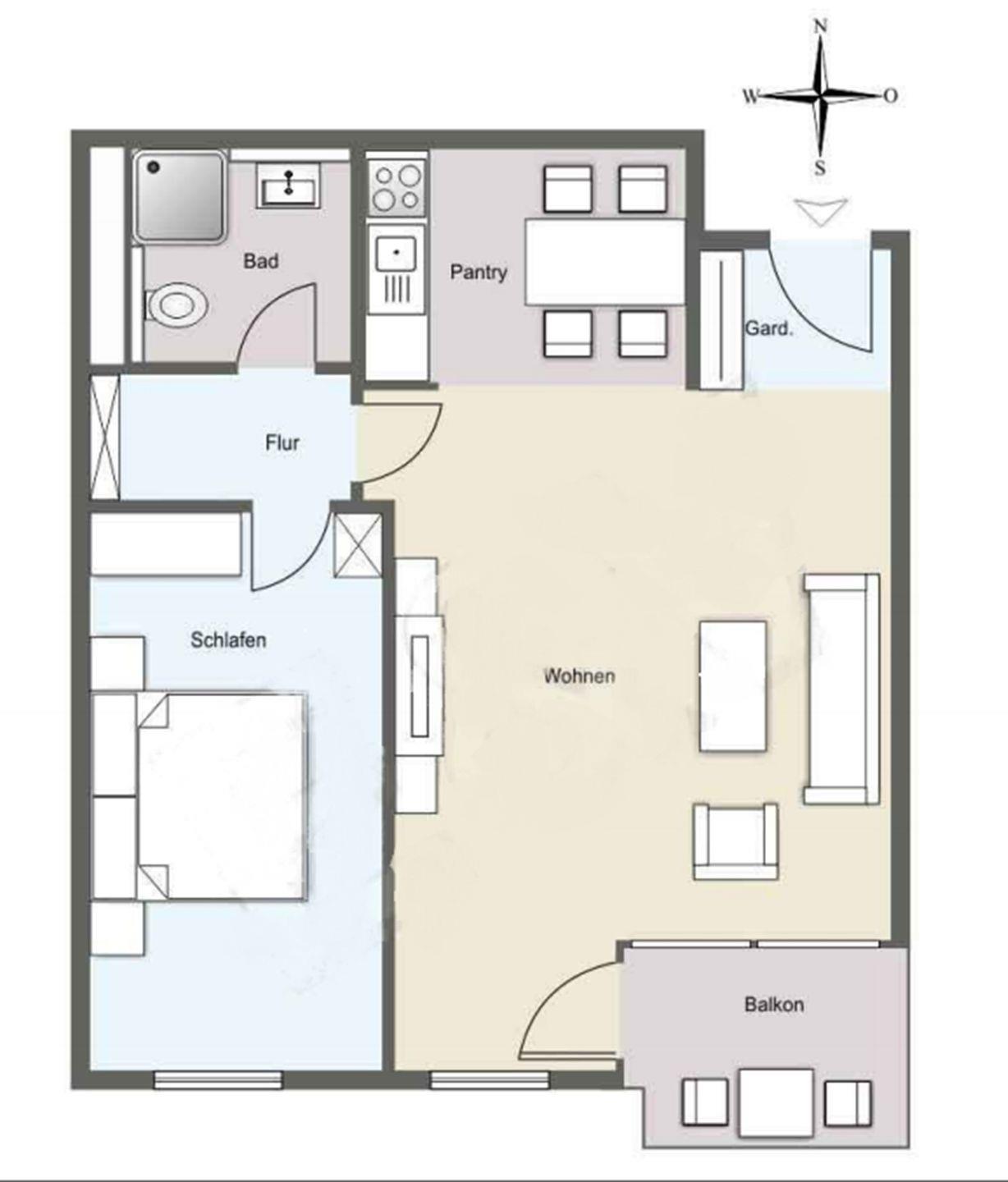 Das 2-Zimmer-Apartment (ca.56 qm inkl. Balkon) besteht aus einem offenen Wohnbereich mit integrierter Küche.