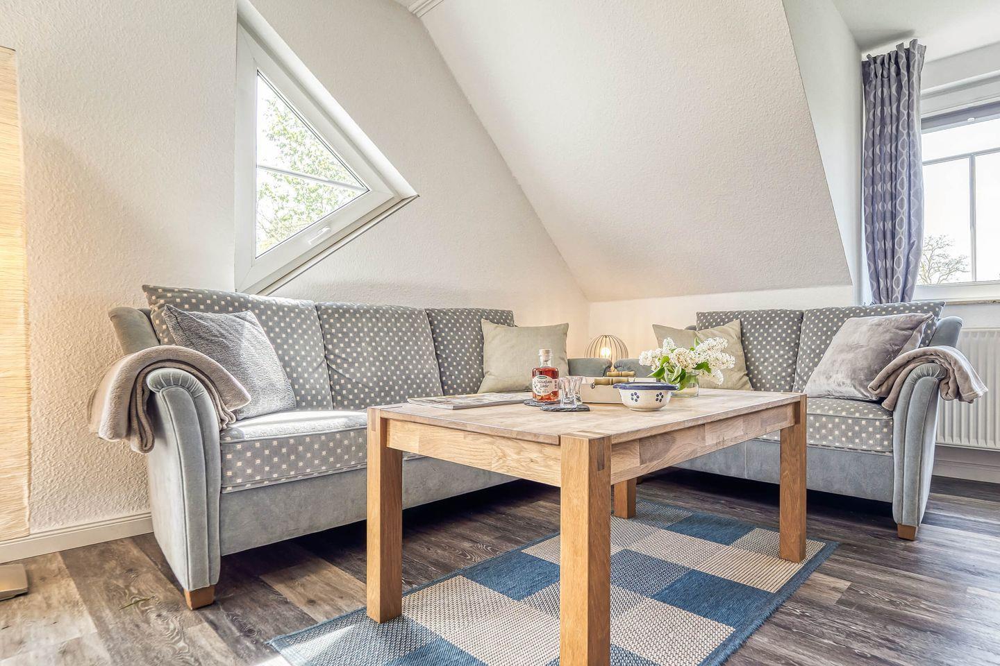 In ruhiger, zentraler Lage erwartet Sie diese gemütliche und liebevoll eingerichtete 55 qm große Maisonettewohnung mit West-Terrasse. Maximal 4 Erwachsene und ein Baby können in der Wohnung erholsame Urlaubstage verbringen. Über den Eingangsbereich mit Garderobe gelangen Sie in den hellen Wohnbereich, das Schlafzimmer mit einem großen Doppelbett und dem Gäste-WC. Über die geschwungene Treppe gelangen Sie in die zweite Etage. Dort befindet sich der zweite Schlafbereich mit Doppelbett und anliegendem Badezimmer. Das Tageslichtbad ist mit einer Dusche, einem Waschtisch mit Spiegelschrank und WC ausgestattet. Der lichtdurchflutete Wohnbereich unterteilt sich in die offene Küche, Essecke und einen großzügigen Sitzbereich, der zum Verweilen einlädt. Den Zugang zum ruhig gelegenen Balkon lädt zum Verweilen ein. Ein eigener PKW-Stellplatz direkt vor der Haustür, ein Schuppen zum Abstellen Ihrer mitgebrachten Fahrräder, Fliegengitter und kostenloses WLAN runden das Angebot ab. Eine weitere Annehmlichkeit sind der Bäcker, Metzger und Einkaufmarkt in unmittelbarer Nähe zur Wohnung.