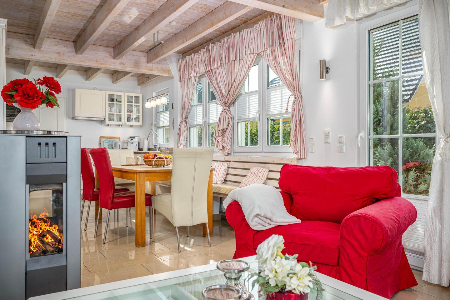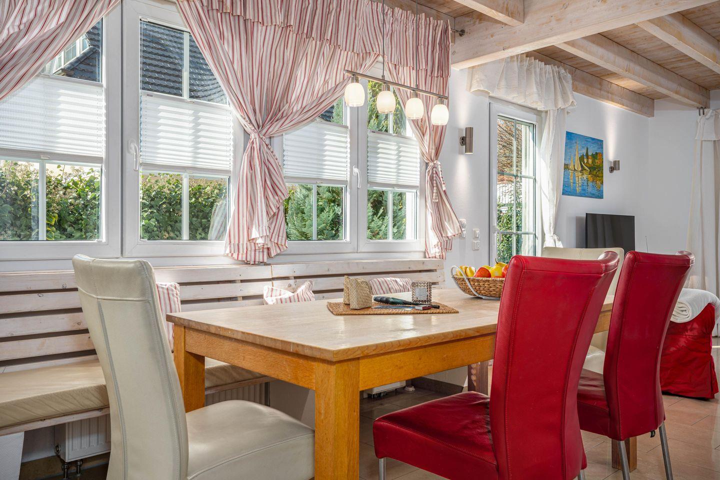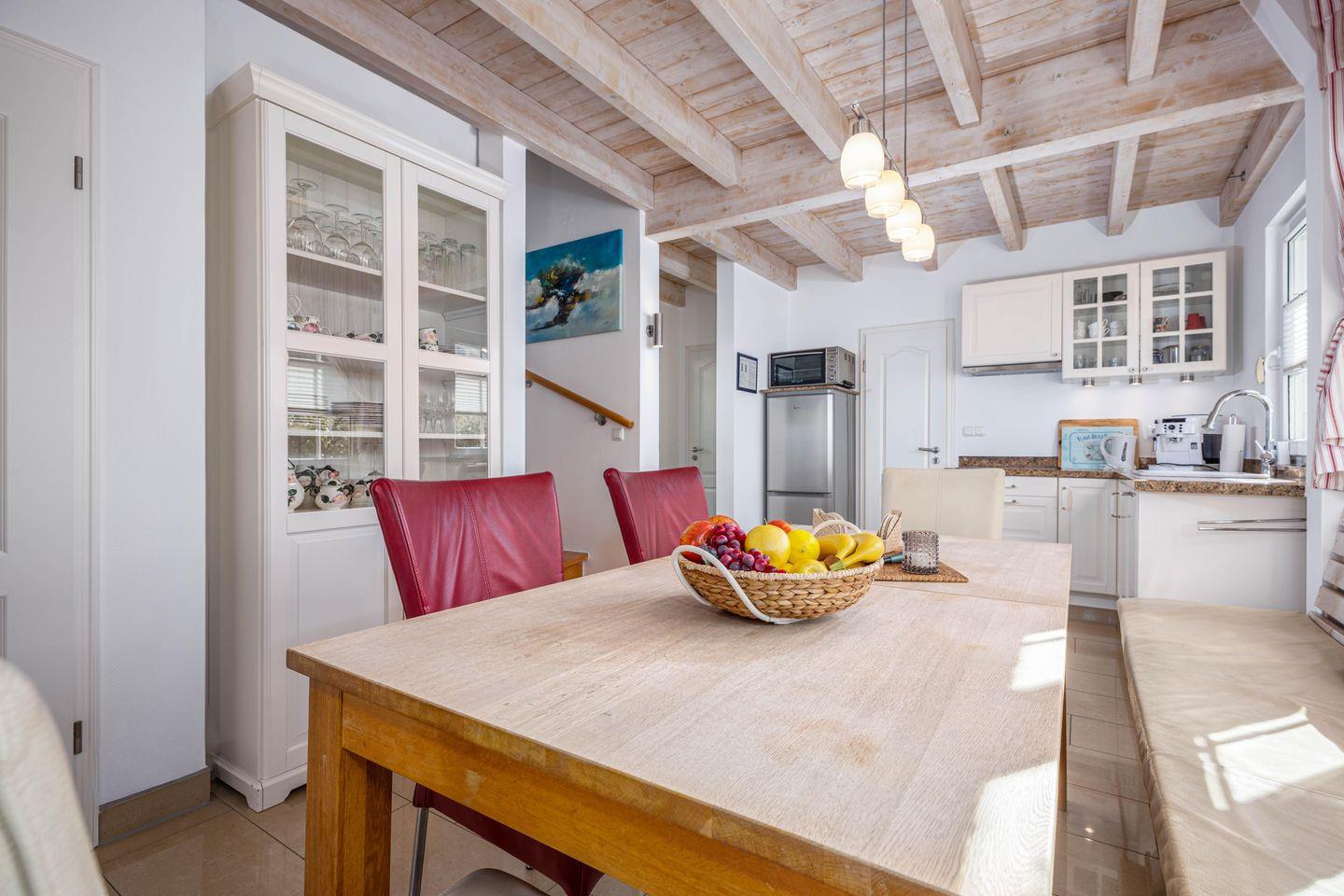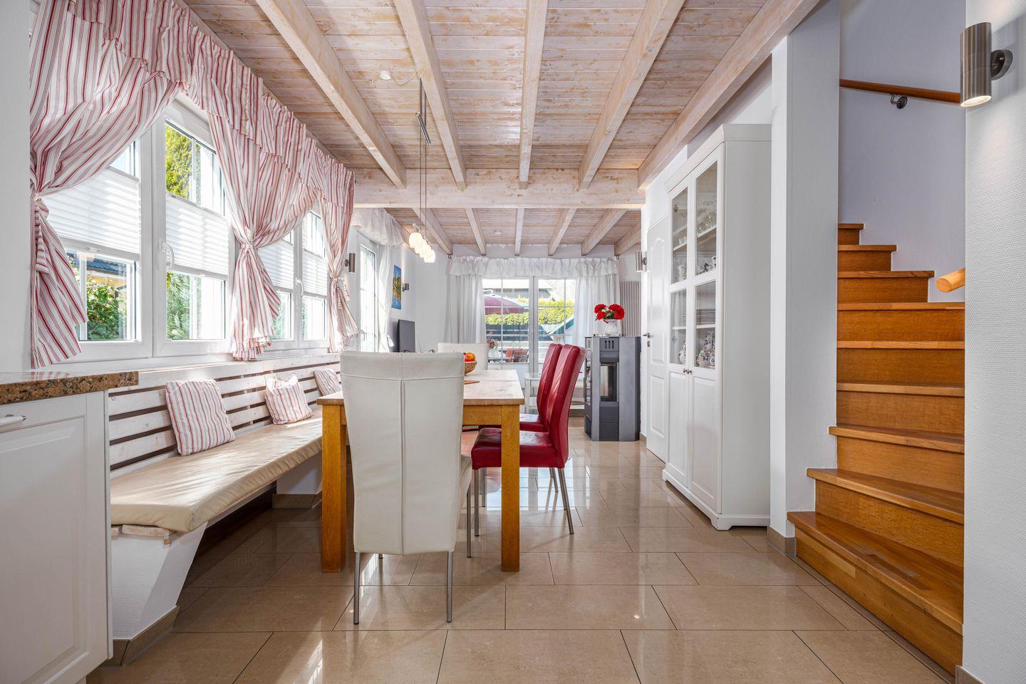Im Erdgeschoss haben Sie ein Gäste-WC, die Hobbyköche-Küche mit Spülmaschine, Kaffee/Espresso-Vollautomat von Krups, dahinter die Essgruppe mit Eichentisch und langer Sitzbank und weiter zum Garten hin den Wohnbereich mit Kuschelcouch, Sessel und Hocker.
