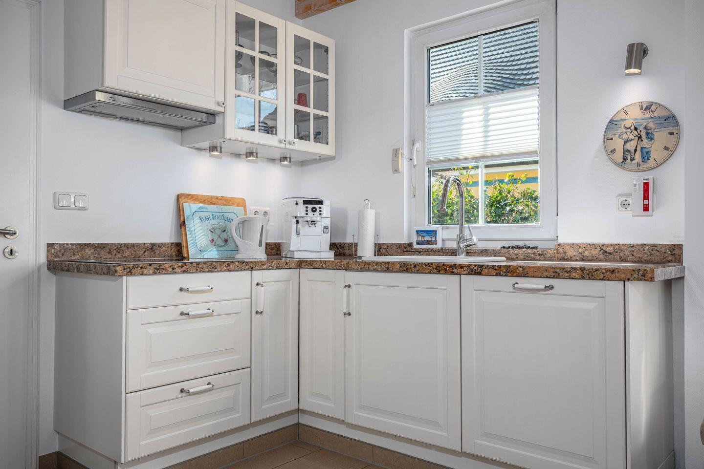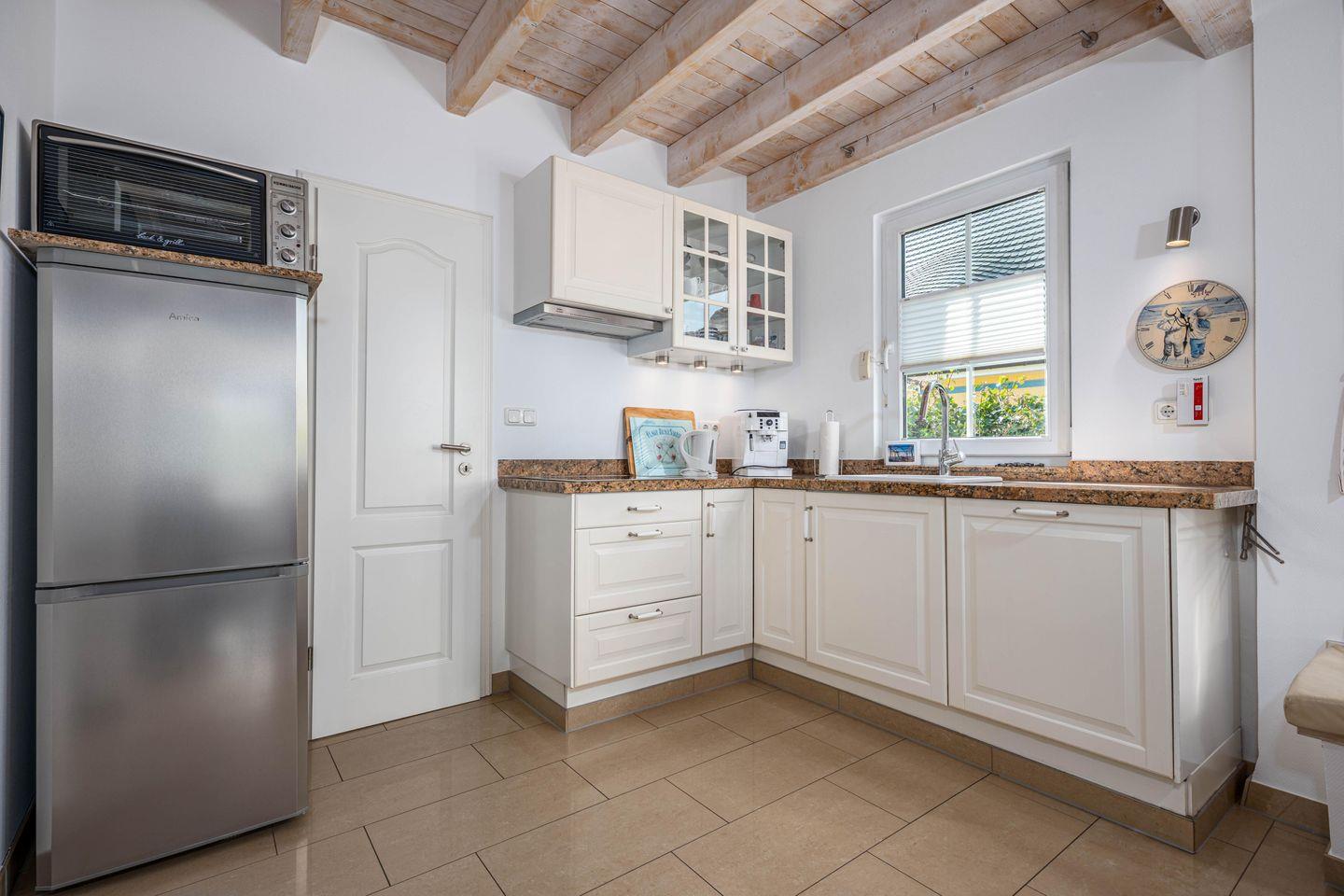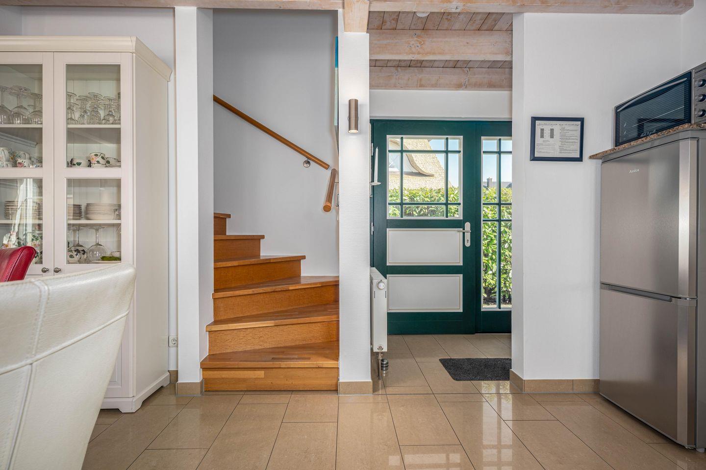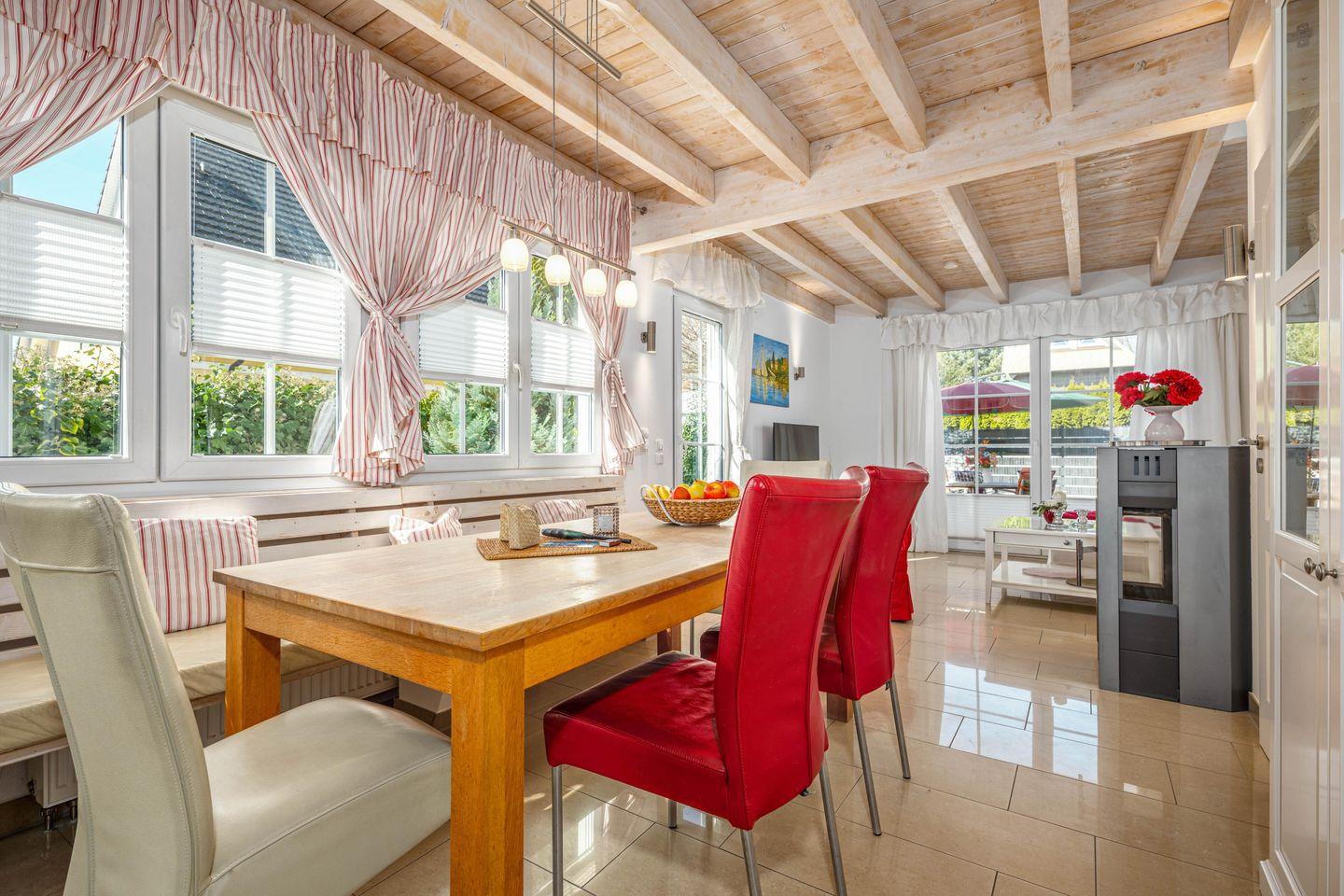 Im Erdgeschoss haben Sie ein Gäste-WC, die Hobbyköche-Küche mit Spülmaschine, Kaffee/Espresso-Vollautomat von Krups, dahinter die Essgruppe mit Eichentisch und langer Sitzbank und weiter zum Garten hin den Wohnbereich mit Kuschelcouch, Sessel und Hocker.