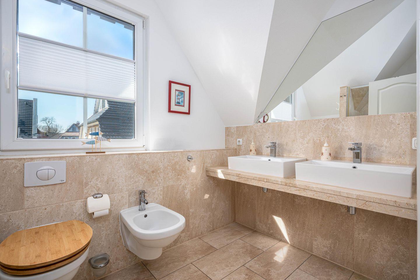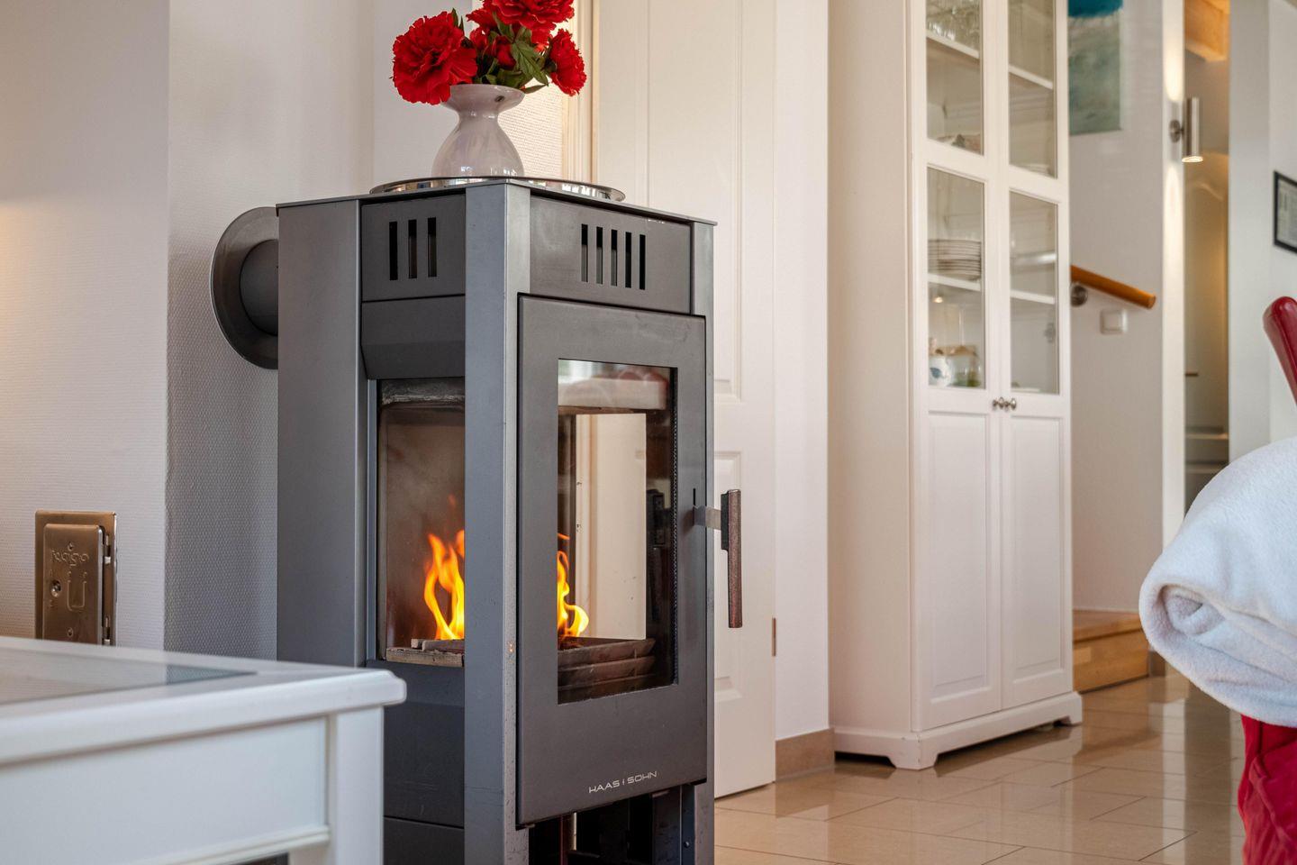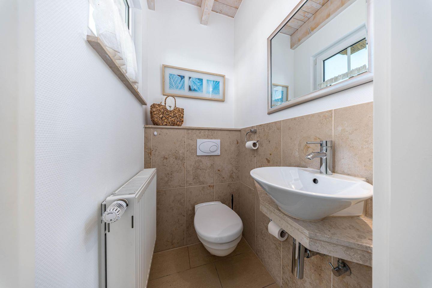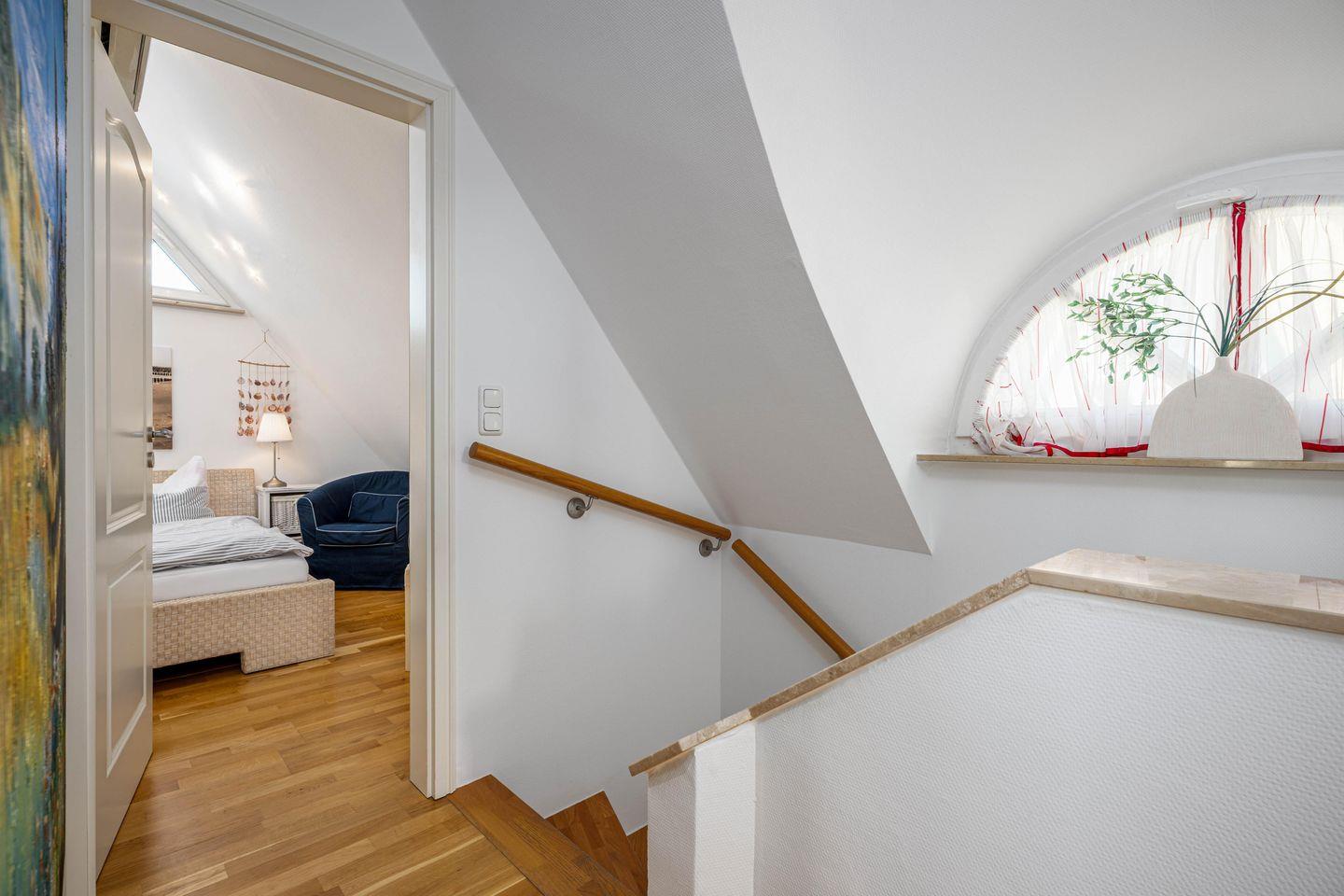 Im Erdgeschoss haben Sie ein Gäste-WC, die Hobbyköche-Küche mit Spülmaschine, Kaffee/Espresso-Vollautomat von Krups, dahinter die Essgruppe mit Eichentisch und langer Sitzbank und weiter zum Garten hin den Wohnbereich mit Kuschelcouch, Sessel und Hocker.