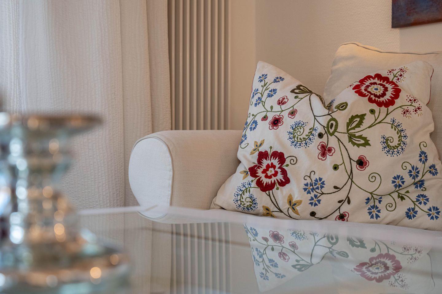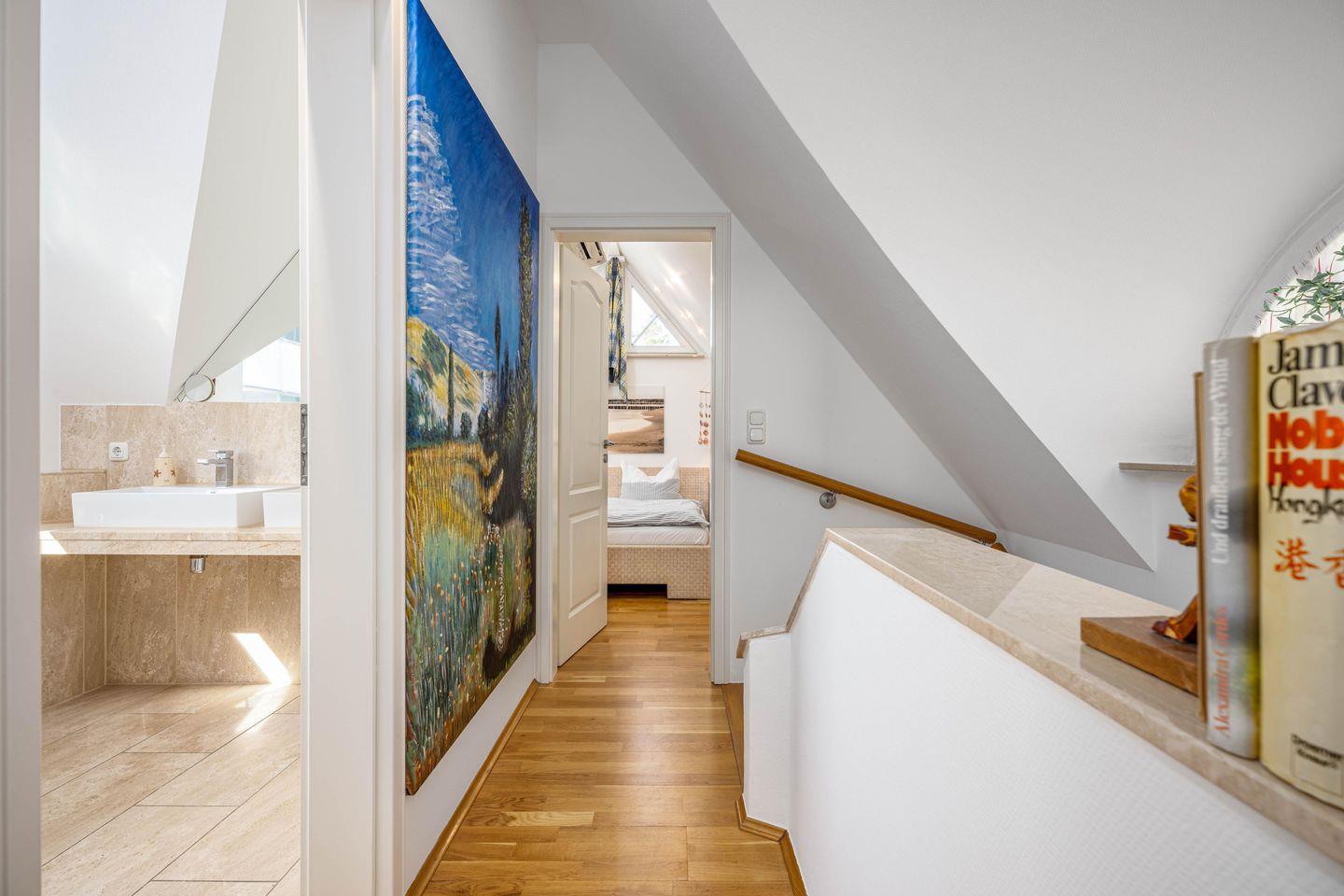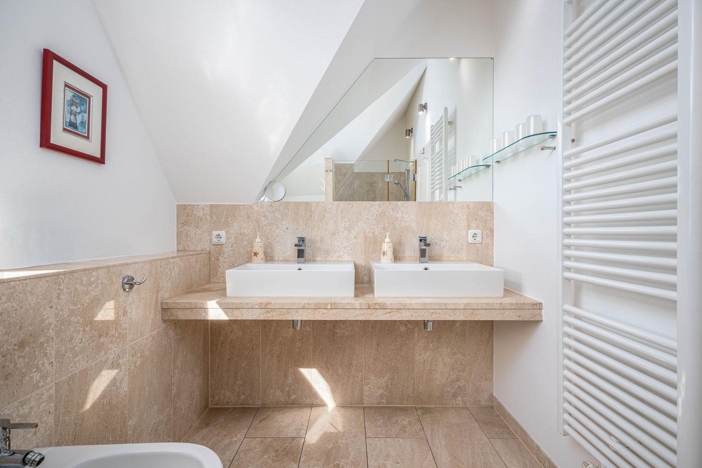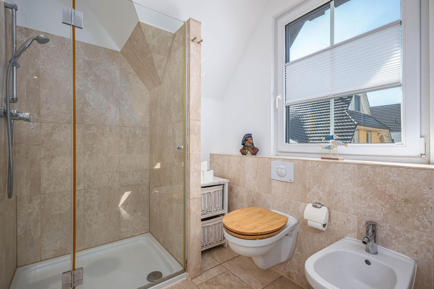 Im Erdgeschoss haben Sie ein Gäste-WC, die Hobbyköche-Küche mit Spülmaschine, Kaffee/Espresso-Vollautomat von Krups, dahinter die Essgruppe mit Eichentisch und langer Sitzbank und weiter zum Garten hin den Wohnbereich mit Kuschelcouch, Sessel und Hocker.
