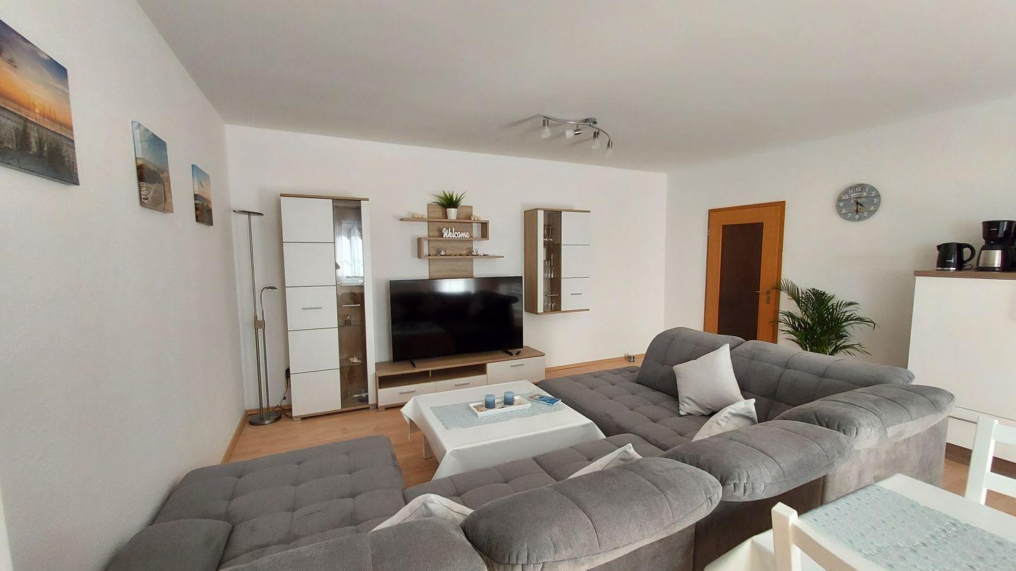 Die großzügig geschnittene Ferienwohnung eignet sich für bis zu vier Personen und ist besonders bei Familien, Paaren und Aktivurlaubern beliebt. Das separate Schlafzimmer mit hochwertigem Laminatboden bietet Platz für geruhsame Nächte, während die bequeme Schlafcouch im Wohnzimmer die Schlafmöglichkeiten ergänzt. Das offene Wohnkonzept verbindet das Wohnzimmer mit einer modern ausgestatteten Küche, welche mit Cerankochfeld, Elektrobackofen, Kühlschrank mit Gefrierfach, Mikrowelle, Spülmaschine, Kaffeemaschine, Toaster und Wasserkocher sowie umfangreichen Küchenutensilien und Geschirr ausgerüstet ist. Ein Esstisch für gemeinsame Mahlzeiten sowie eine gemütliche Sofaecke stehen zur Verfügung.