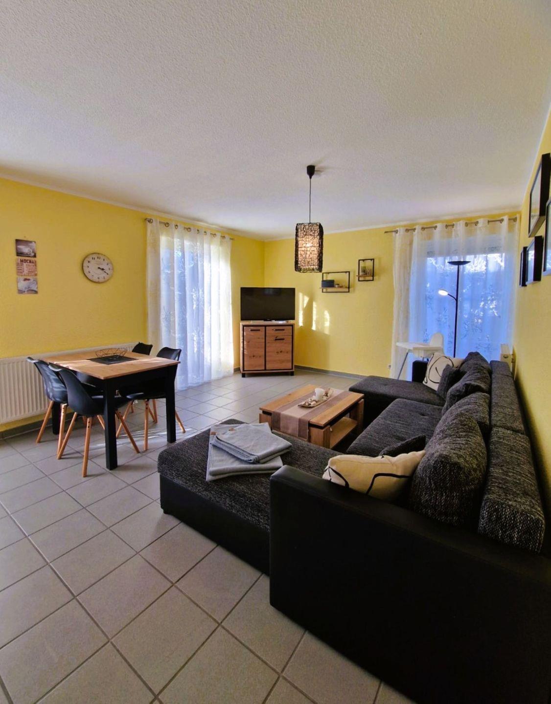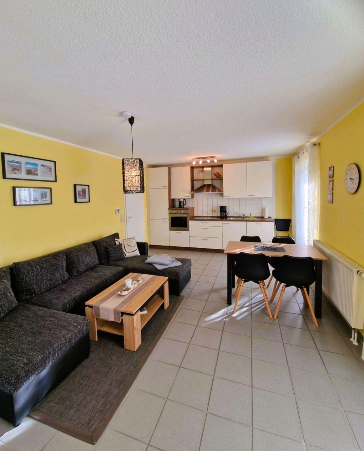 Im offenen Wohnbereich erwartet Sie eine gemütliche Sofaecke, die zum Entspannen einlädt. Der moderne Essbereich ist mit einem Esstisch ausgestattet und bietet ausreichend Platz für gemeinsame Mahlzeiten. Die integrierte Küche ist zeitgemäß eingerichtet: Ein Ceranherd, Backofen (elektrisch betrieben), Kühlschrank mit Gefrierfach, Spülmaschine, Wasserkocher, Kaffeemaschine und Toaster stehen Ihnen zur Verfügung. Damit eignet sich die Unterkunft bestens für Selbstversorger, die auch im Urlaub Wert auf Komfort und Funktionalität legen.
