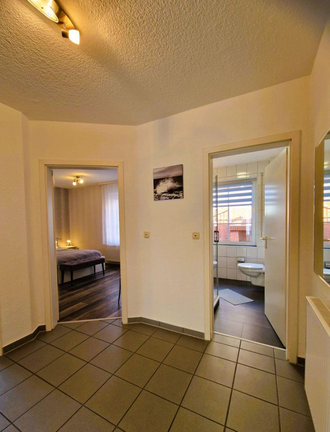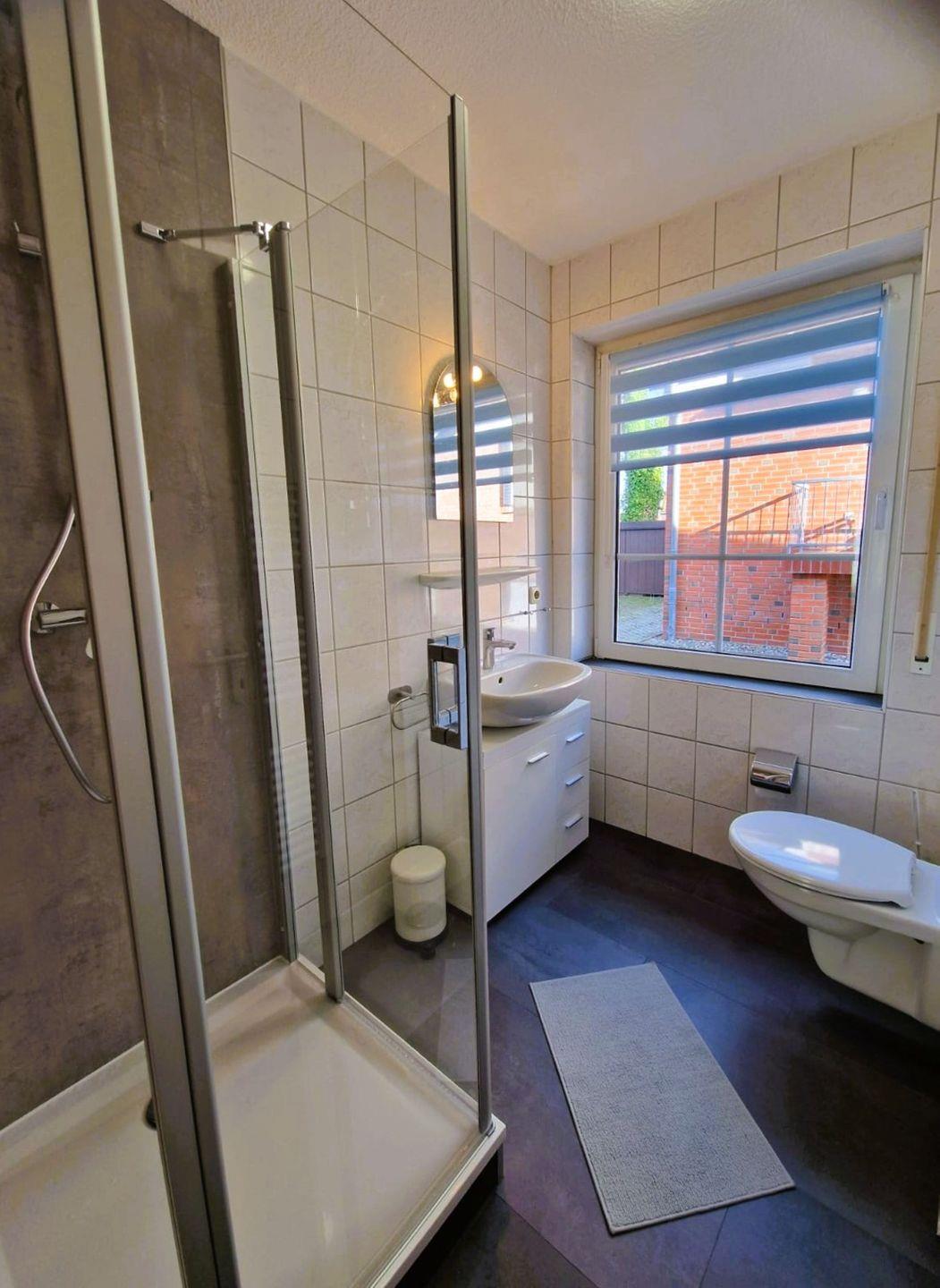 Das Badezimmer ist mit einer Dusche (mit Wanneneinsatz), Waschbecken, Spiegel, WC und Haartrockner ausgestattet. Warmes Wasser steht selbstverständlich zur Verfügung. Die zentrale Beheizung sorgt auch in den kühleren Jahreszeiten für ein angenehmes Raumklima.