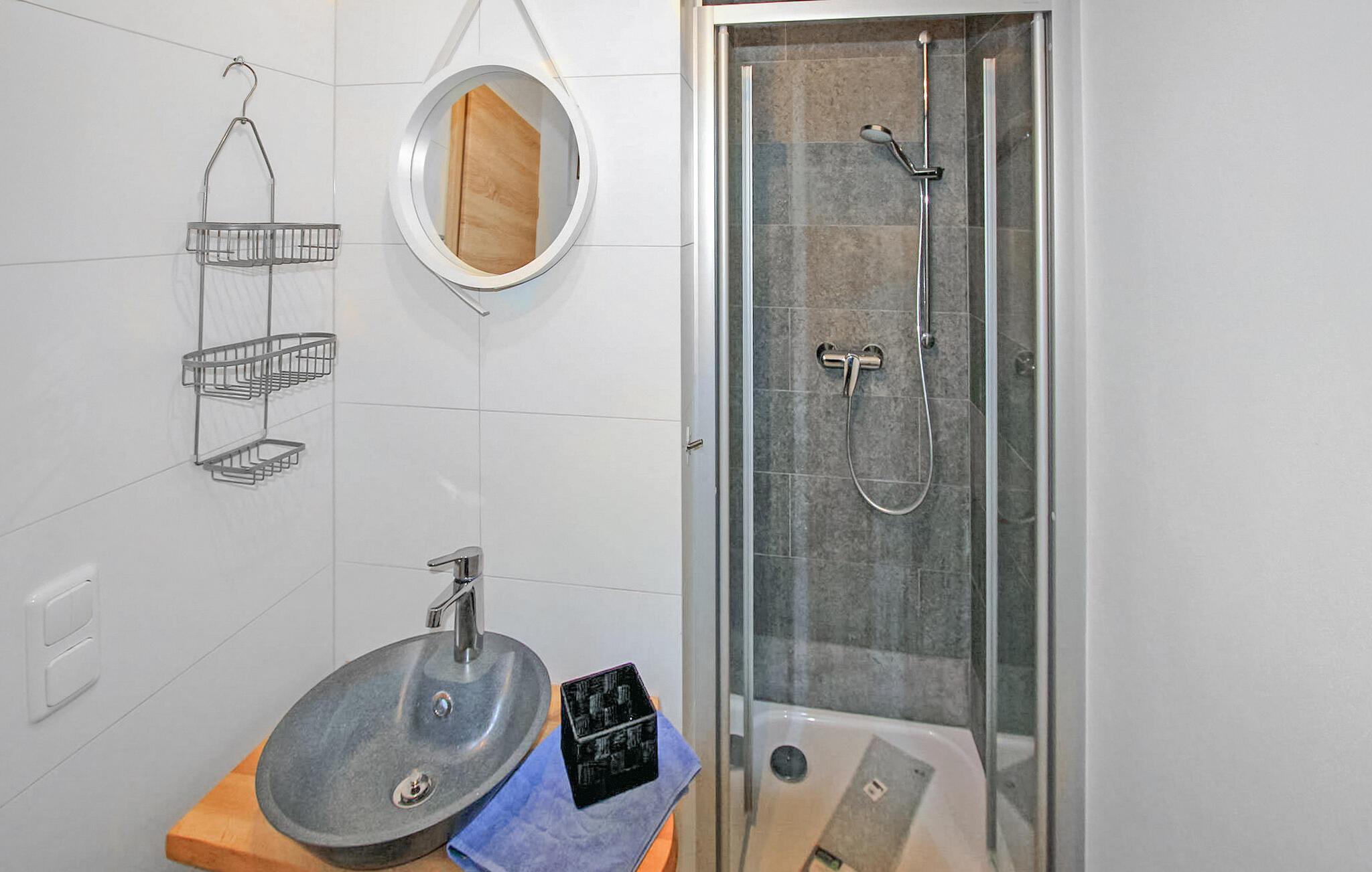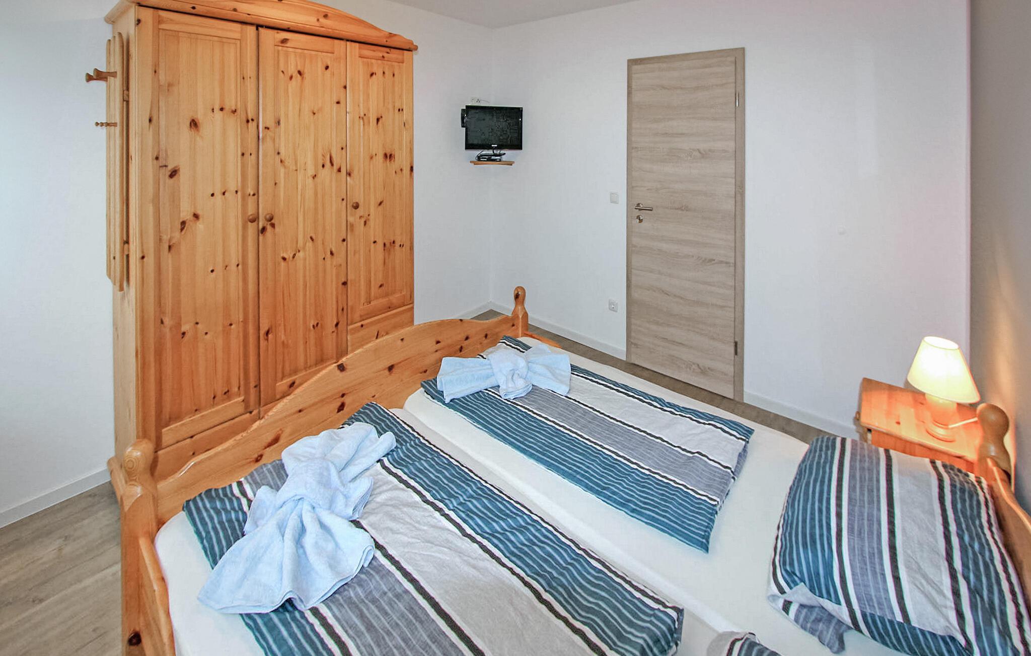 Diese Ferienhaus für 2 Erwachsene und 2 Kinder ist ausgestattet mit einem Wohnraum (Polstermöbel, Flachbild-TV, Radio, Esstisch), einem Schlafraum (Doppelbett, TV), einem Kinderschlafraum (Etagenbett, TV), einer Küchenzeile (E-Kochfeld, Kühlschrank mit Tiefkühlteil, div. Küchengeräte) sowie einem kleinen Bad mit DU/WC.