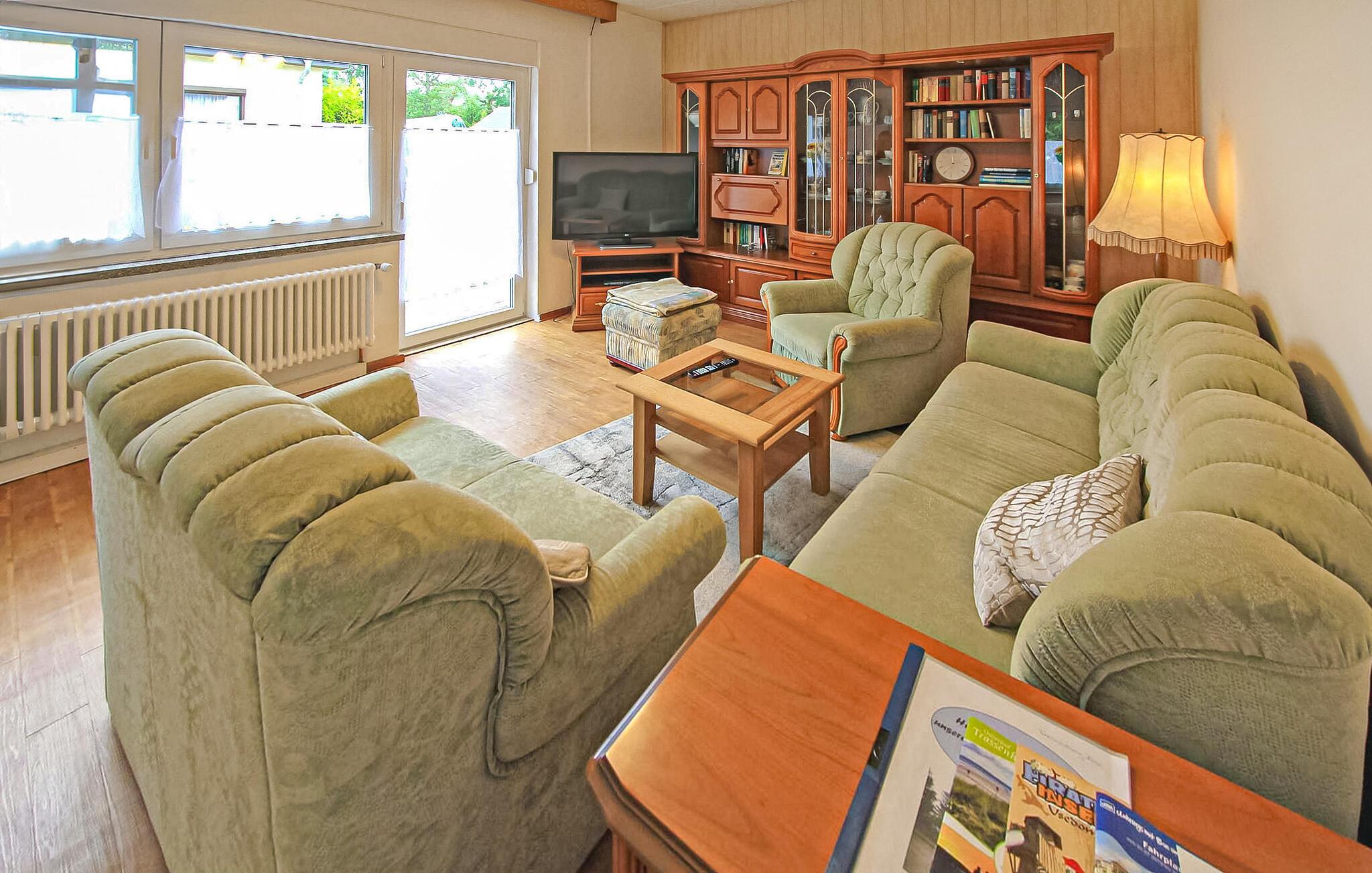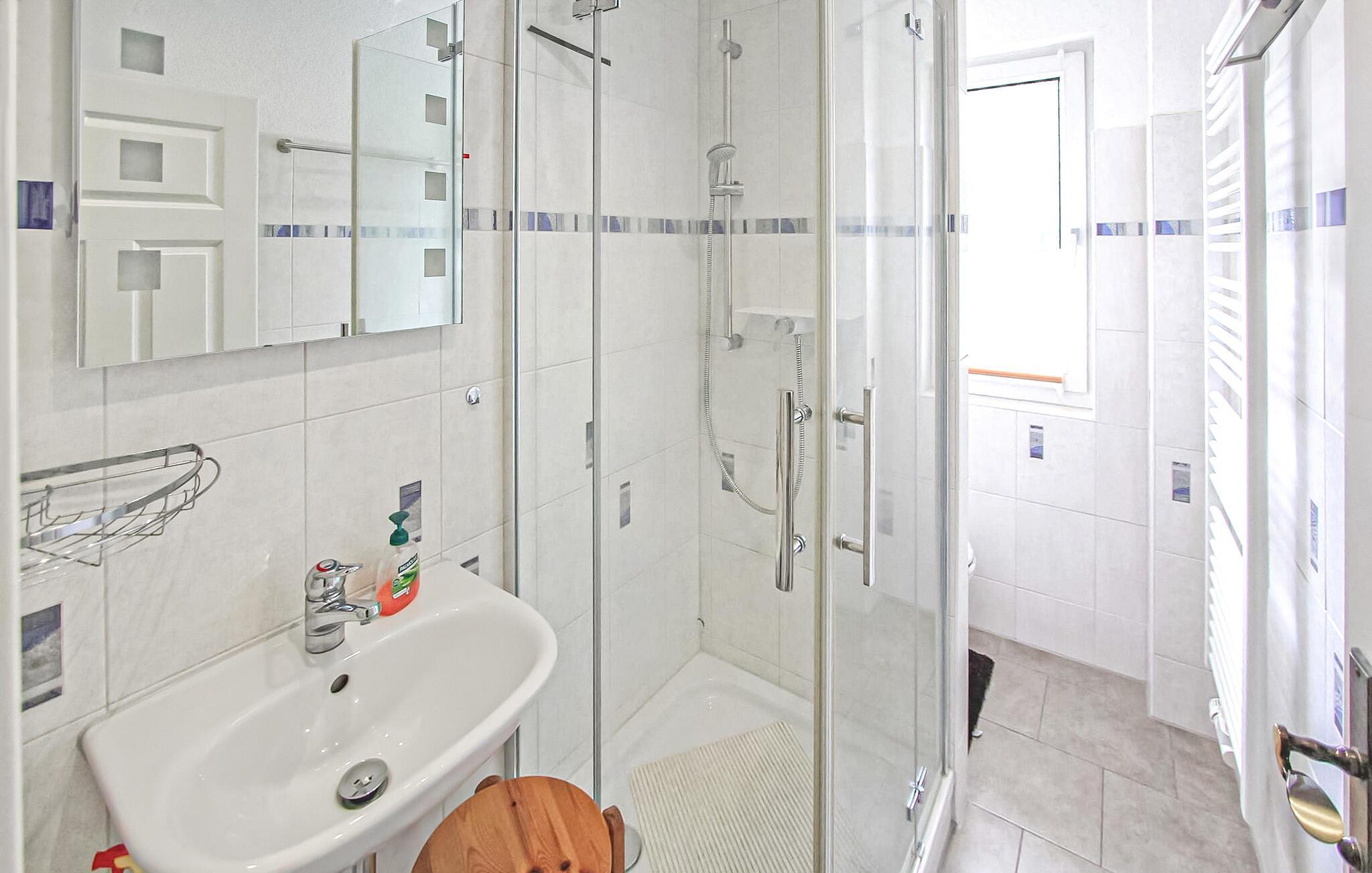 Die Ferienwohnung befindet sich im Hoch-Parterre. Sie ist ausgestattet mit einem Wohnraum (Polstermöbel mit Schlaffunktion als Aufbettung für die 7. Pers., Flachbild-TV), 3 Schlafräumen (1 x Doppelbett, 2 x 2 Einzelbetten), einer separaten Küche (E-Herd mit Backofen, Kühlschrank mit Tiefkühlteil, Spülmaschine, Mikrowelle, div. Küchengeräte), einem Esszimmer (Esstisch, TV, Radio, Durchreiche zur Küche) sowie einem kleinen Bad mit DU/WC. Zur Verfügung steht eine Terrass/Balkon mit Sitzmöbeln und Hollywoodschaukel.