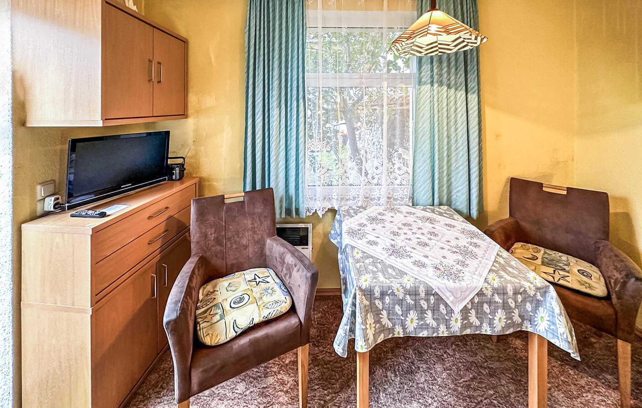 Das ca. 16 qm kleine Ferienzimmer für max. 2 Personen befindet sich im Erdgeschoss eines Wohn-Nebengebäudes auf dem 940 qm großen Wohngrundstück des Eigentümers innerhalb einer ruhigen Wohnsiedlung in zentraler Ortslage. Der Ostseestrand ist etwa 800 m, Restaurants, Cafés und Einkaufsmöglichkeiten liegen im Umkreis von 500 m.Es ist ausgestattet mit einem kombinierten Wohn-/Schlafraum (2 Polsterliegen, Flachbild-TV, Radio/CD, Essecke), einer Kochecke (E-Kochfeld, Kühlschrank mit Tiefkühlfach, div. Küchengeräte) sowie mit einem Bad mit DU/WC. Beheizt wird die Wohnung mit einer Elektroheizung. Zur Verfügung stehen eine möblierte Sitzecke im Freien mit Grillmöglichkeit sowie Parkplatz. Im Gesamtpreis enthalten sind die Endreinigung sowie der Wasser- und Stromverbrauch. Bettwäsche und Handtücher können wahlweise mitgebracht oder gemietet werden. Haustiere sind nicht gestattet. Das Ostseebad Zinnowitz ist ein staatlich anerkannter Kurort und somit kurabgabepflichtig (zahlbar vor Ort).