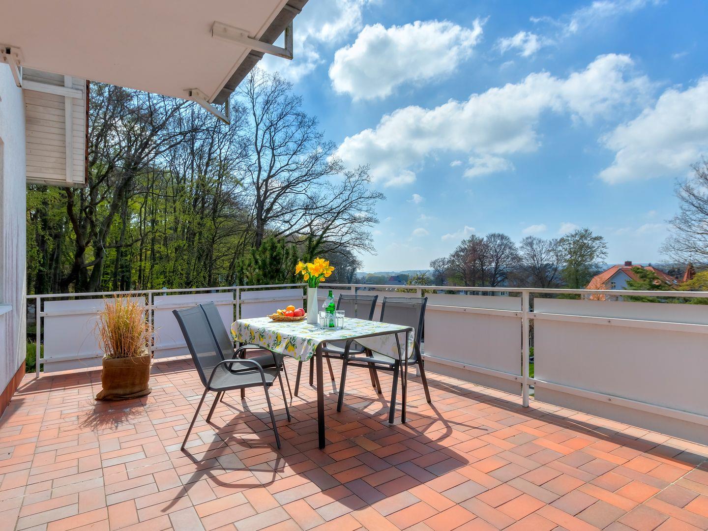 Unsere 60 qm große 2-Zimmer-Wohnung vereint durchdachtes Design mit einer behaglichen Atmosphäre. Das helle Wohnzimmer öffnet sich zu einer sonnigen Terrasse mit Gartenmöbeln, auf der Sie die frische Meeresluft genießen und zur Ruhe kommen können. Die voll ausgestattete Küche ermöglicht Ihnen eine flexible und unkomplizierte Selbstversorgung.