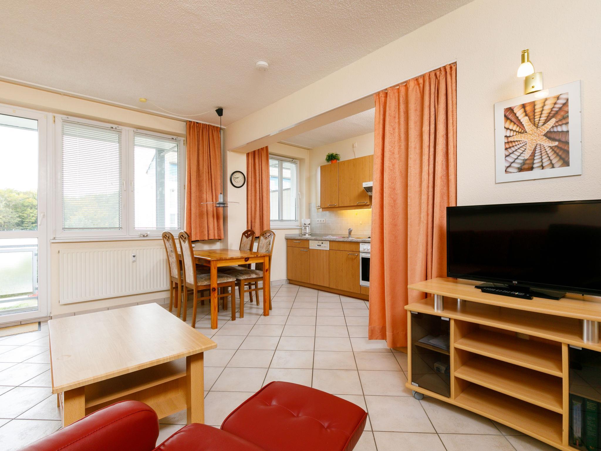 "Zur Düne I", 2-Zimmer-Wohnung 52 m2 im 2. Stock. Objekt geeignet für 2 Erwachsene + 2 Kinder. Wohn-/Esszimmer mit 1 Doppeldiwanbett (160 cm, Länge 150 cm), Kabel-TV (Flachbildschirm). Ausgang zum Balkon. 1 Zimmer mit 1 Doppelbett. Kochnische (Geschirrspüler, 4 Glaskeramikplatten, Toaster, Wasserkocher, Mikrowelle, elektrische Kaffeemaschine). Bad/WC. Balkon. Balkonmöbel. Zur Verfügung: Kinderhochstuhl, Babybett. Internet (Wireless LAN, gratis). Parkplatz (1 Auto) beim Haus. Bitte beachten: Nichtraucher-Unterkunft. Rauchmelder.
