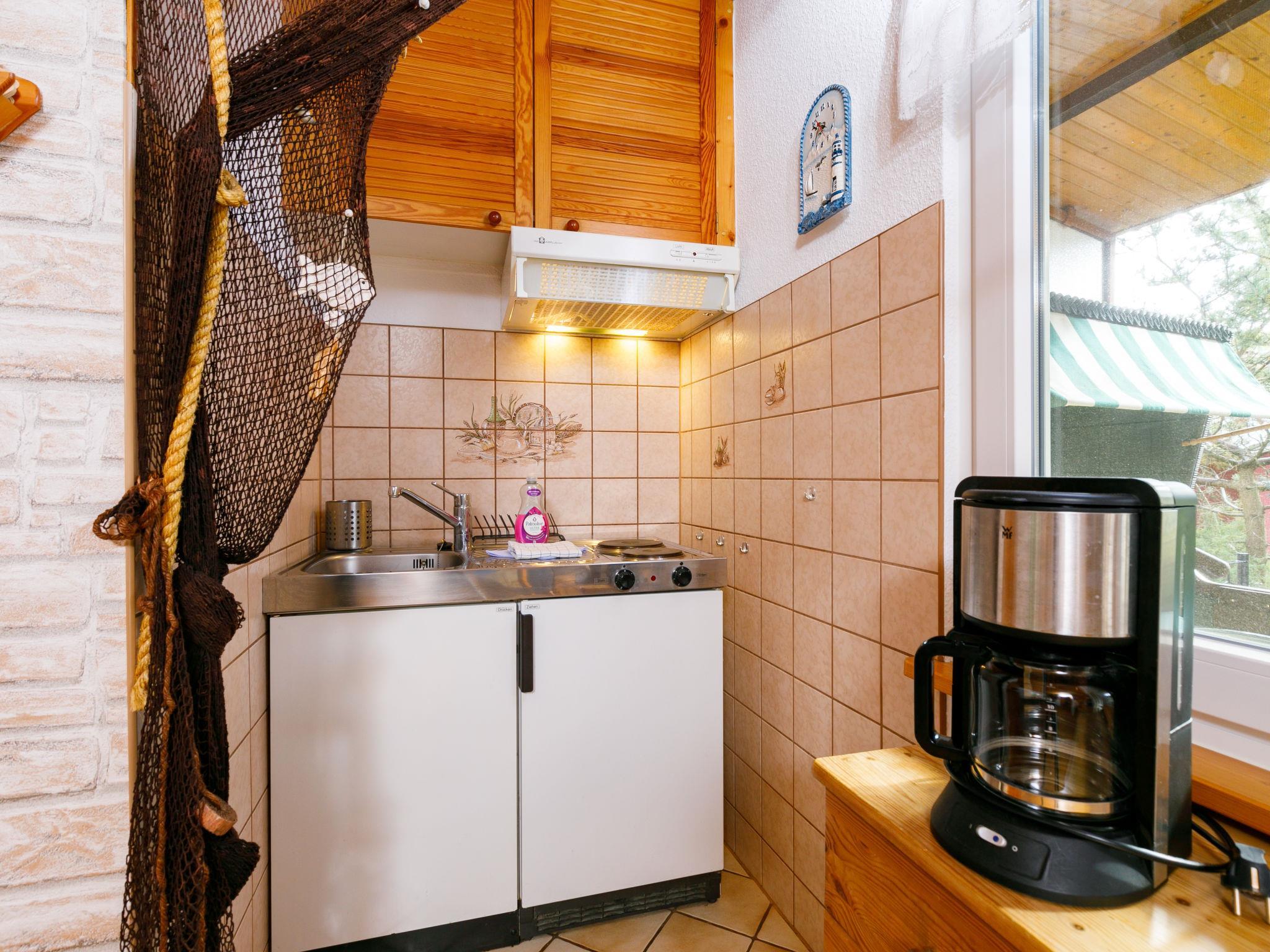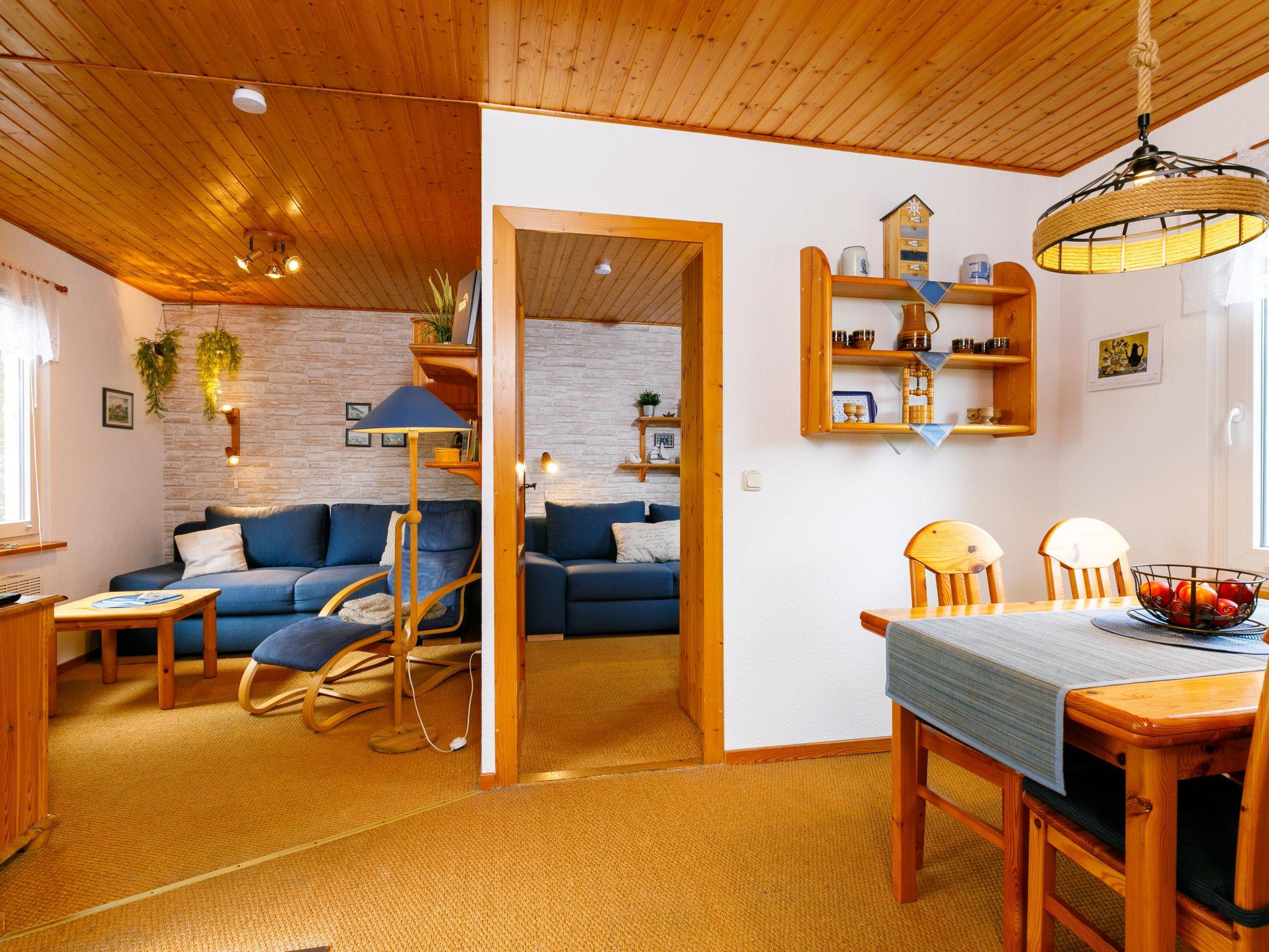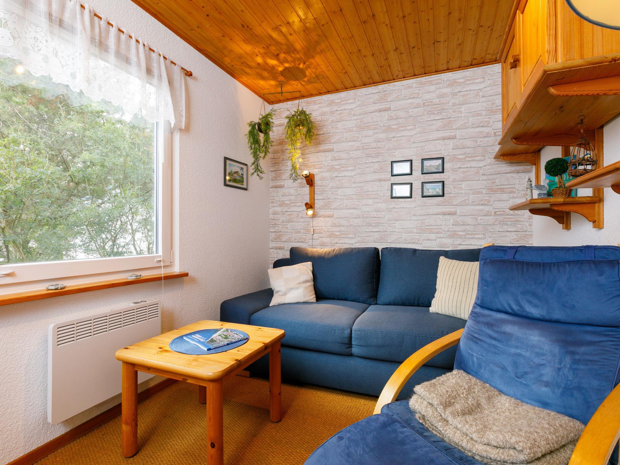 2-Zimmer-Doppelhaushälfte 40 m2, im Erdgeschoss. Gemütlich und mit viel Holz eingerichtet: Wohn-/Esszimmer mit 1 Diwanbett und Kabel-TV (Flachbildschirm). Ausgang zur Terrasse. 1 Zimmer mit 1 Diwanbett und 1 Doppelbett. Kleine Kochnische (2 Kochplatten, Toaster, Wasserkocher, elektrische Kaffeemaschine). Dusche/WC. E-Heizung. Terrasse. Terrassenmöbel. Zur Verfügung: Kinderhochstuhl, Babybett. Bitte beachten: Nichtraucher-Haus. Rauchmelder.