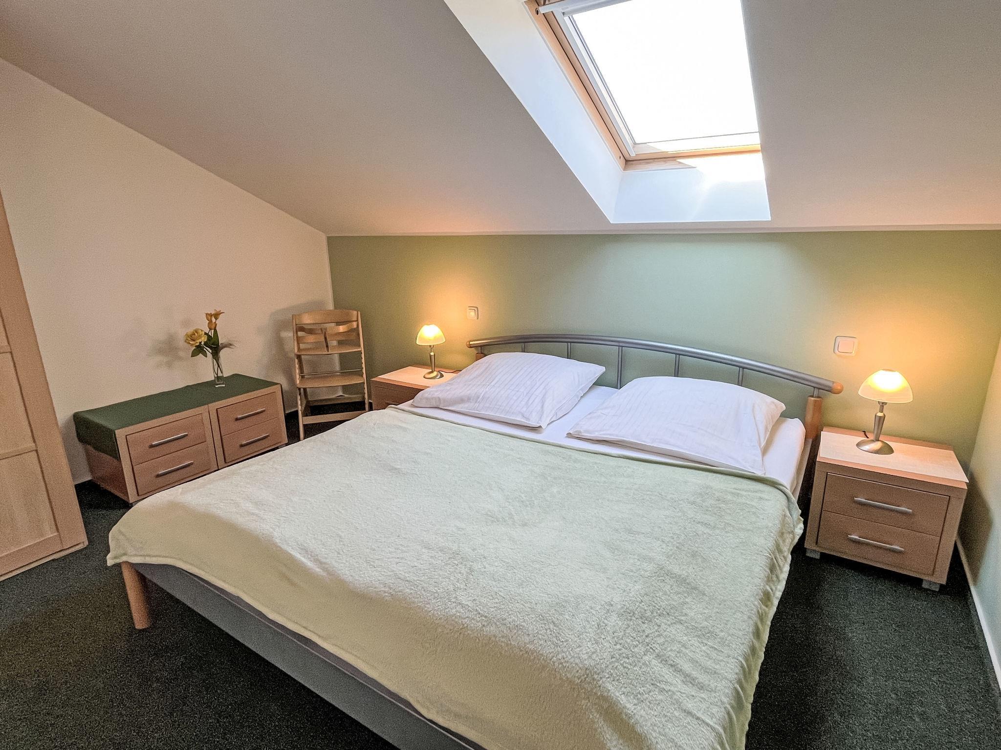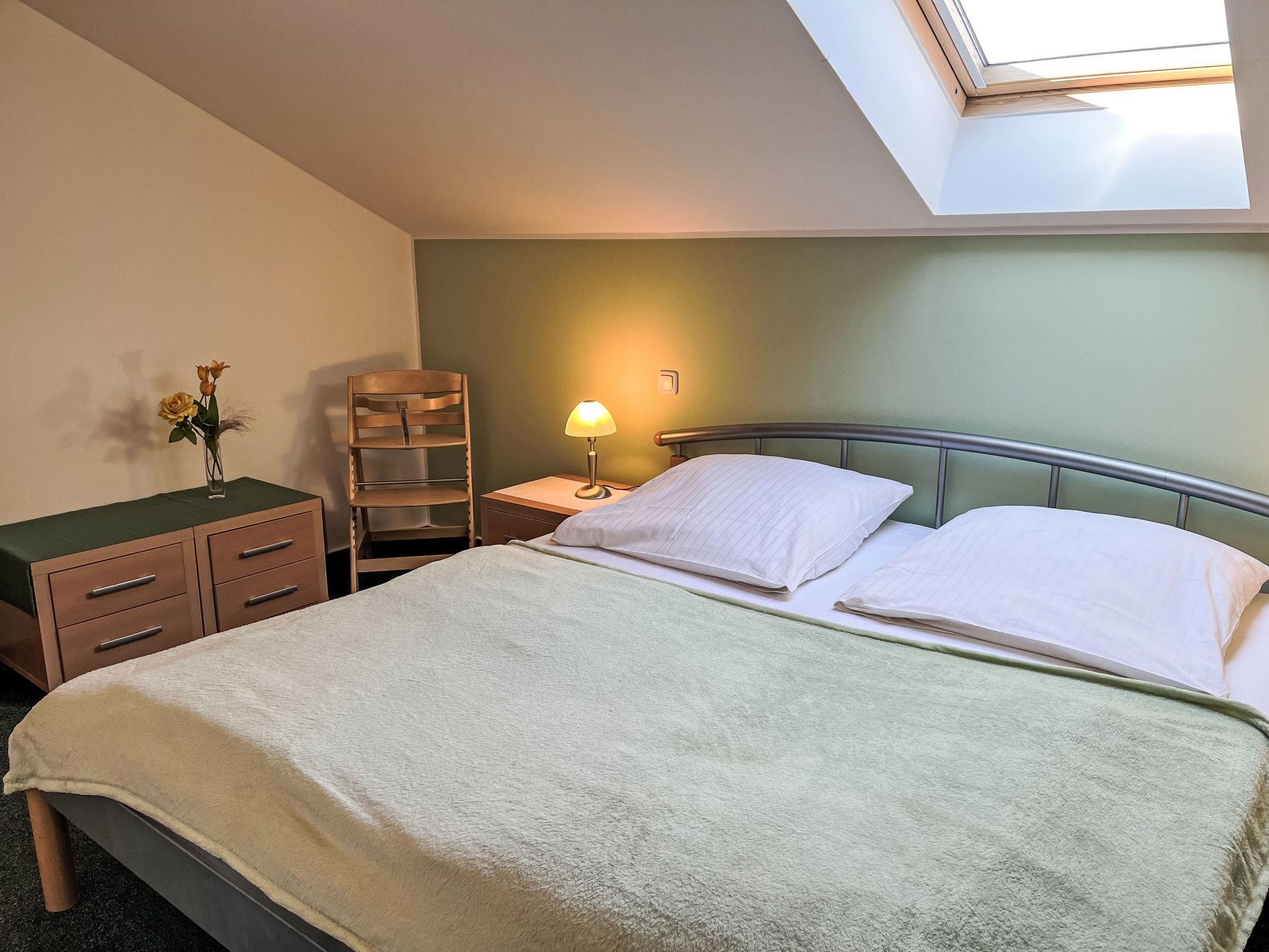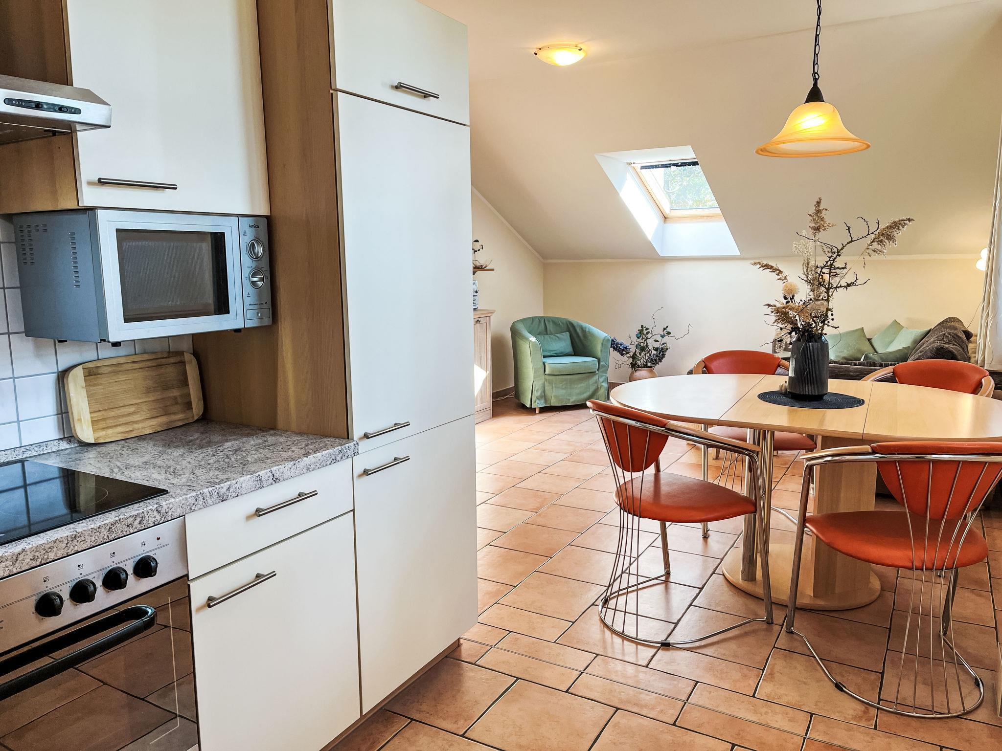"Zaunkönig", 2-Zimmer-Wohnung 50 m2, im Dachgeschoss. Abgeschrägt, gemütlich eingerichtet: Wohn-/Esszimmer mit 1 Doppeldiwanbett und Kabel-TV (Flachbildschirm), Radio. 1 Zimmer mit 1 Doppelbett. Kochnische (Geschirrspüler, 4 Glaskeramikplatten, Toaster, Wasserkocher, Mikrowelle, elektrische Kaffeemaschine). Dusche/WC. Zur Verfügung: Kinderhochstuhl, Babybett. Parkplatz (1 Auto) beim Haus. Bitte beachten: Nichtraucher-Unterkunft. Rauchmelder.