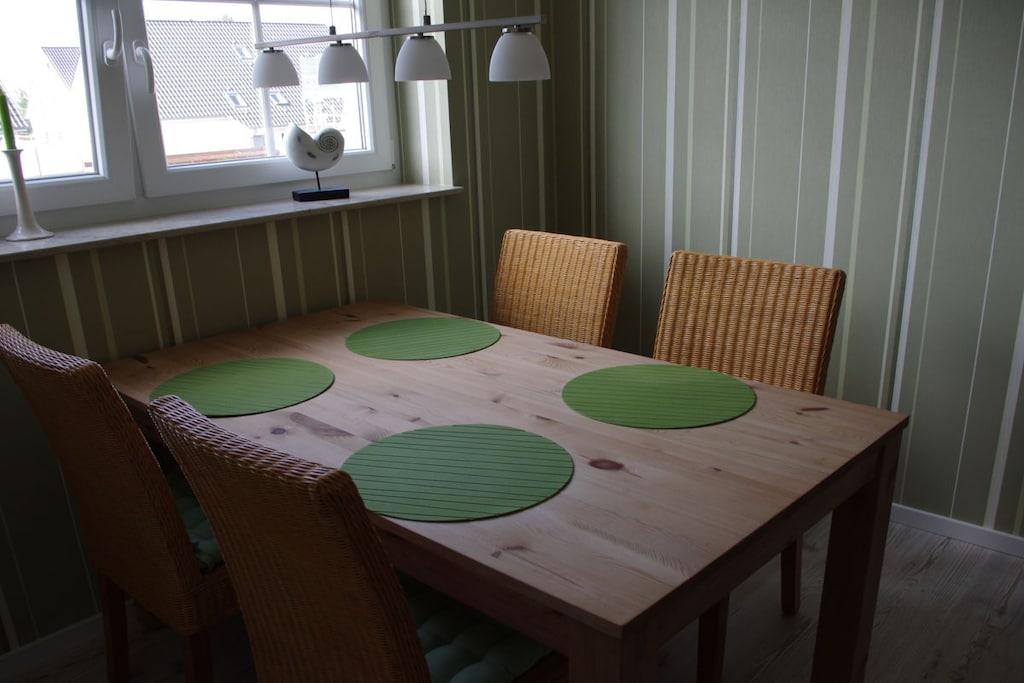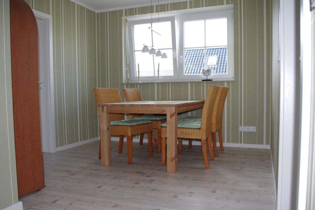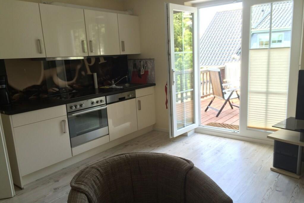 Unsere Ferienwohnung bietet Ihnen alles für einen wunderschönen Urlaub Die komfortable Wohnküche ist ausgestattet mit einer großen Schlafcouch,einem Tisch und 2 gemütlichen Sesseln. Ein grosser Flatbildschirm ist vorhanden. In der Küche lässt die Ausstattung keine Wünsche offen. Backofen, Geschirrspüler und ein Kühlschrank mit Gefrierfach sind vorhanden. In der Diele steht ein Eßtisch mit 4 Korbstühlen und eine Vitrine mit schönem Geschirr. Das Schlafzimmer bietet Ihnen hervorragenden Schlafcomfort. Auf die Qualität der Lattenroste und Matratzen haben wir besondere Sorgfalt gelegt. Auch im Urlaub möchte man gut schlafen !!! Das Bad wurde mit Liebe zum Details ausgestattet. Eine Badewanne und eine ebenerdige Dusche sind vorhanden.