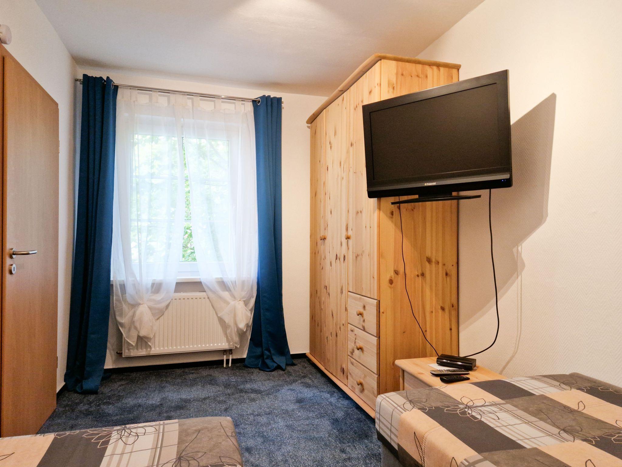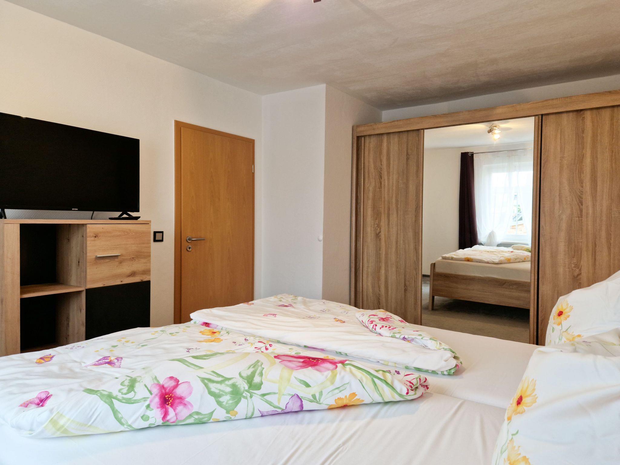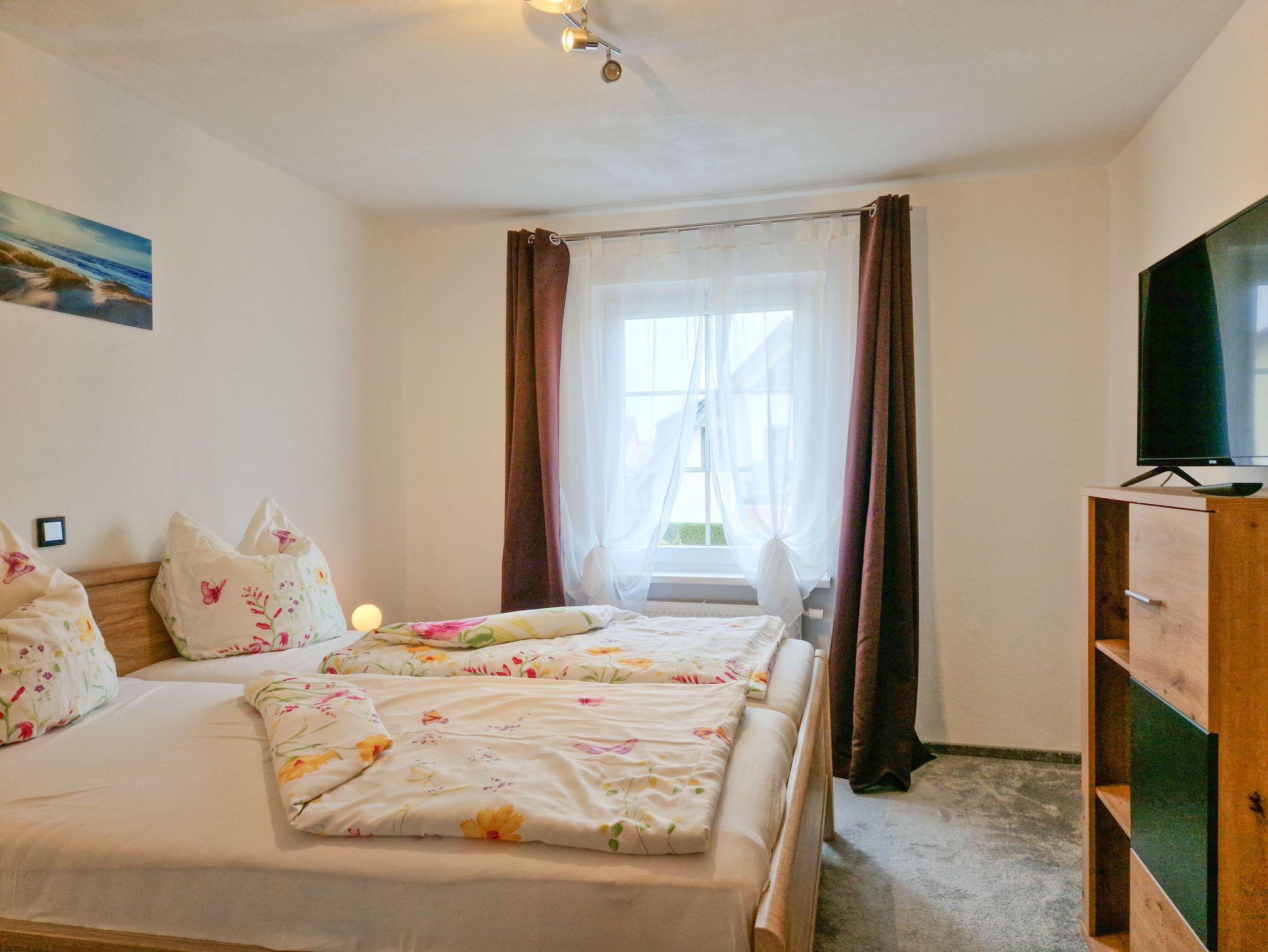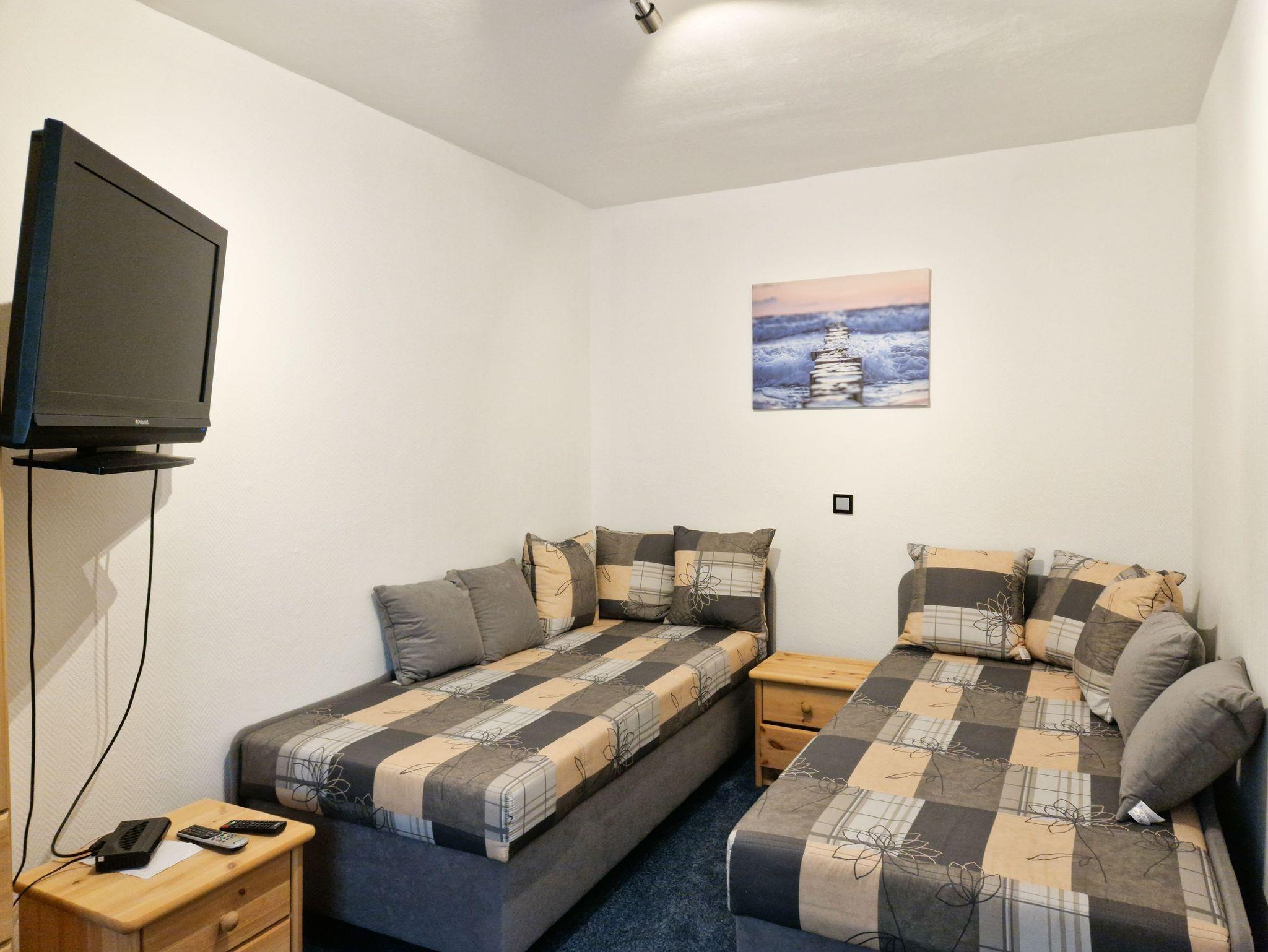 Die Wohnung bietet zwei liebevoll eingerichtete Schlafzimmer: eines mit einem bequemen Doppelbett und das andere mit zwei gemütlichen Einzelbetten - perfekt für Freunde oder Familienmitglieder, die gemeinsam entspannen möchten.